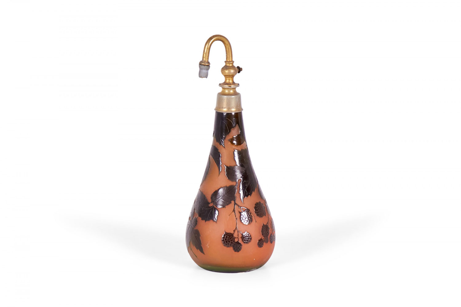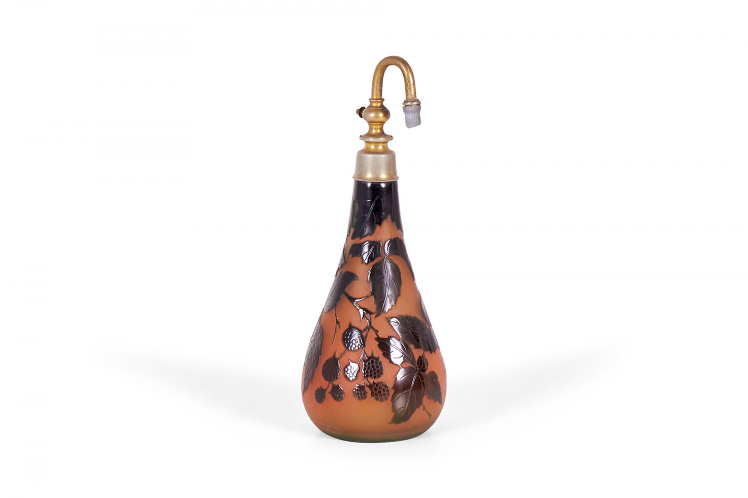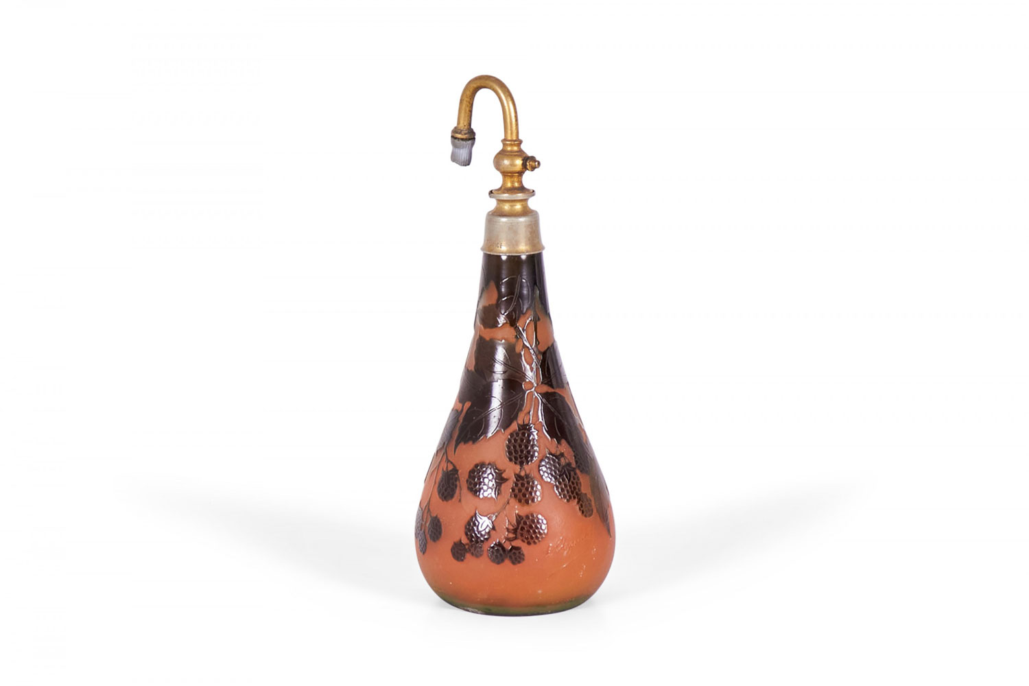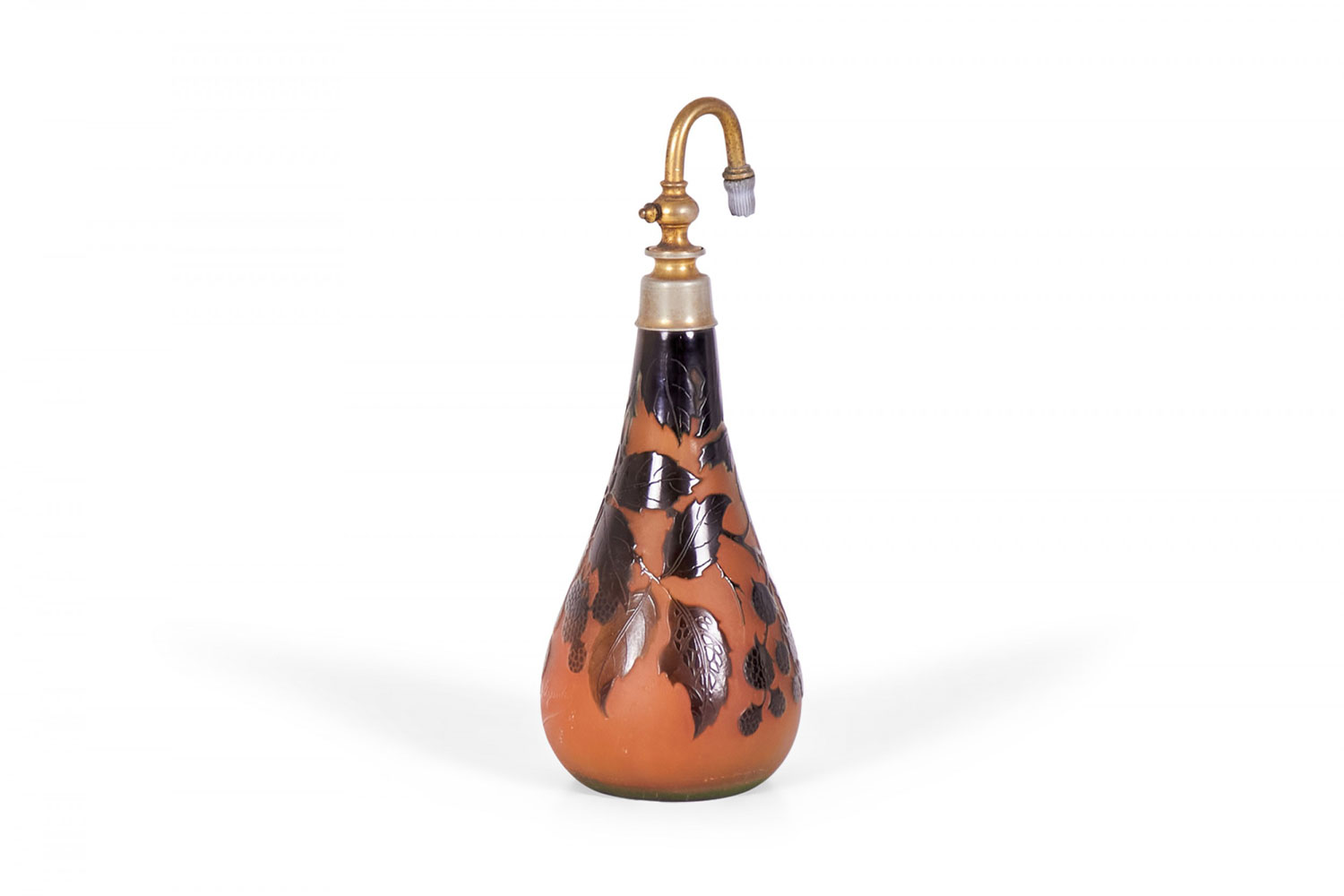 French Art Nouveau dark pink glass perfume atomizer with floral design and metal top (signed D'ARGUENTAL).