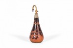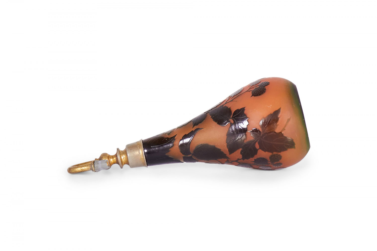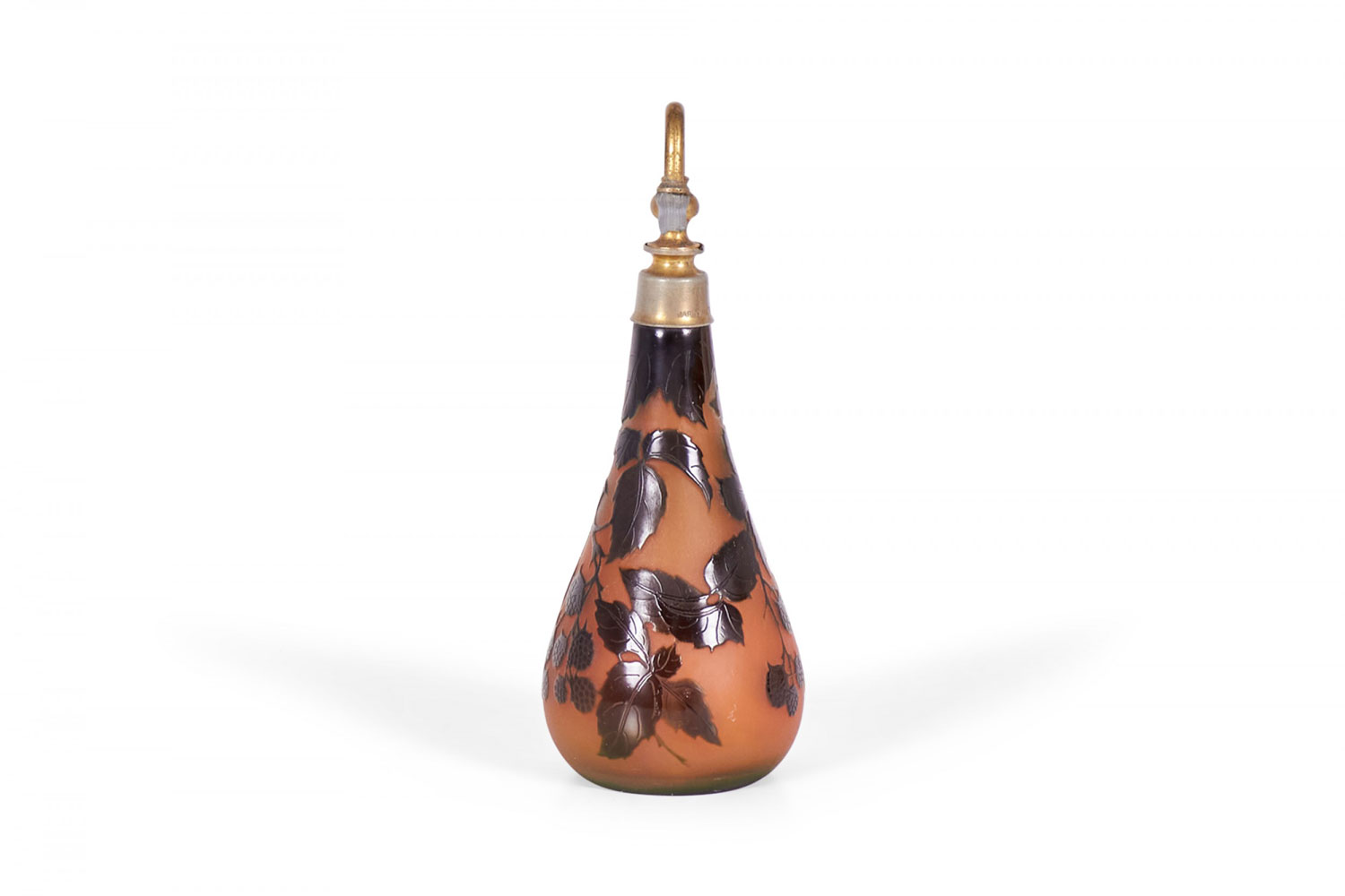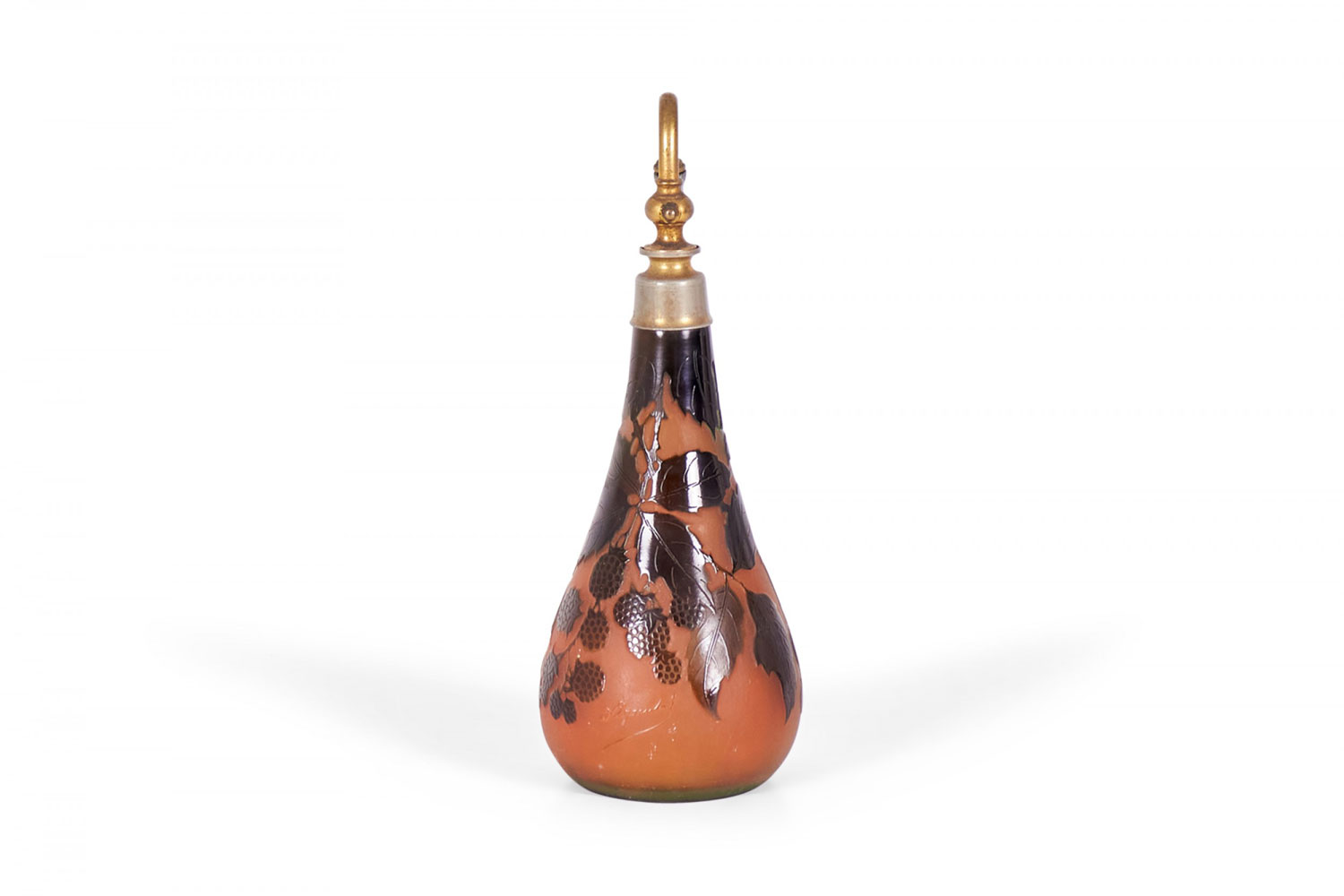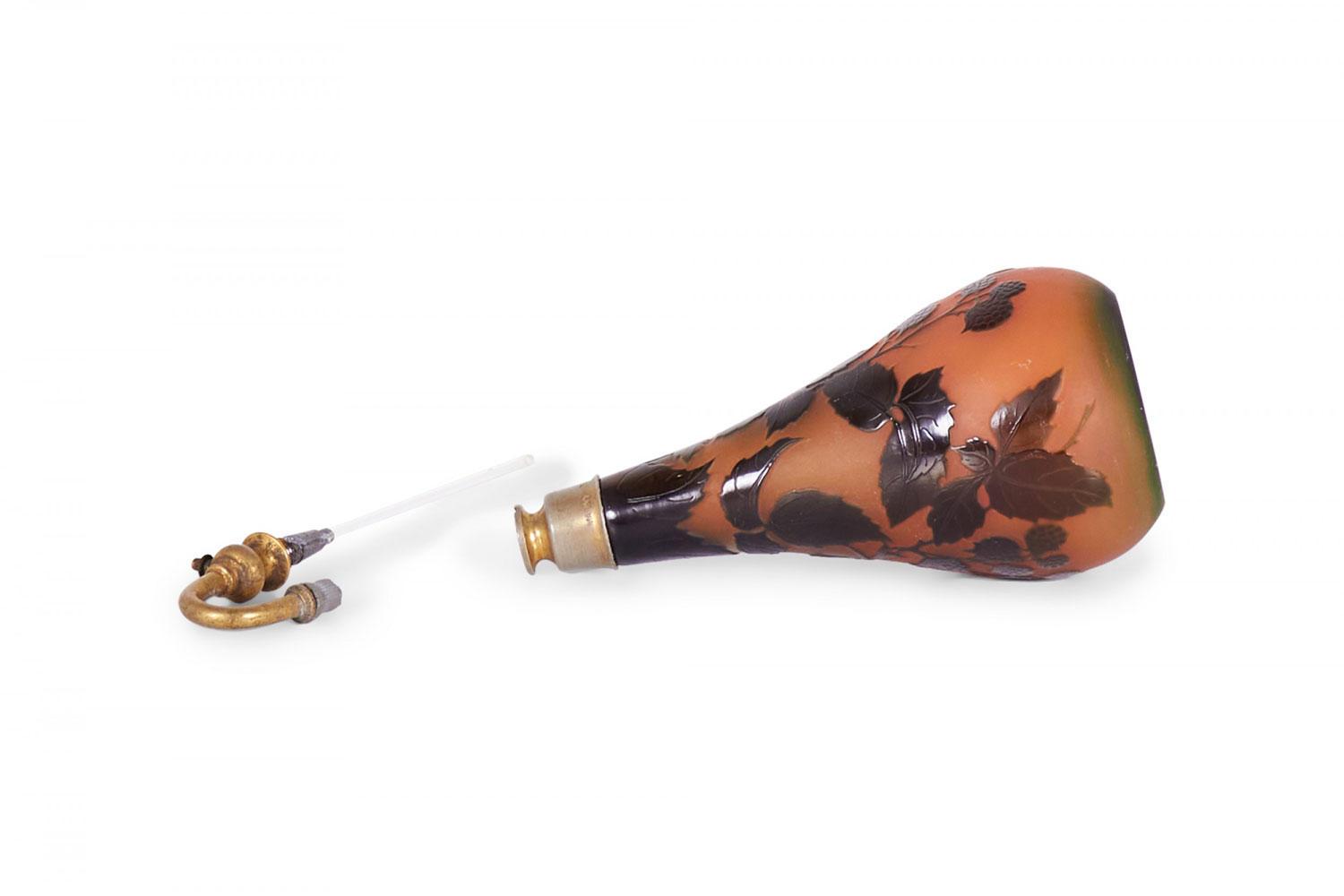 French Art Nouveau dark pink glass perfume atomizer with floral design and metal top (signed D'ARGUENTAL).