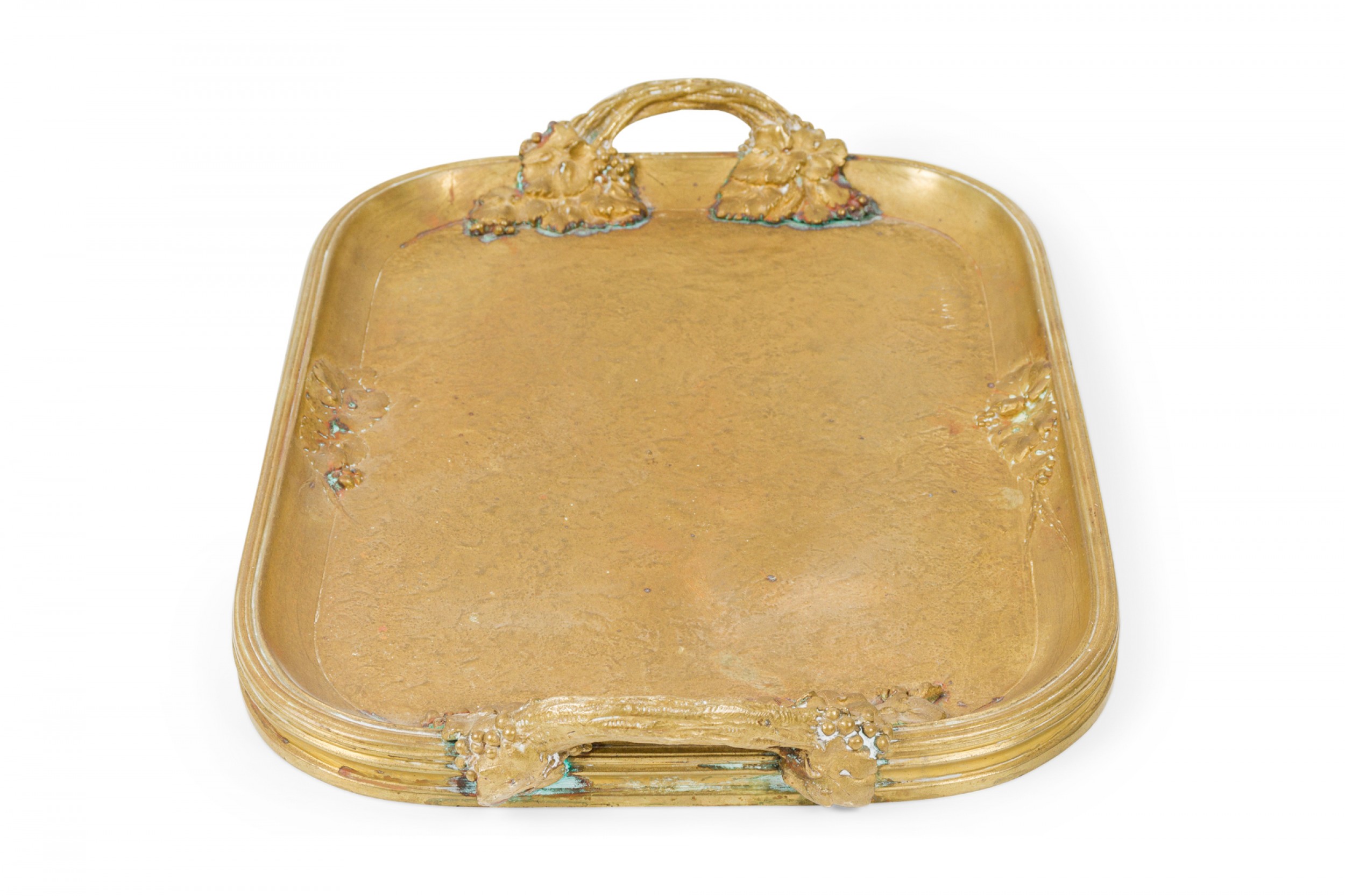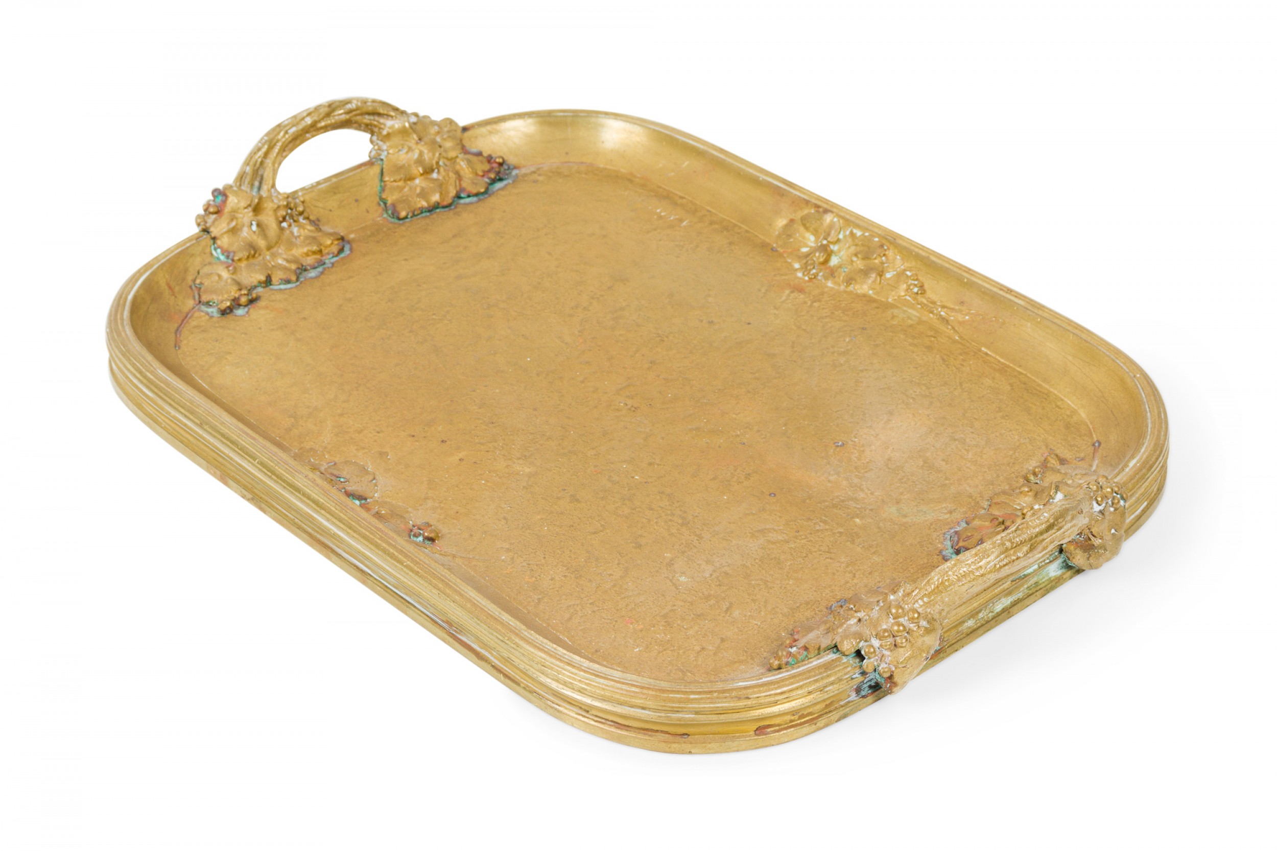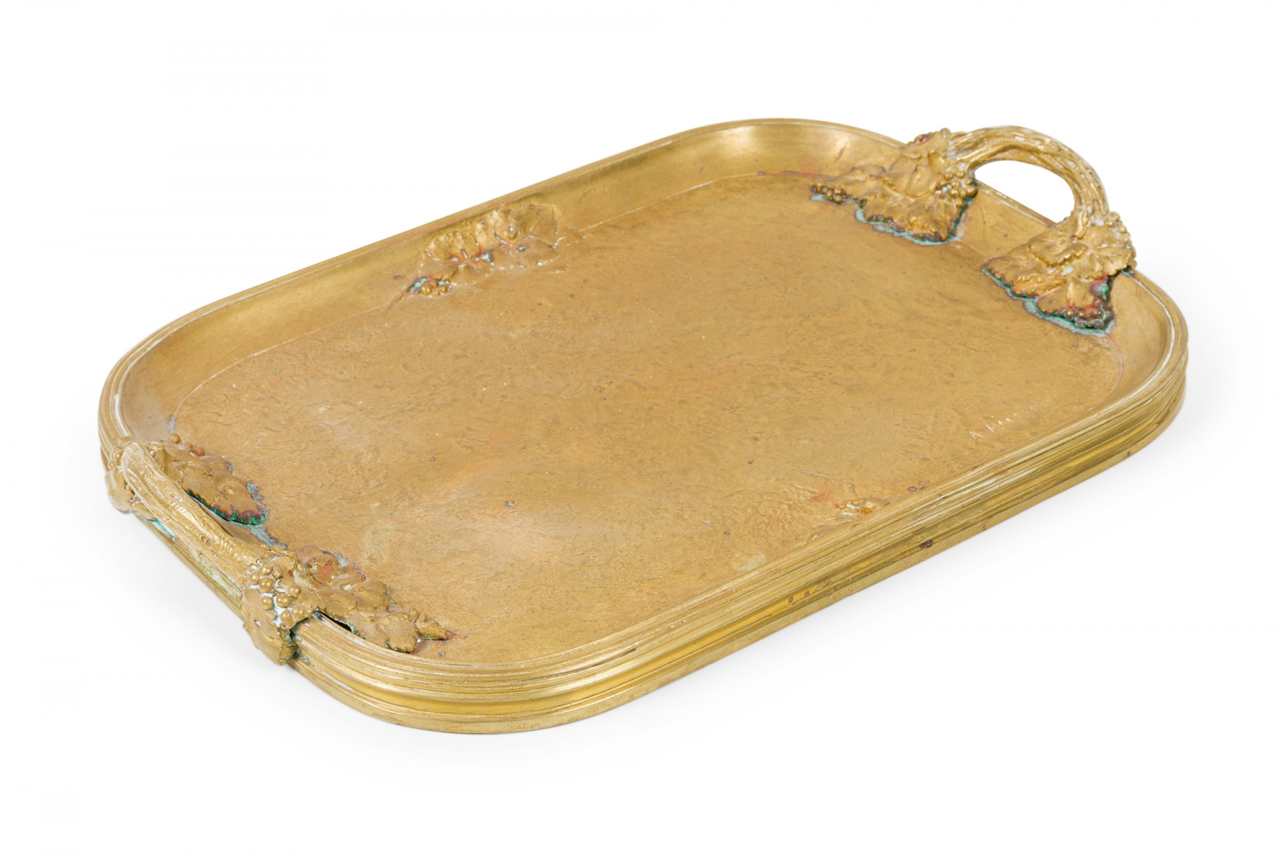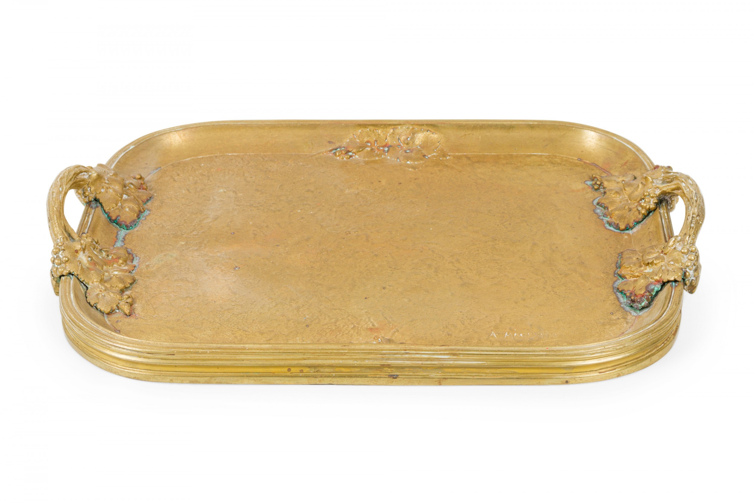 French Art Nouveau gilt bronze serving tray with side handles and floral design with a fluted edge (signed: MARIONNET)..
