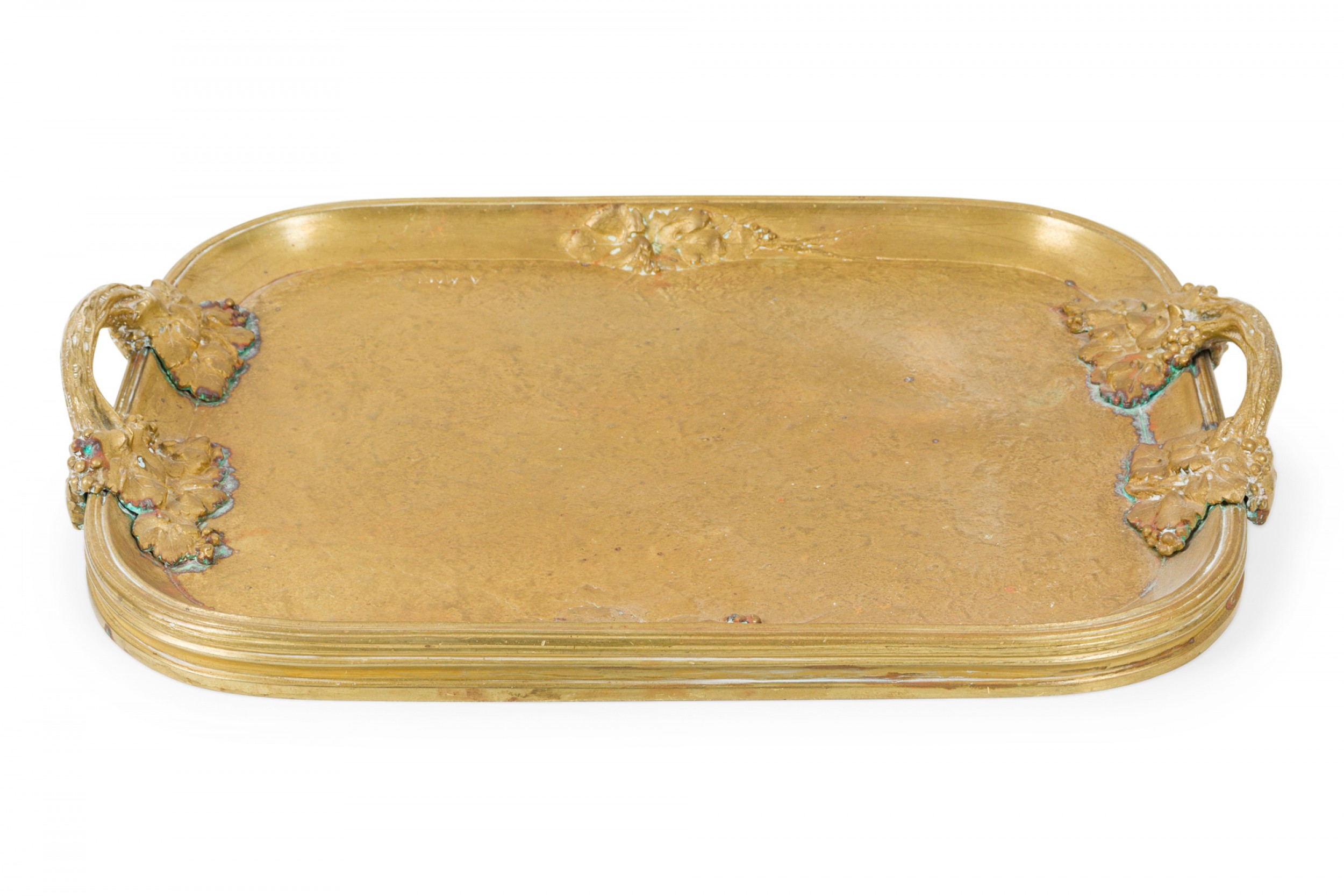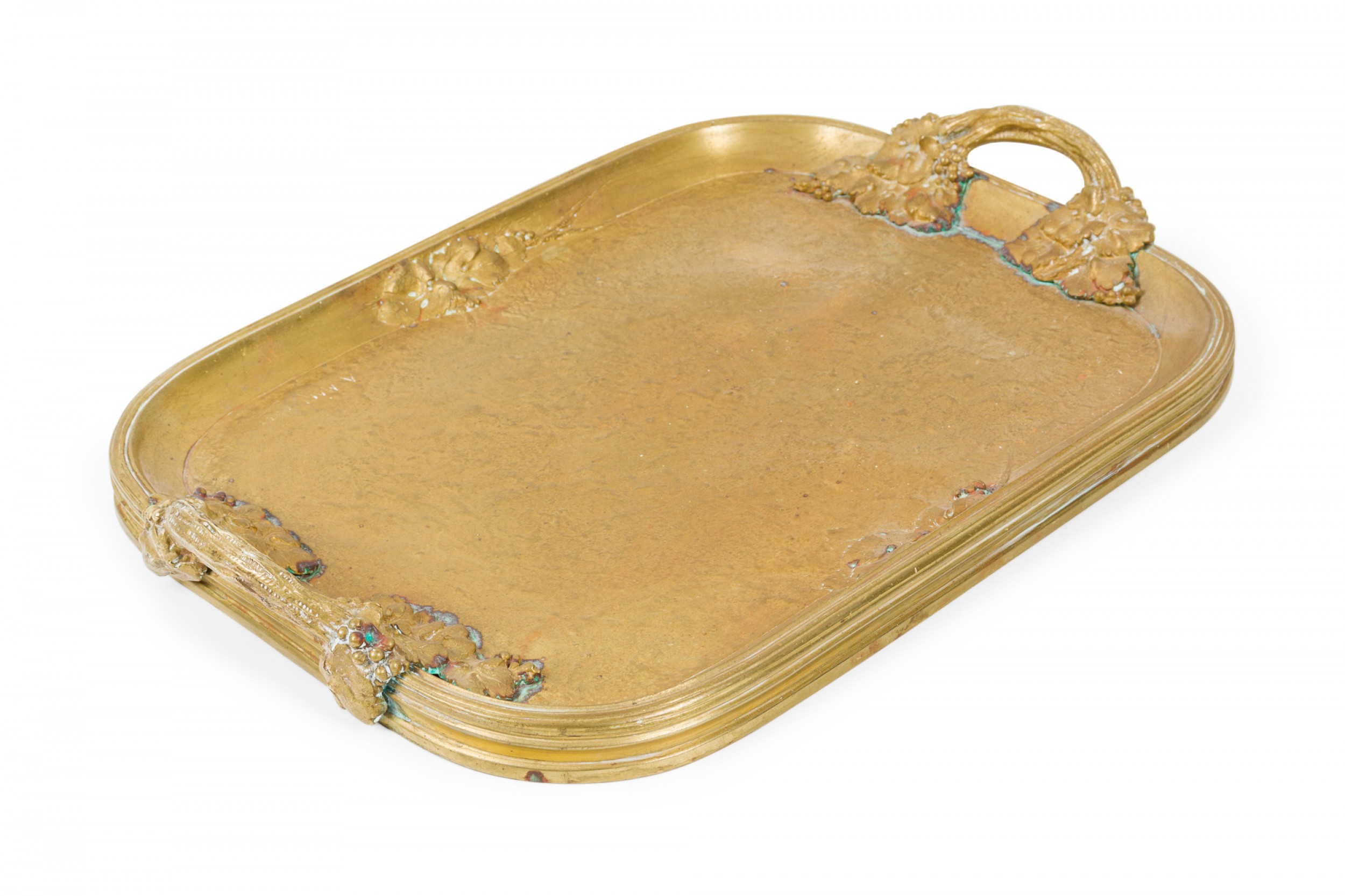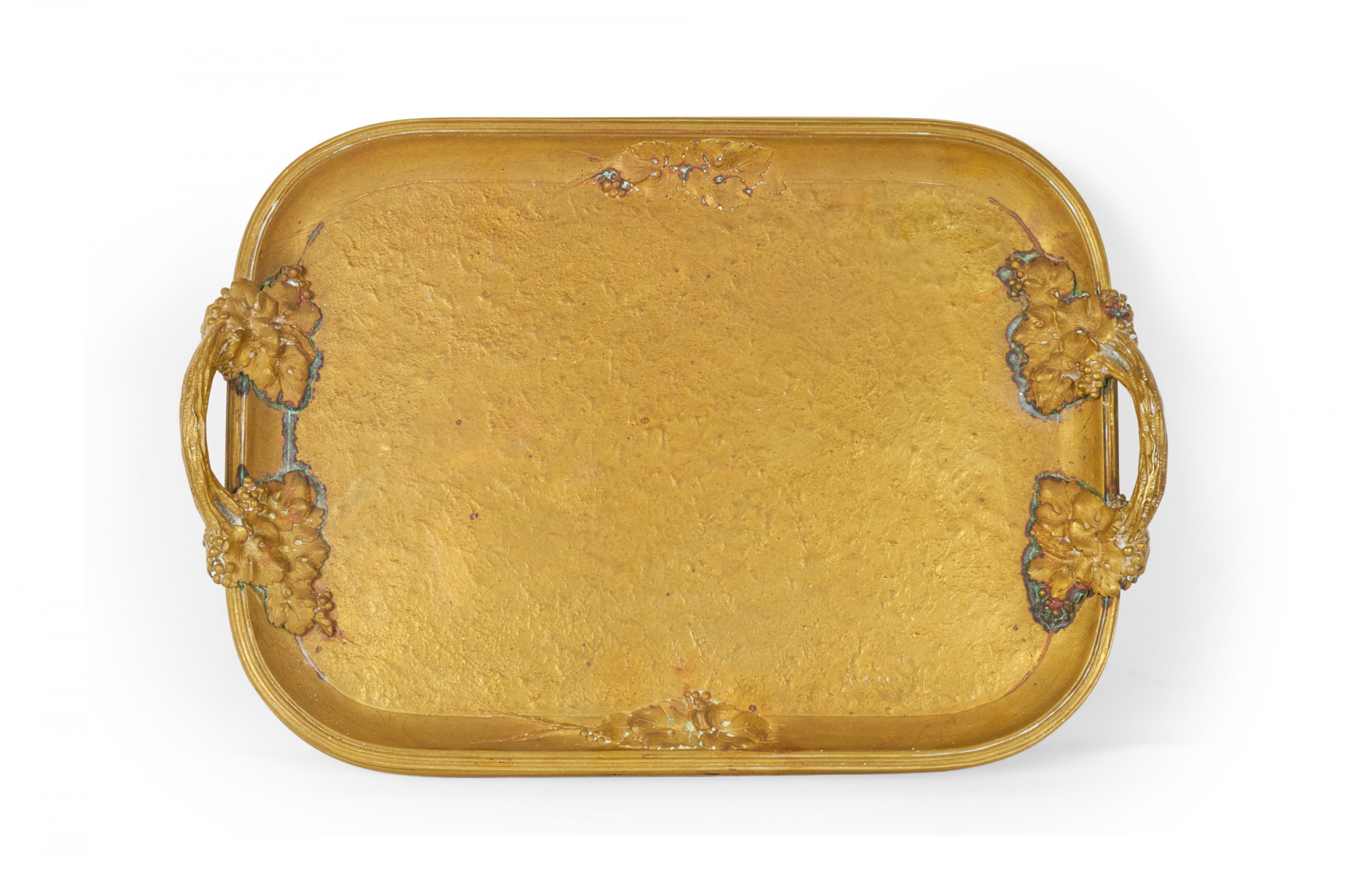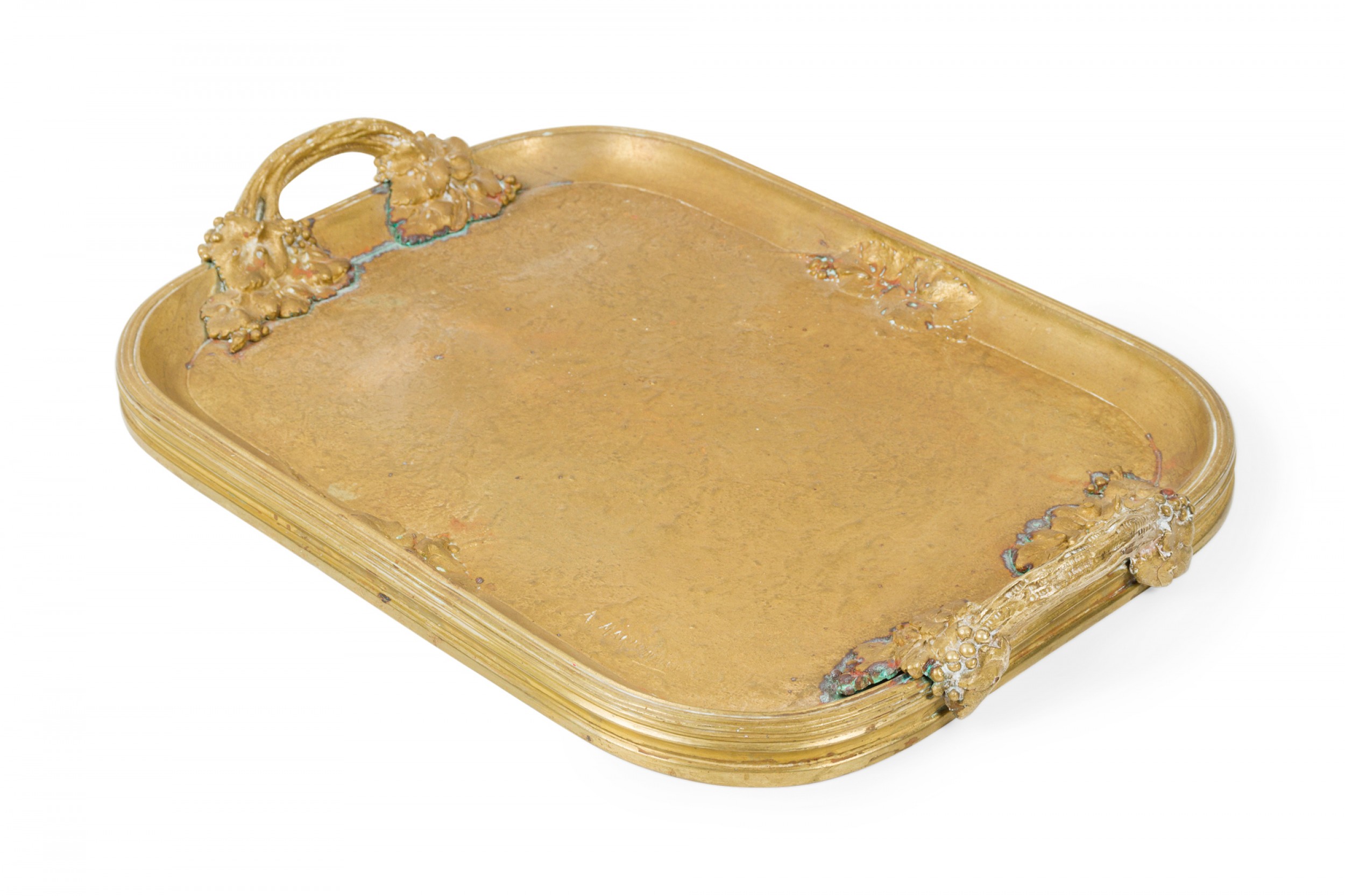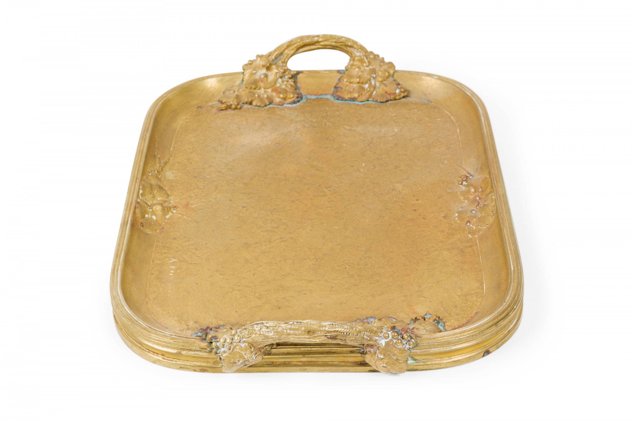 French Art Nouveau gilt bronze serving tray with side handles and floral design with a fluted edge (signed: MARIONNET)..