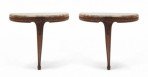 PAIR of French Art Nouveau mahogany bracket console tables with a floral carved apron supported on a single leg with "D" shaped yellow marble top (Signed with label: LOUIS MAJORELLE) (PRICED AS PAIR).