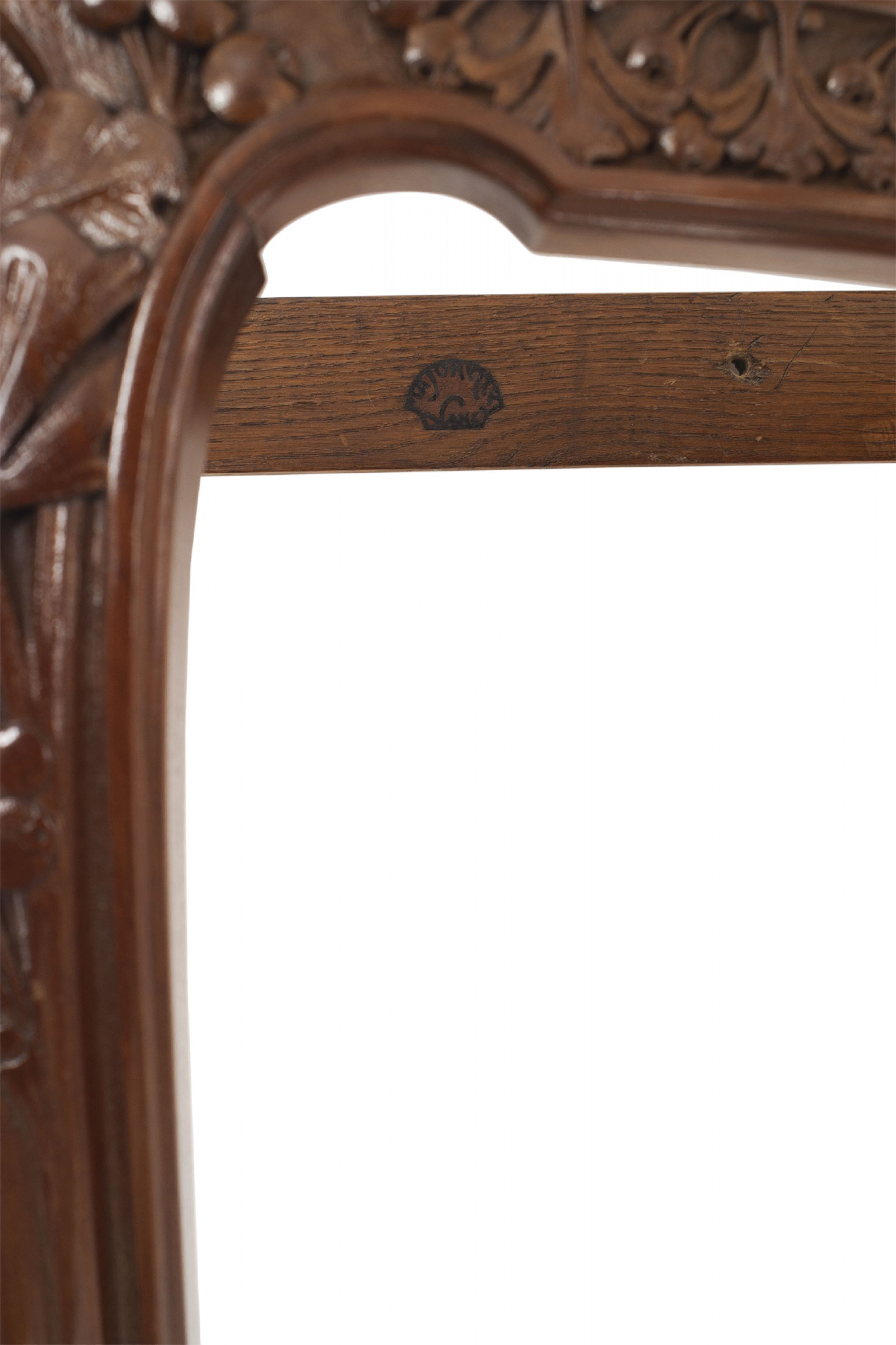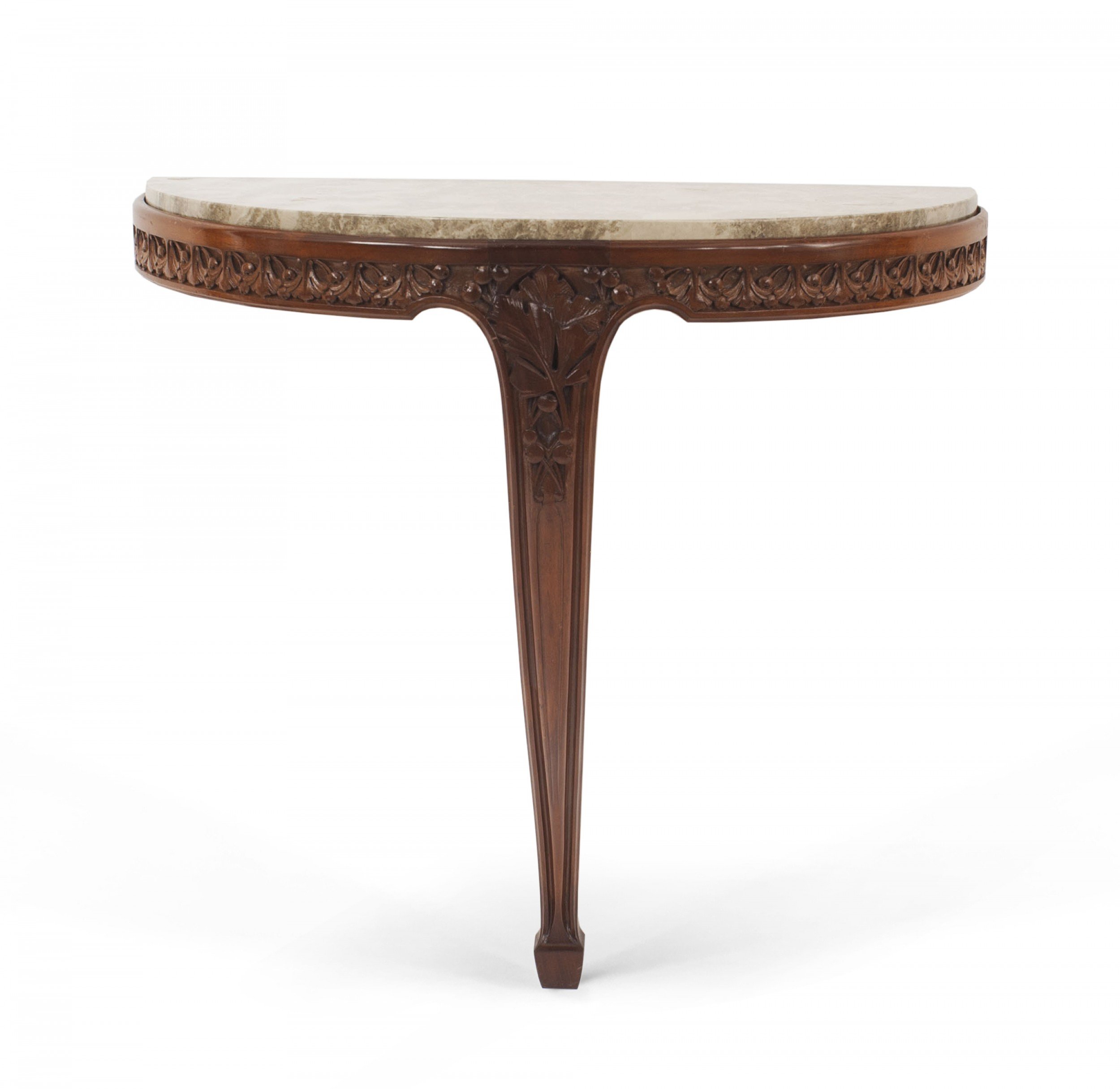 PAIR of French Art Nouveau mahogany bracket console tables with a floral carved apron supported on a single leg with "D" shaped yellow marble top (Signed with label: LOUIS MAJORELLE) (PRICED AS PAIR)