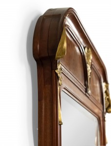 French Art Nouveau walnut wall mirror with a beveled glass, two burl walnut top panels, and floral motif gilt bronze trim. (by LOUIS MAJORELLE)