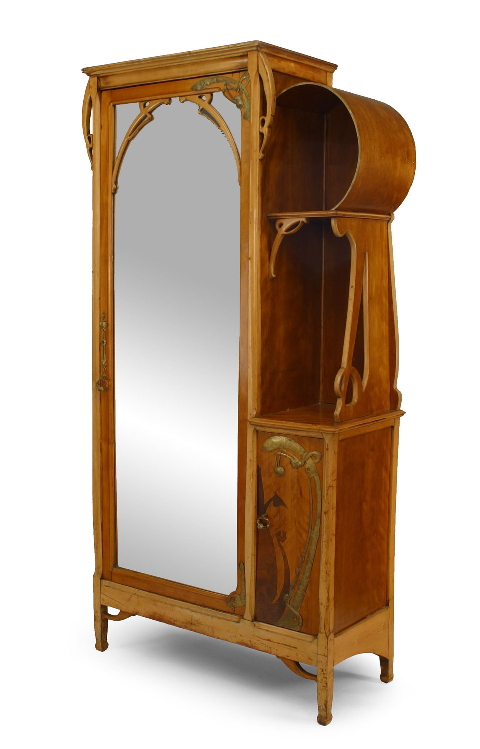 French Art Nouveau maple and inlaid armoire cabinet with brass trim and mirrored door and small side door with shelf (Attributed to Leon Benouville)