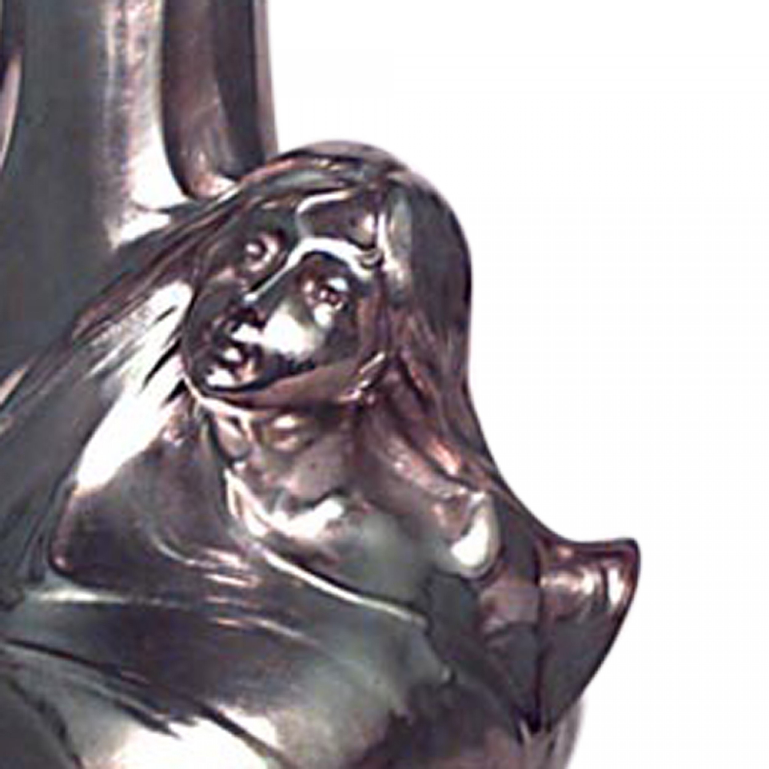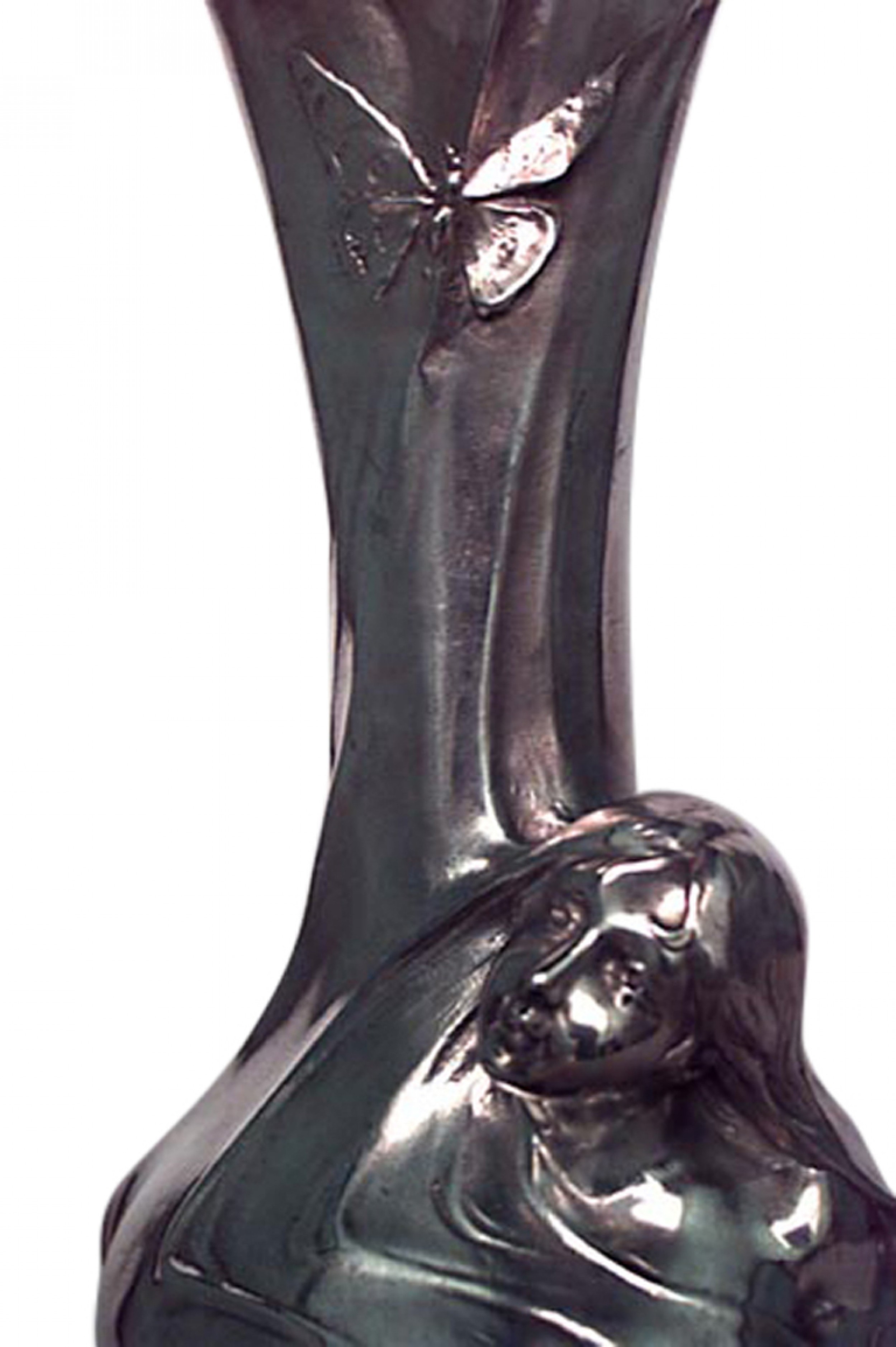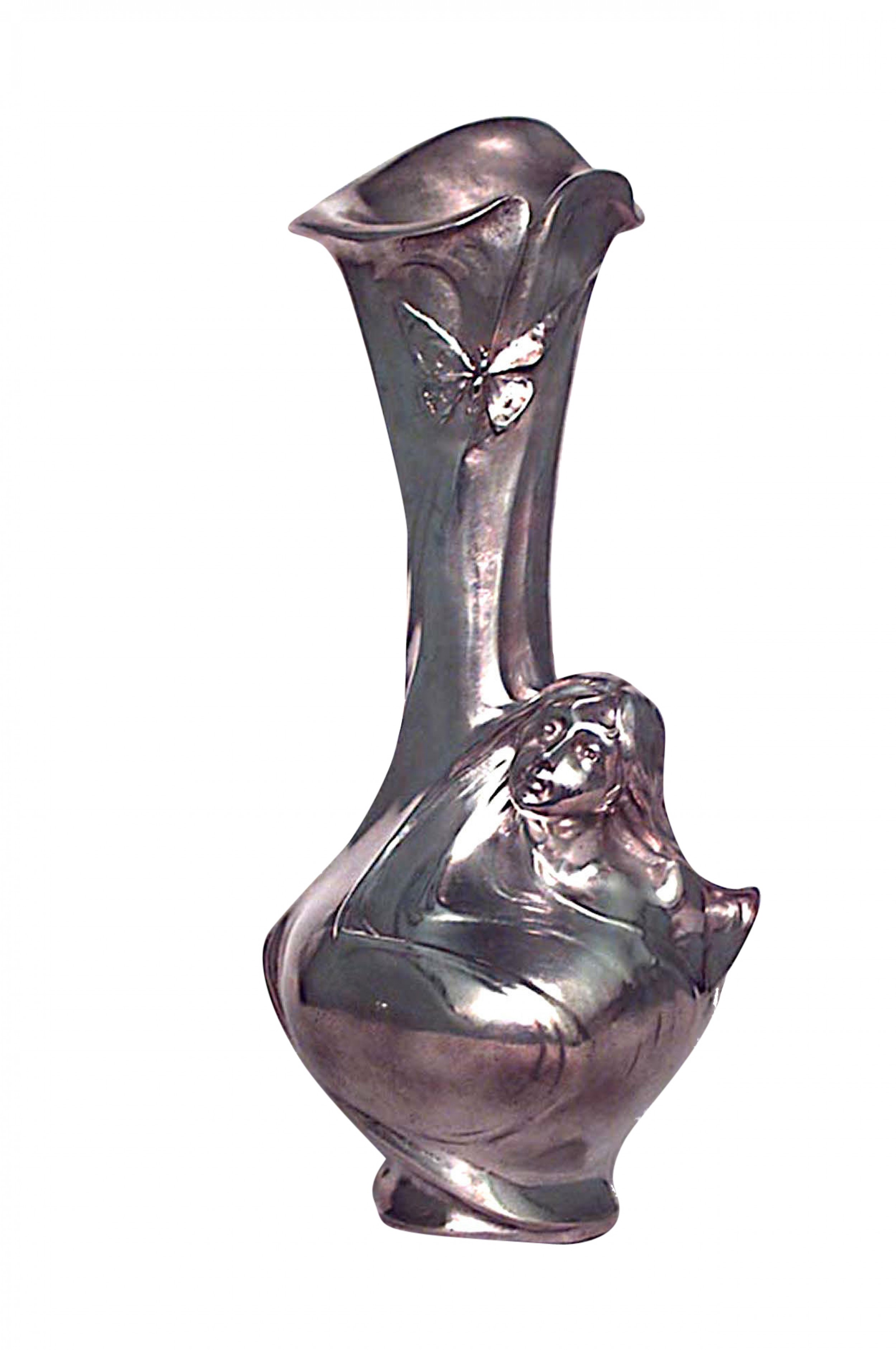 French Art Nouveau silver plated vase with female head on shaped bottom (signed H. SIBEUD, with hallmark).