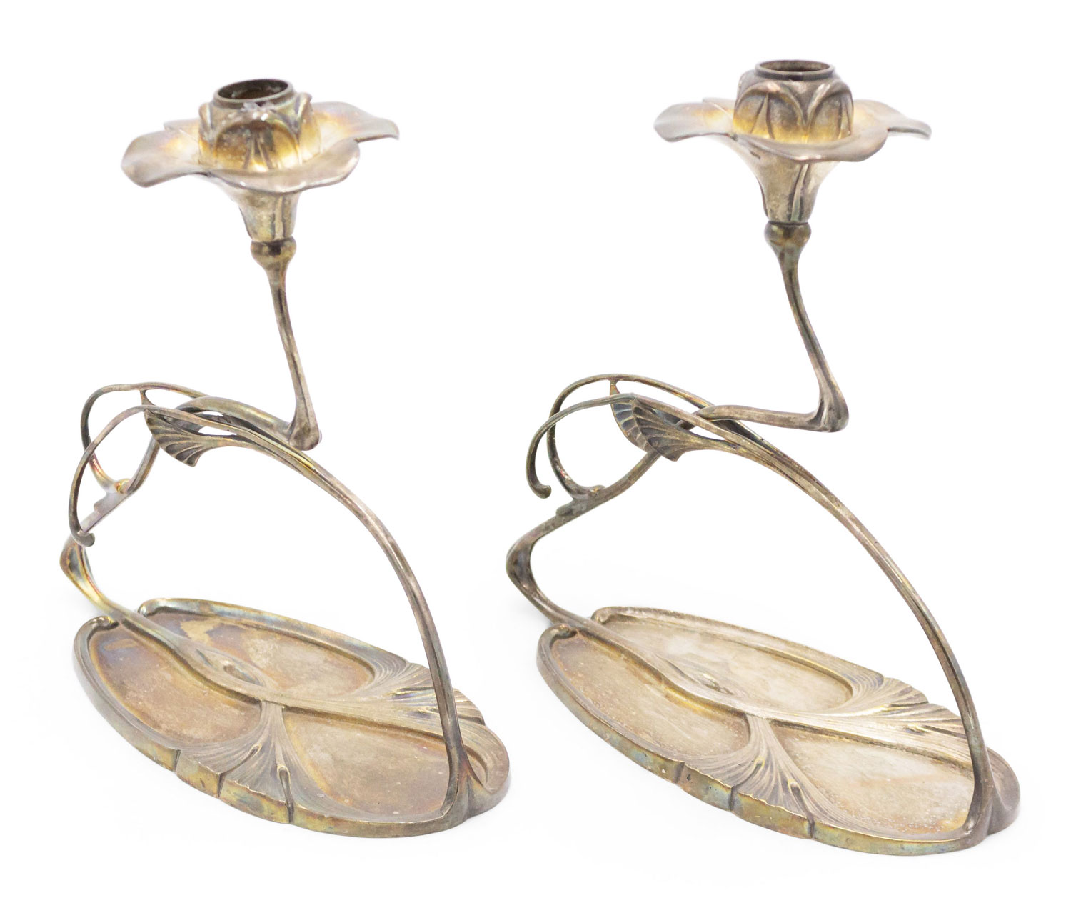 PAIR of French Art Nouveau silver plate candlesticks with floral whiplash design on oval base (PRICED AS PAIR).