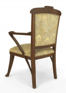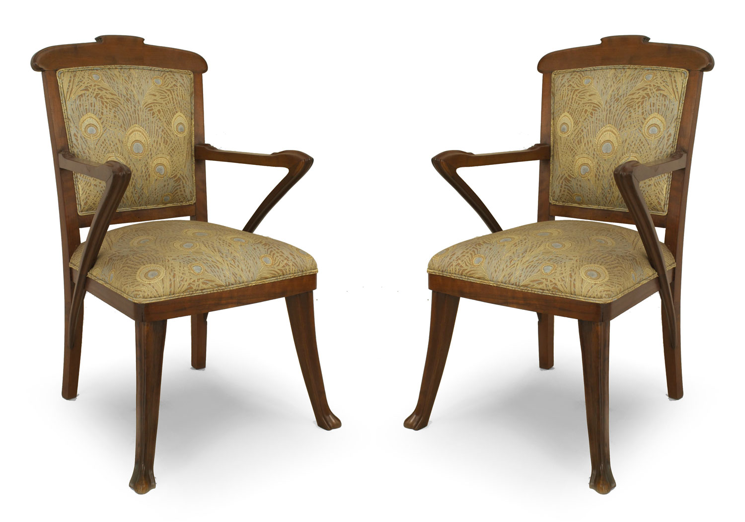 SET of 4 French Art Nouveau walnut open armchairs with upholstered peacock feather design seats and backs. (PRICED AS SET)