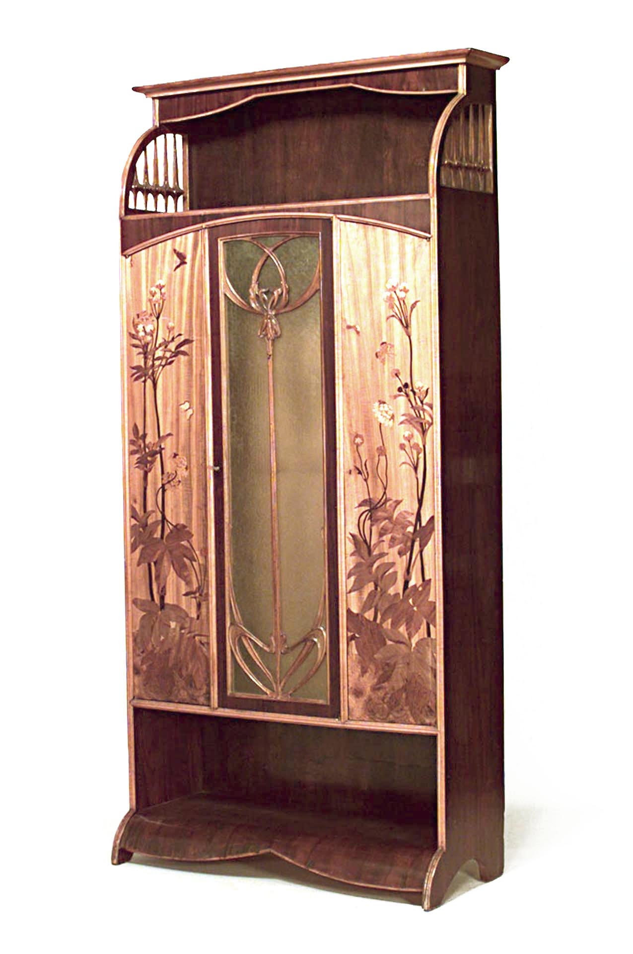French Art Nouveau walnut and inlaid floral design 3 door armoire cabinet with shelf on bottom and top with spindle sides. (signed: LOUIS MAJORELLE).
