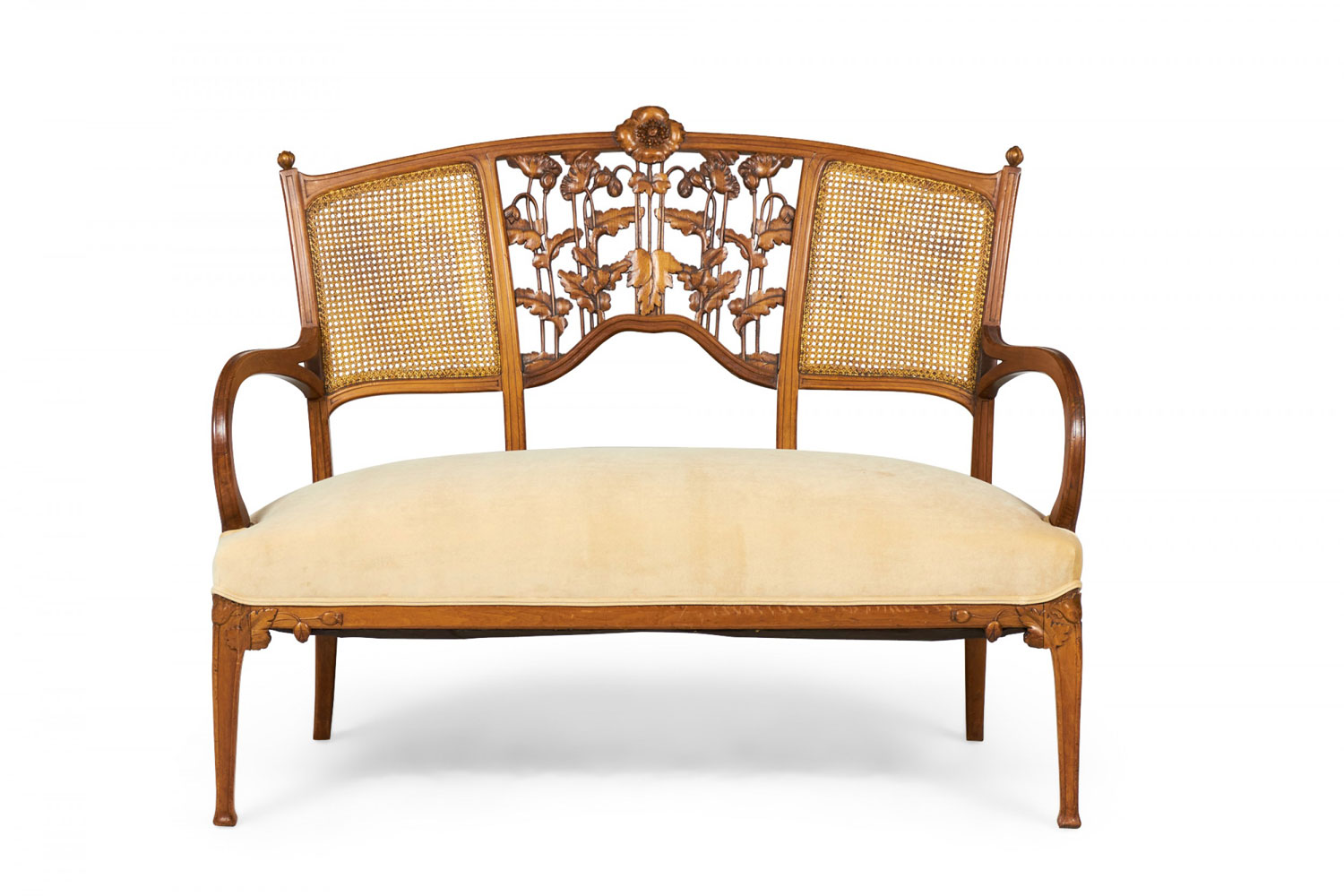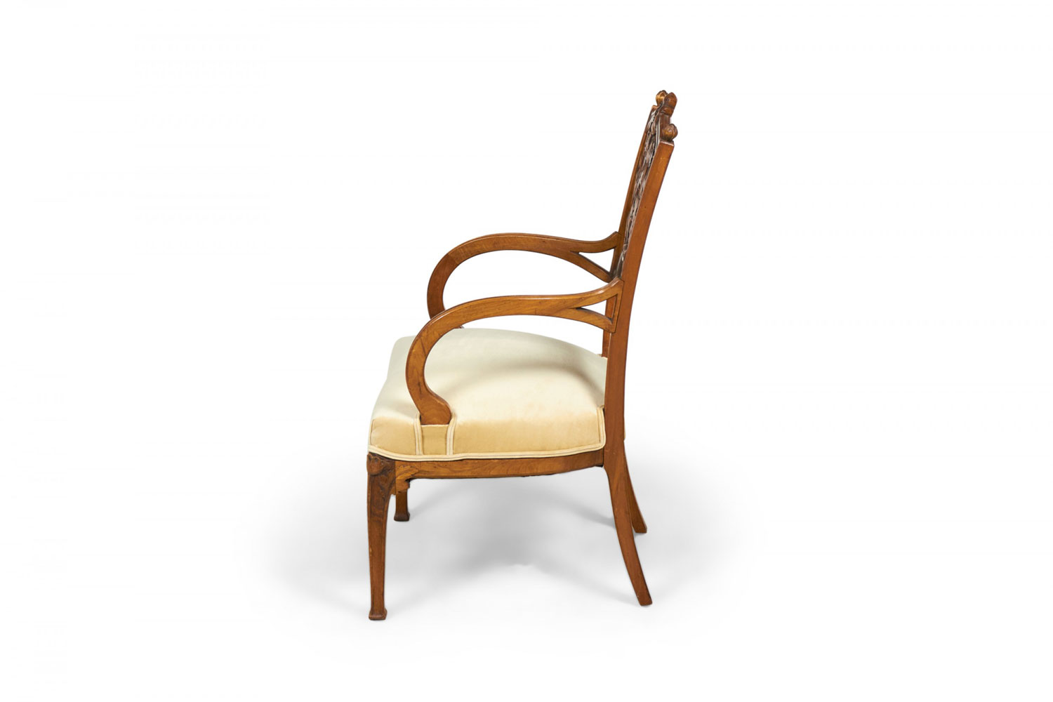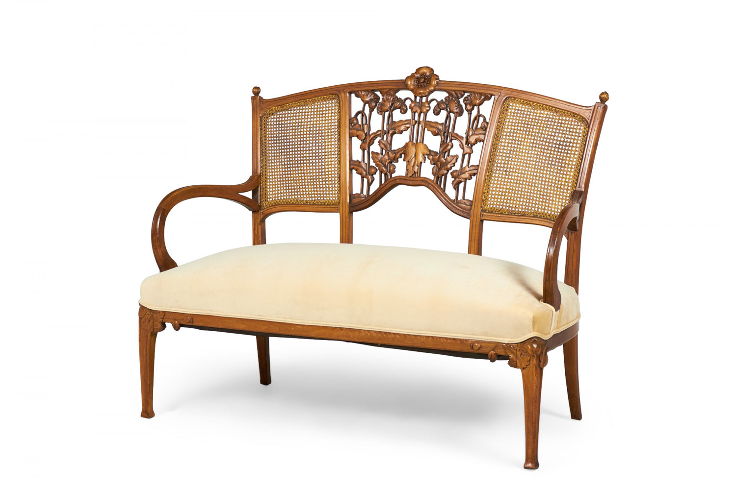 Style: Art Nouveau Materials & Techniques: Carved, upholstered, velvet, walnut, wood Category: Seating