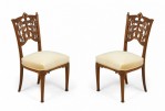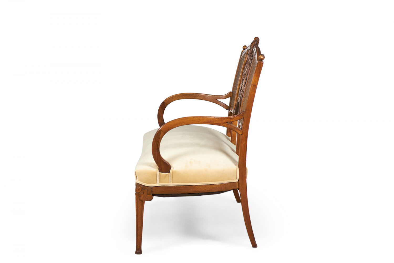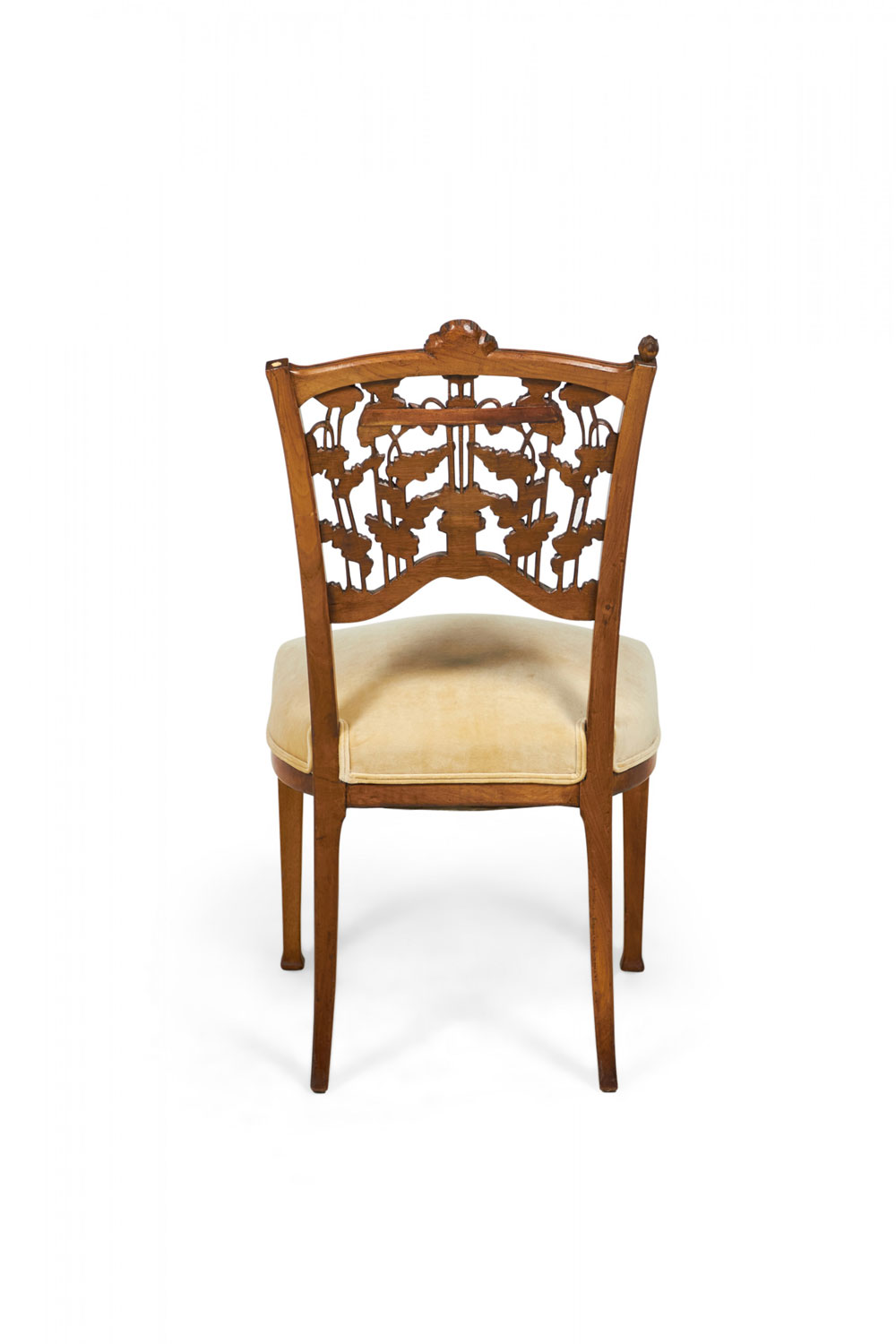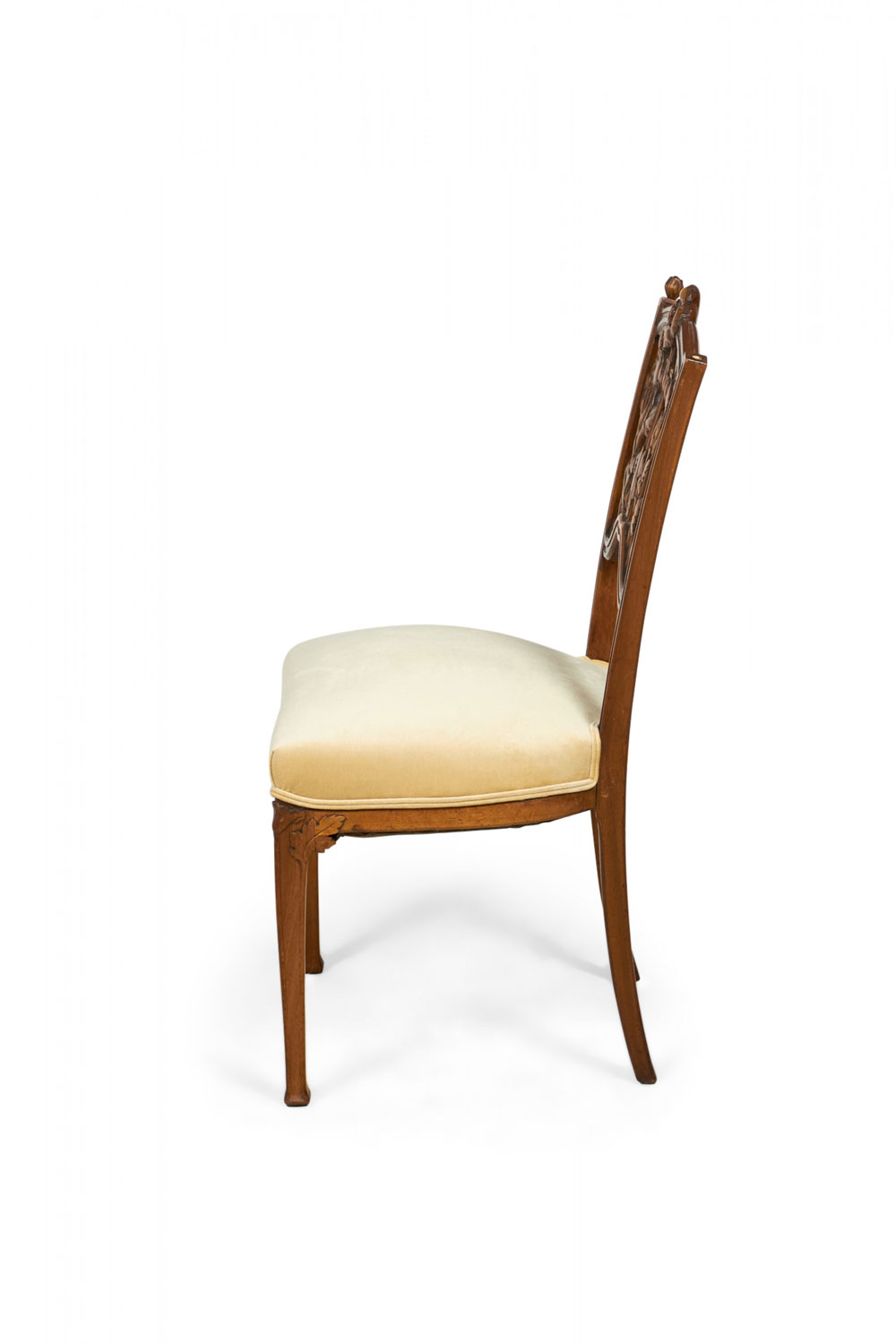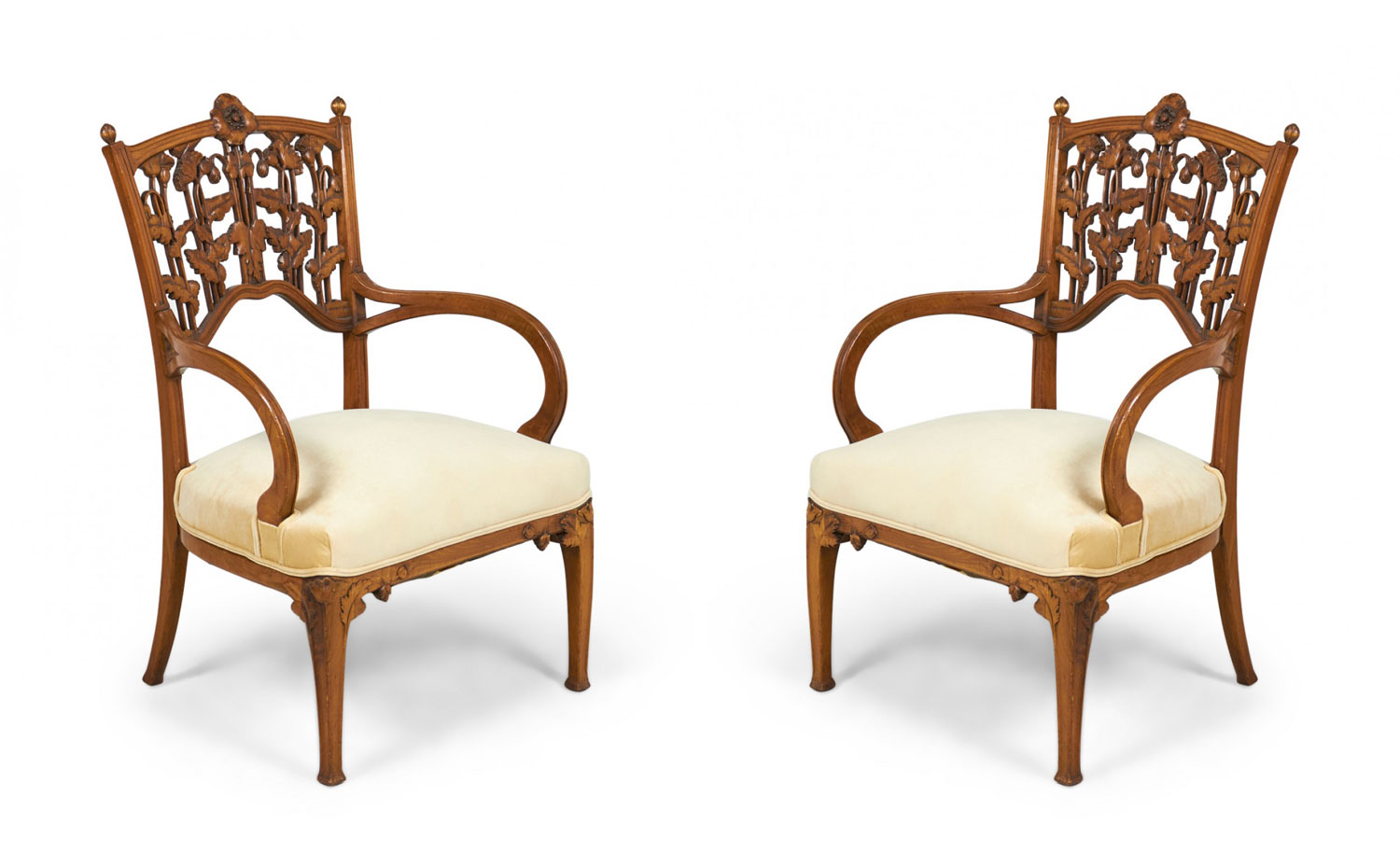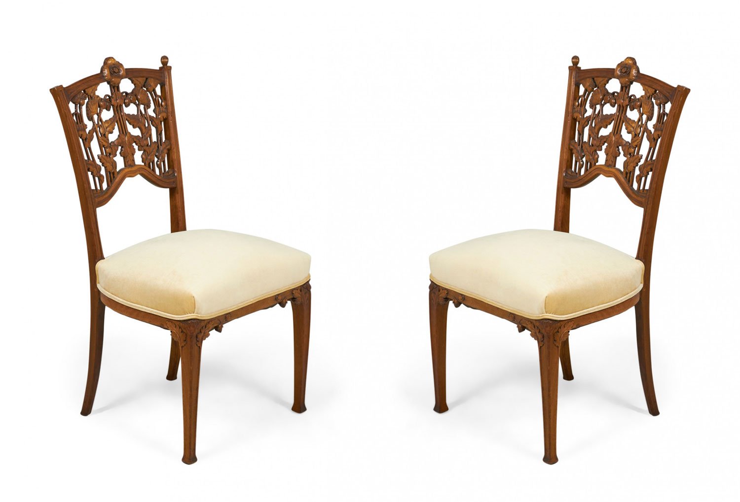 5-Piece French Art Nouveau walnut living room / salon set comprised of a settee, 2 armchairs, and 2 side chairs with floral filigree backs and beige velvet upholstery. (PRICED AS SET)