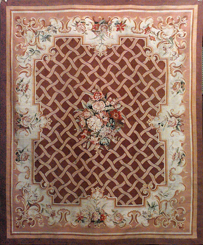 French XVI style (19th Century) aubusson rug carpet with beige lattice motif and floral center ( 9 x 6').