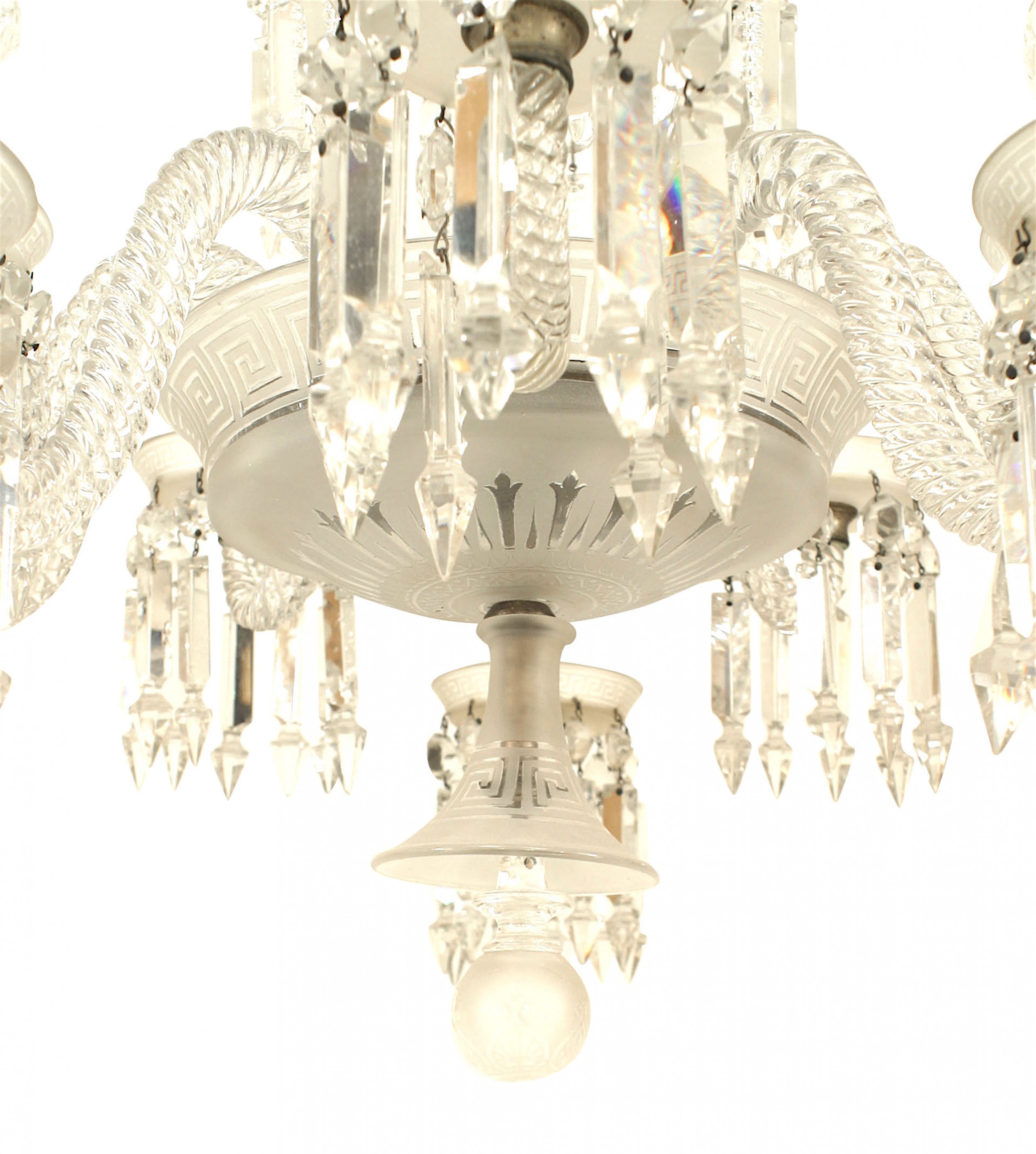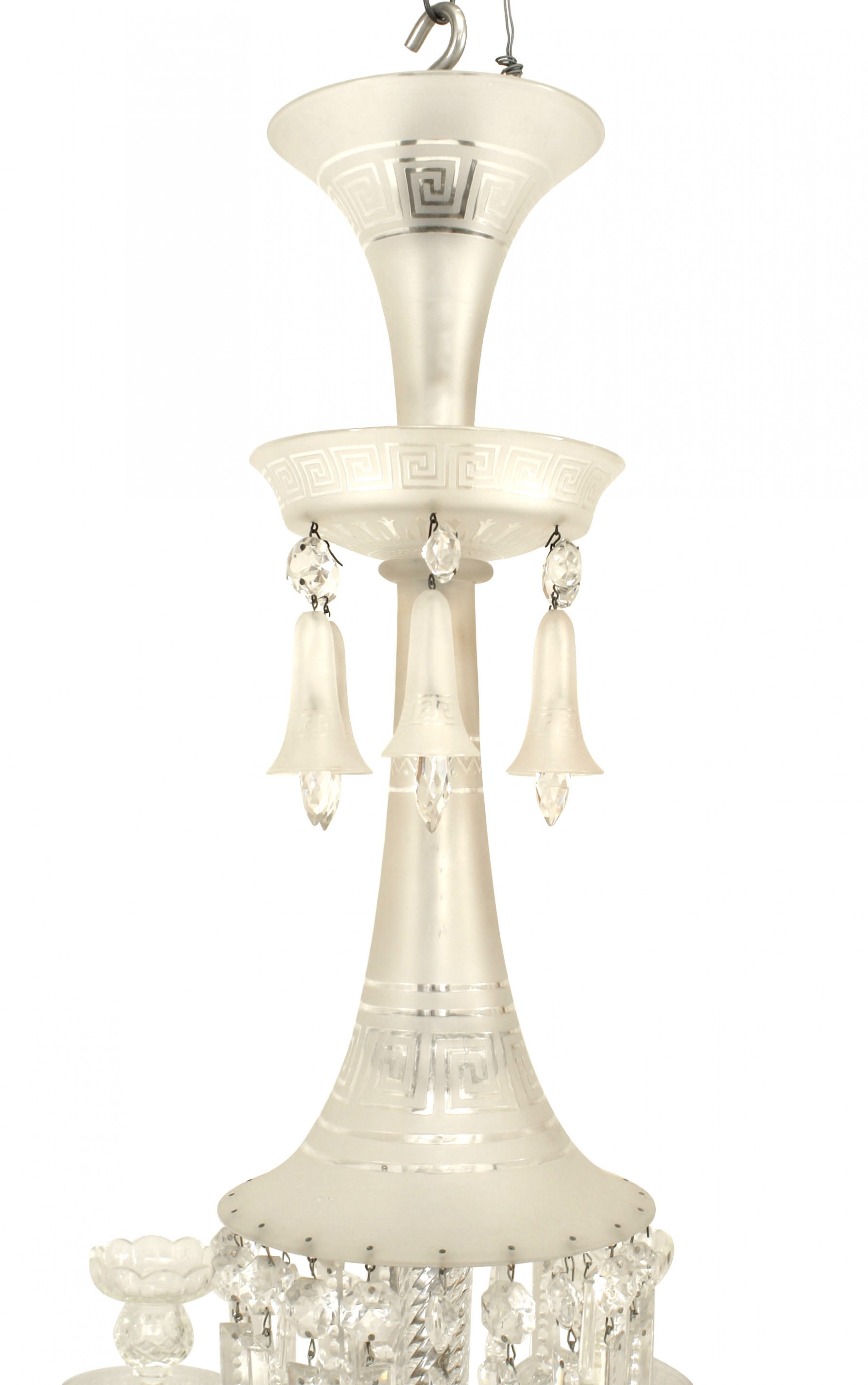 French (19th Century) frosted & clear Baccarat crystal chandelier with two-tiered ten upswept swirl arms having etched Greek key motif bobeche & crystal drops and a finial ball bottom..