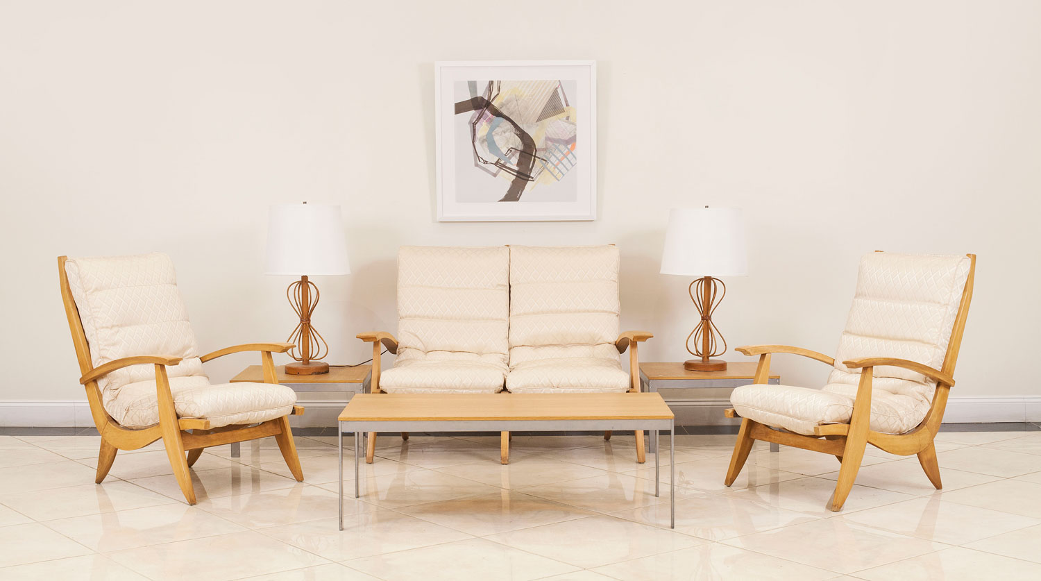 SET of 3 French 1950s beechwood living room / salon set with contoured ribbed upholstery & spring supports (att: RENE MELIN-model #FS123) SETTEE: 51