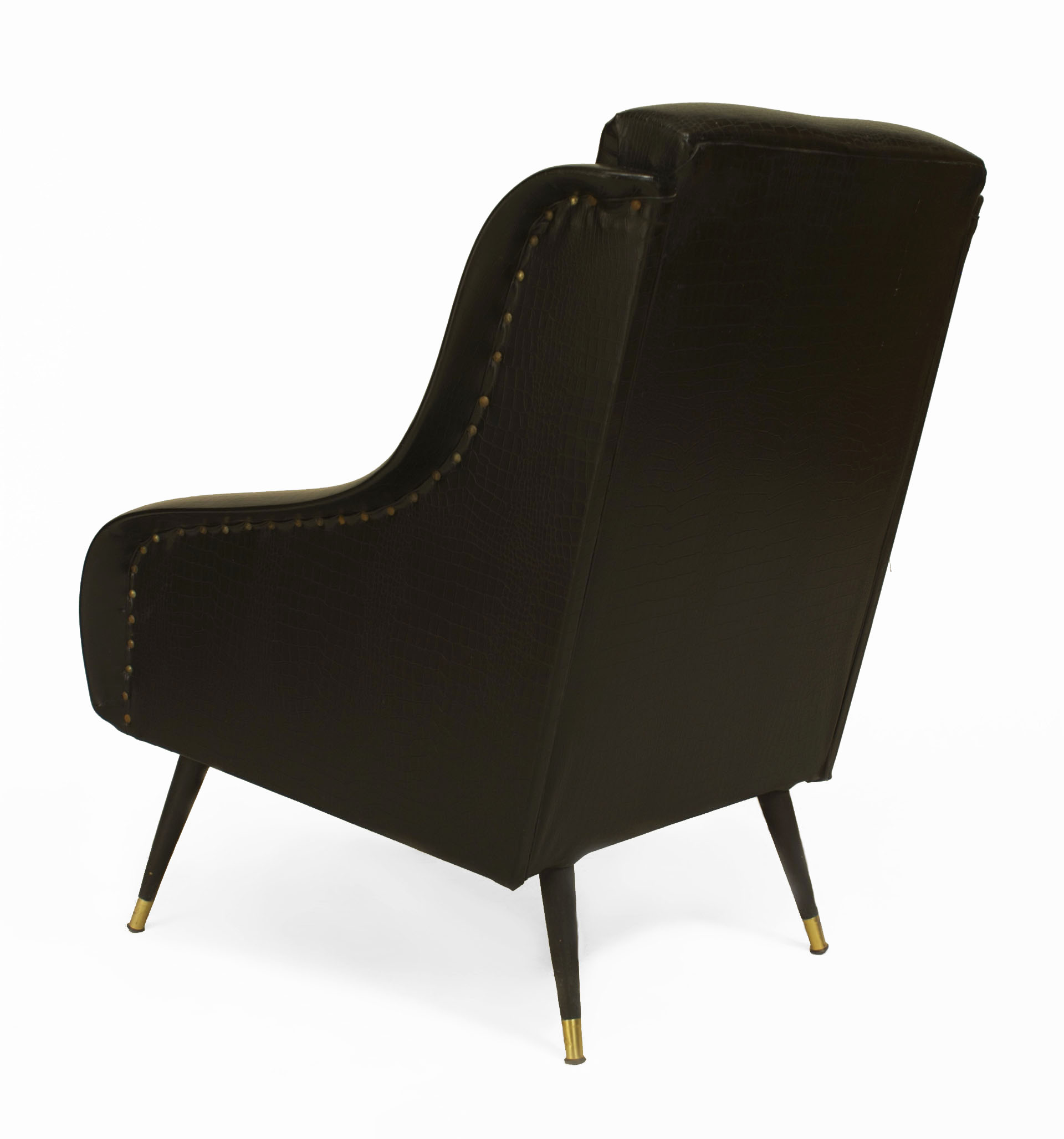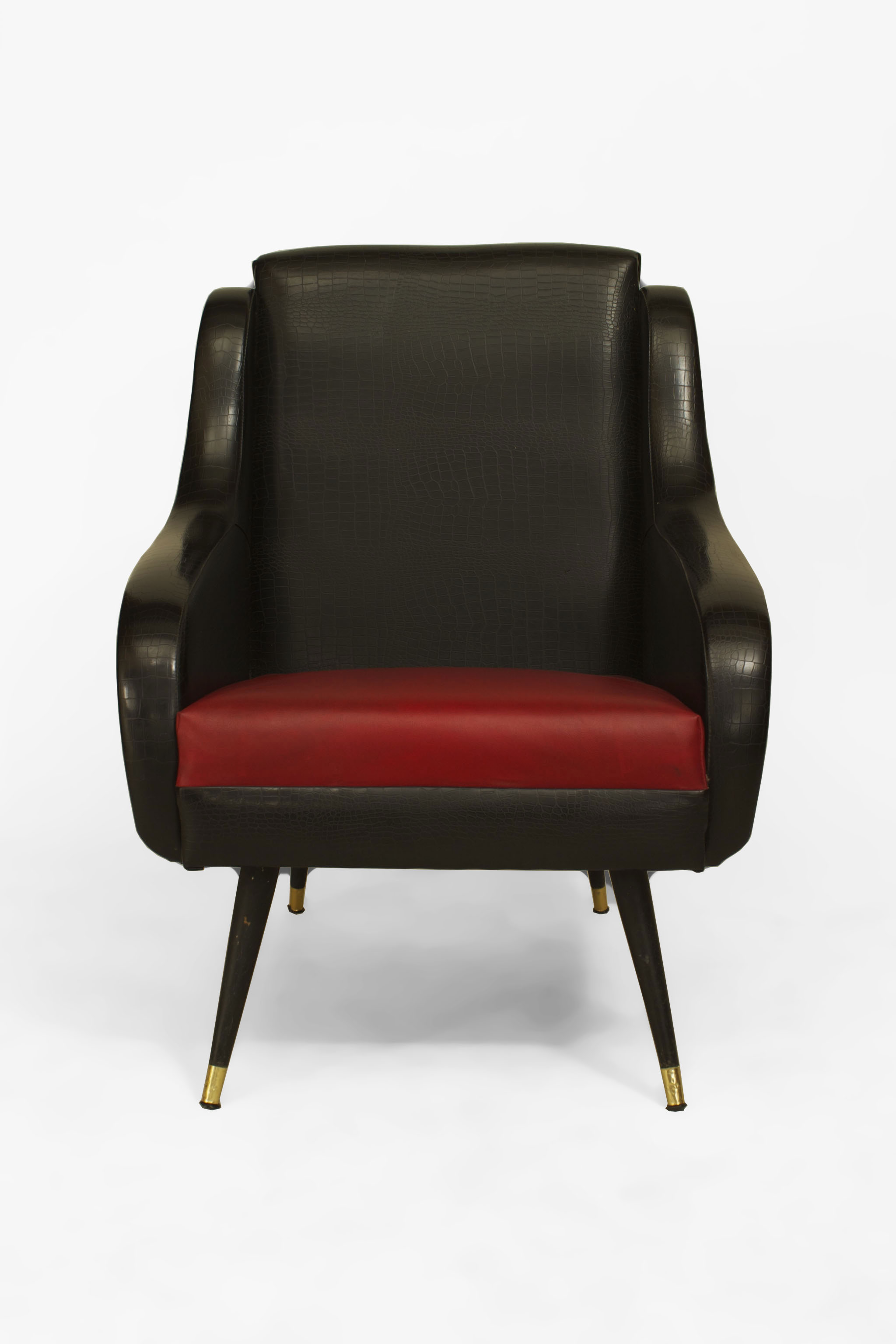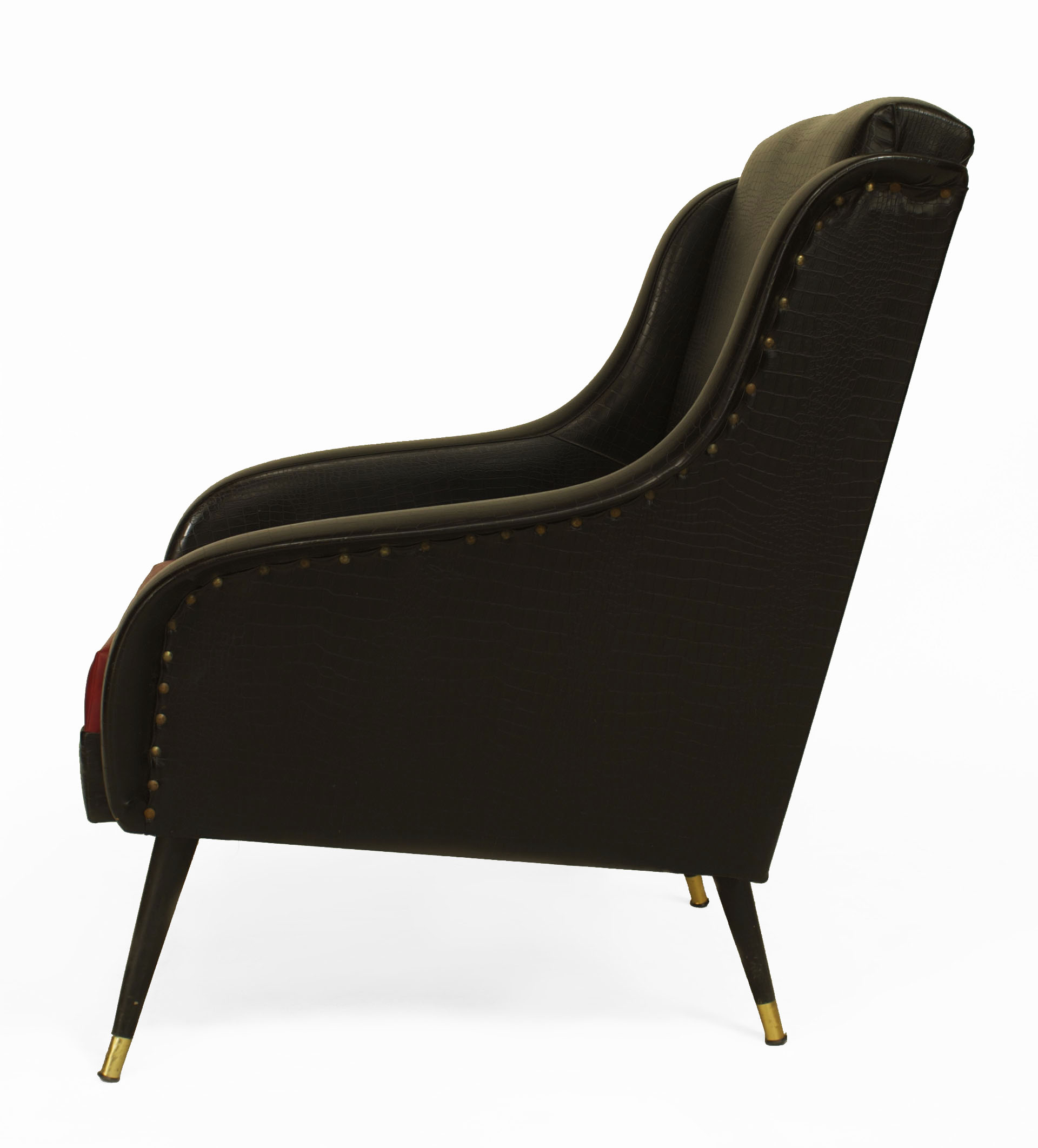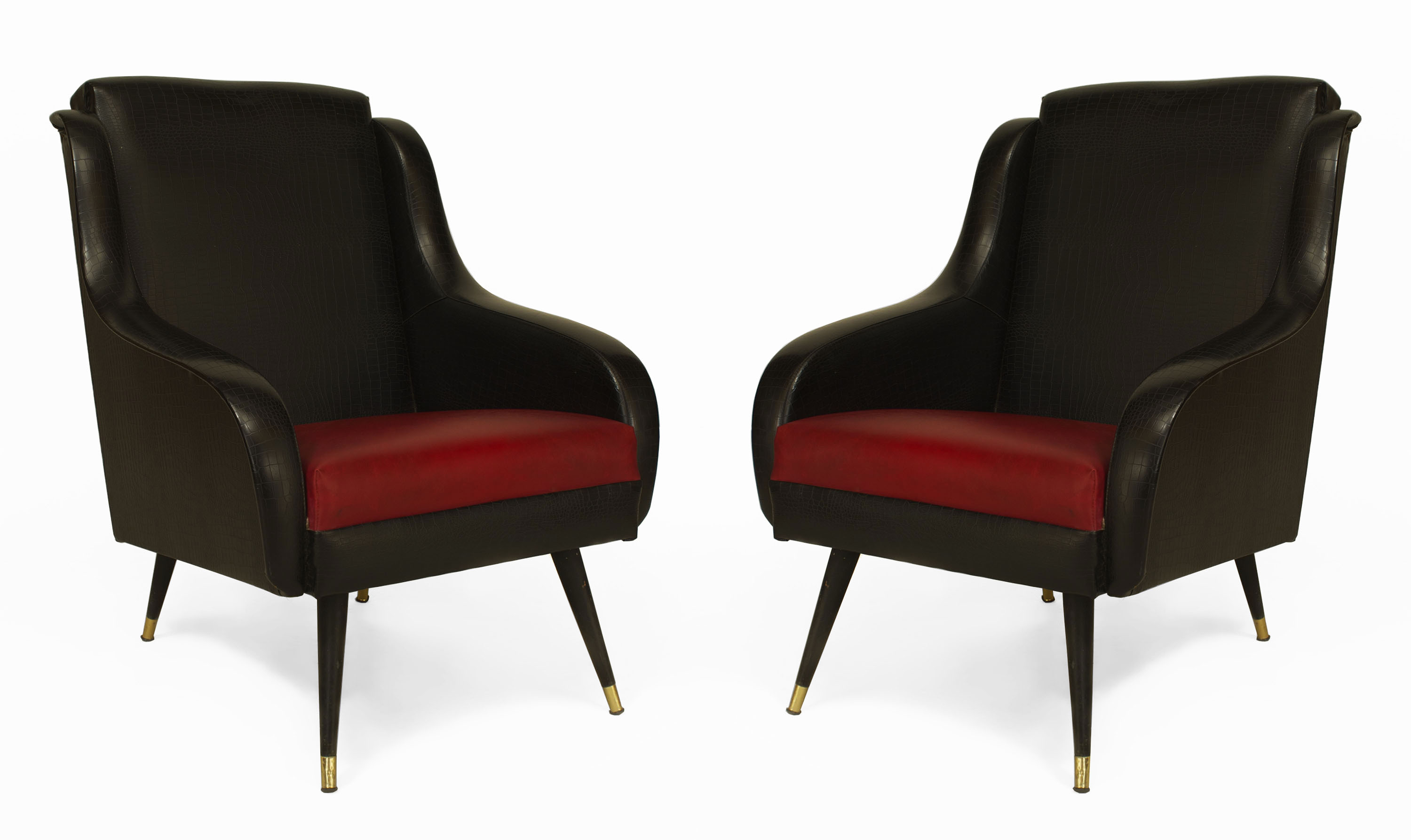 PAIR of French Mid-Century (1950s) bergeres armchairs upholstered in a black faux alligator with a faux red leather seat supported on tapered tubular legs with brass sabots (PRICED AS PAIR)