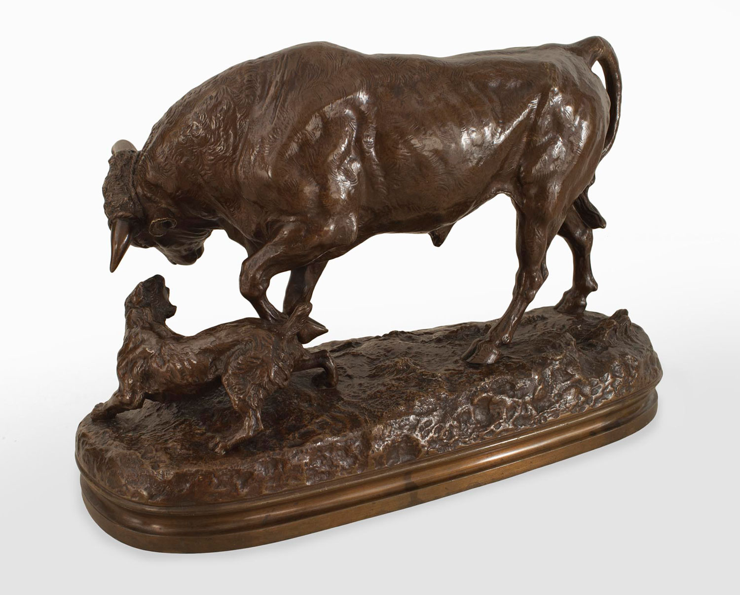 French bronze figure of bull with attacking dog on an oval base (Valton) (19/20th Cent.).