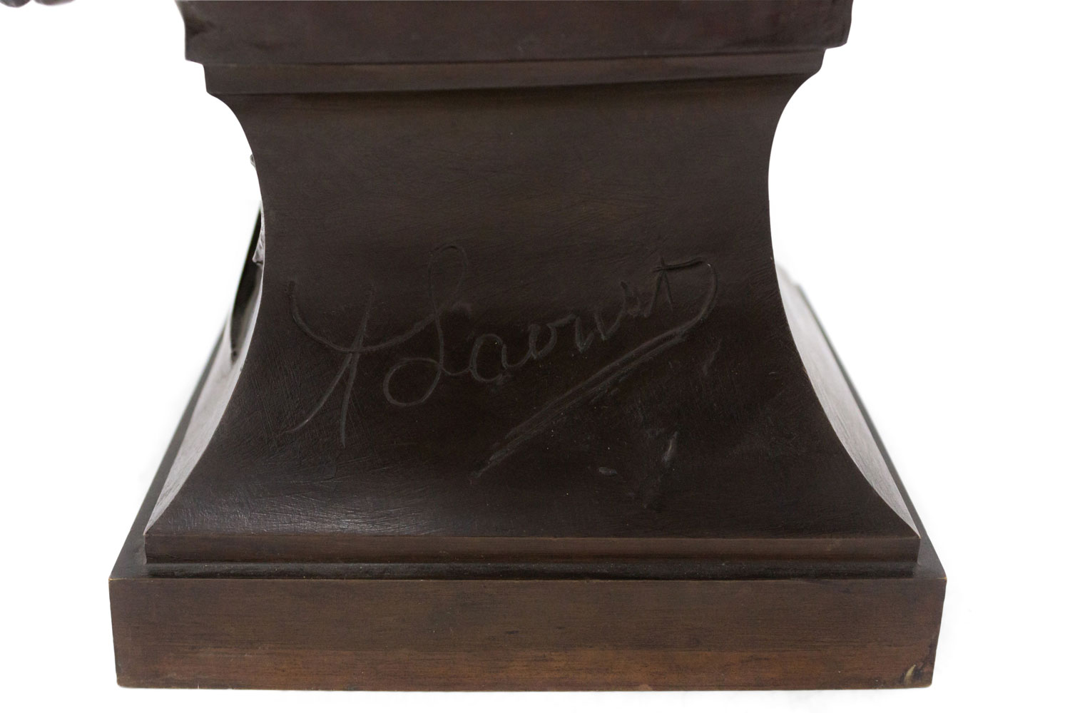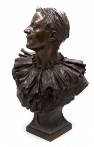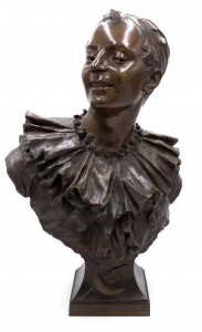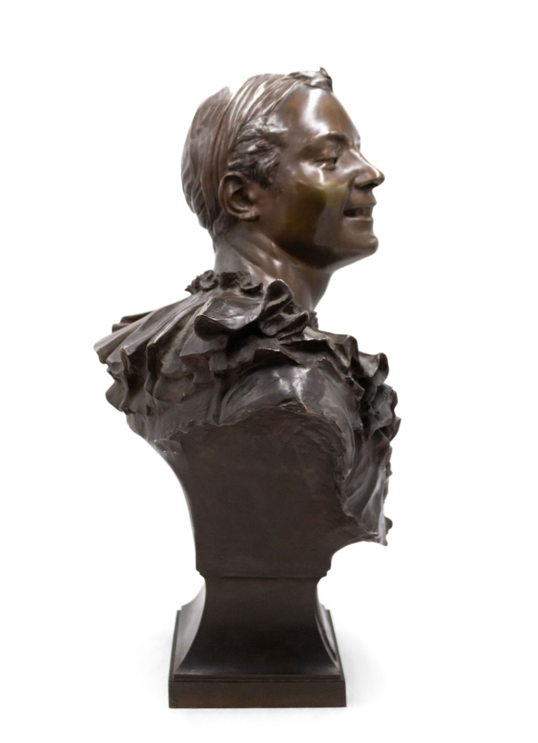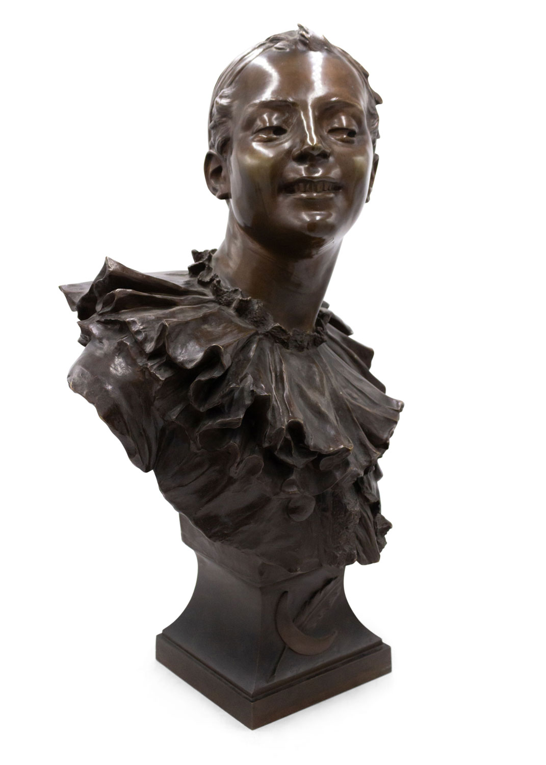French bronze life size bust of harlequin on square shaped base (19/20th Century) (signed, Andre Laoust).