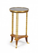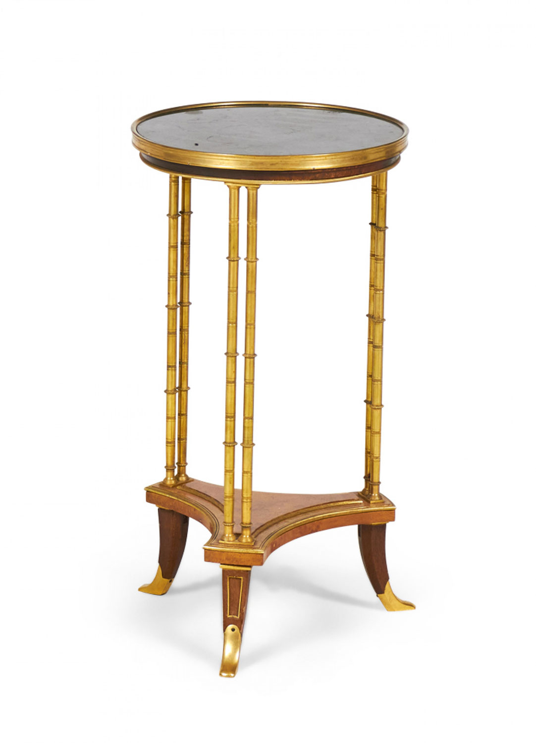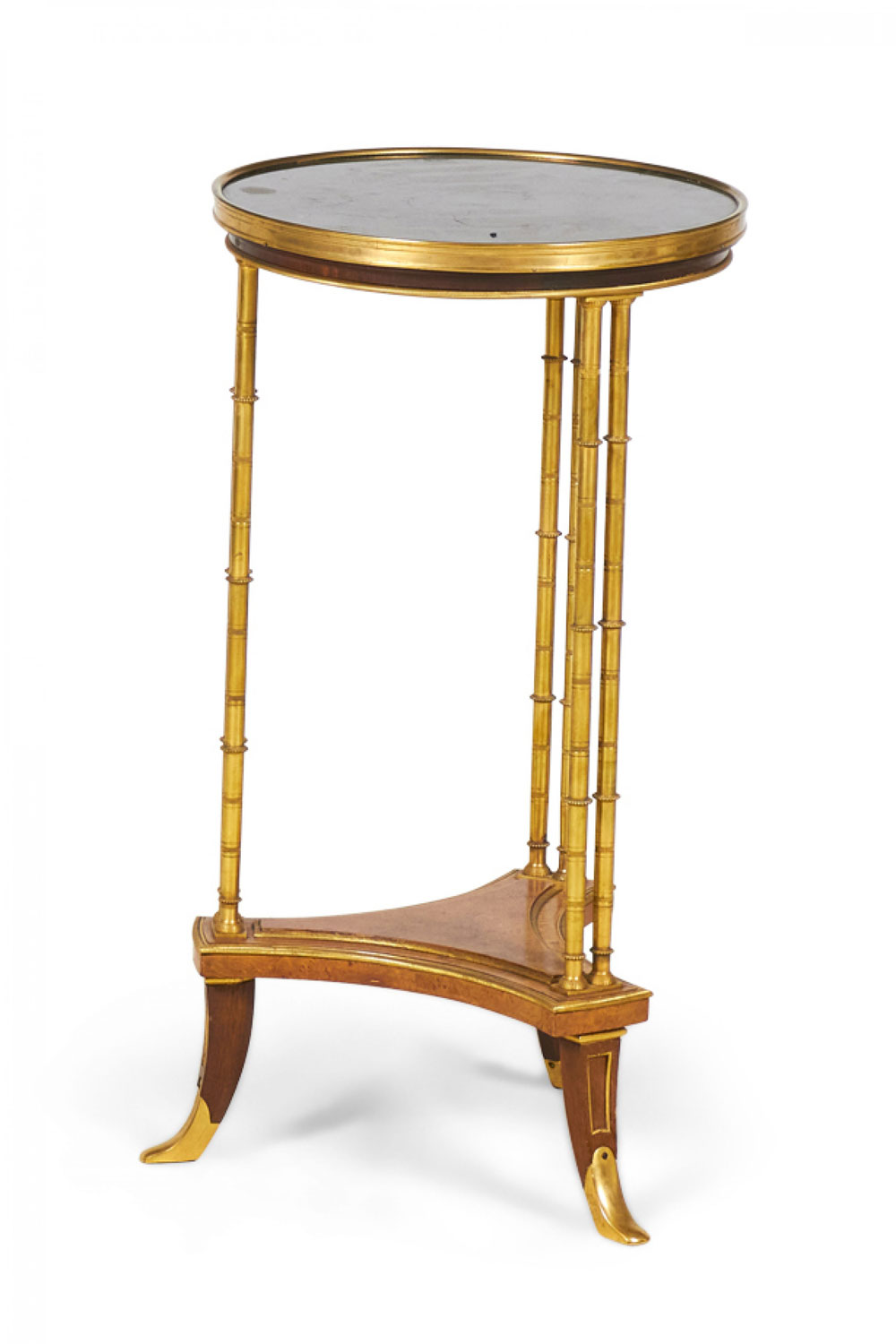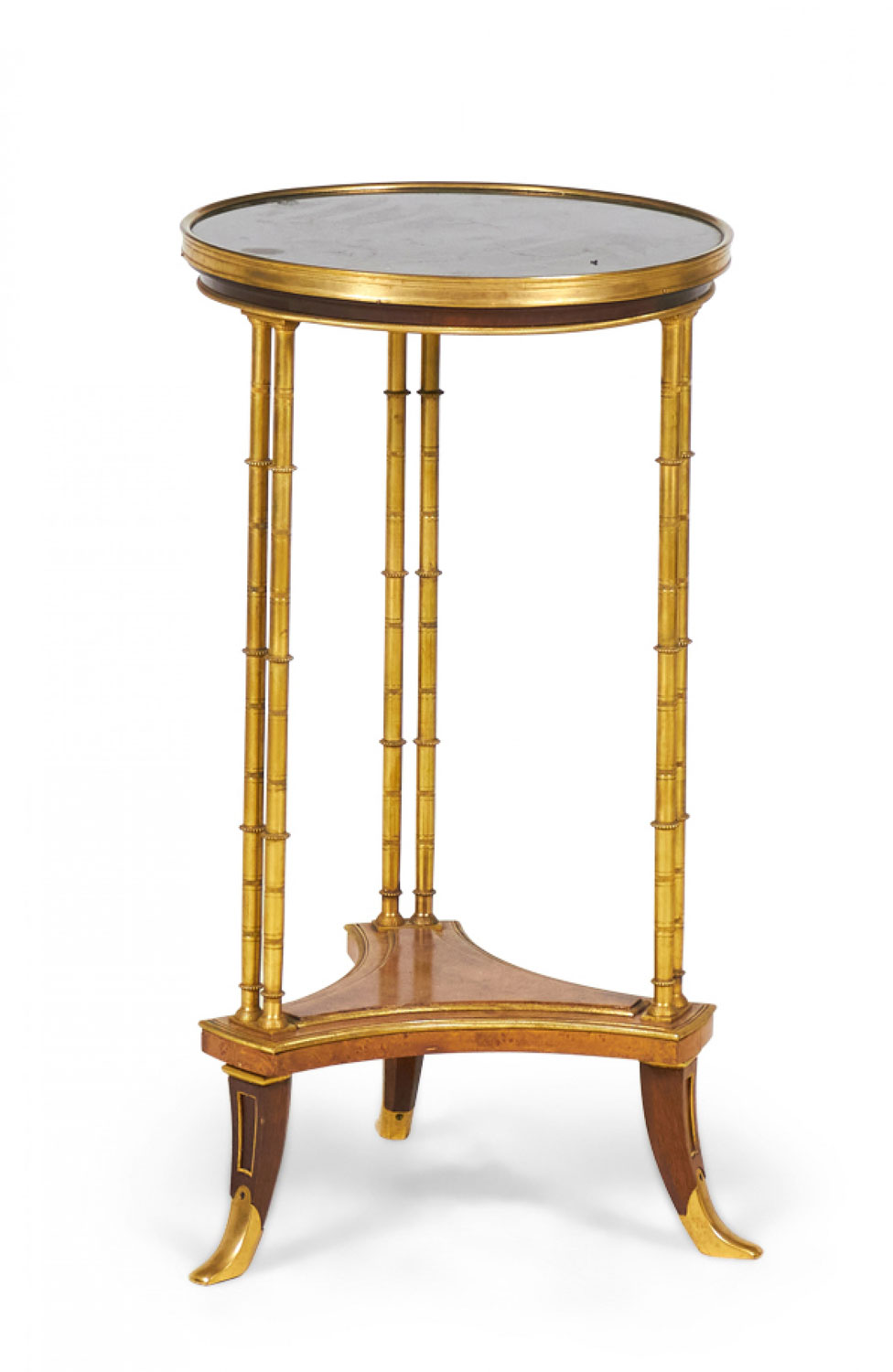 2 French Charles X-style (20th Century) circular bronze gueridon end table with 3 faux bamboo legs and a black marble top (PRICED EACH)(Similar tables: 056589).