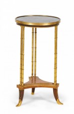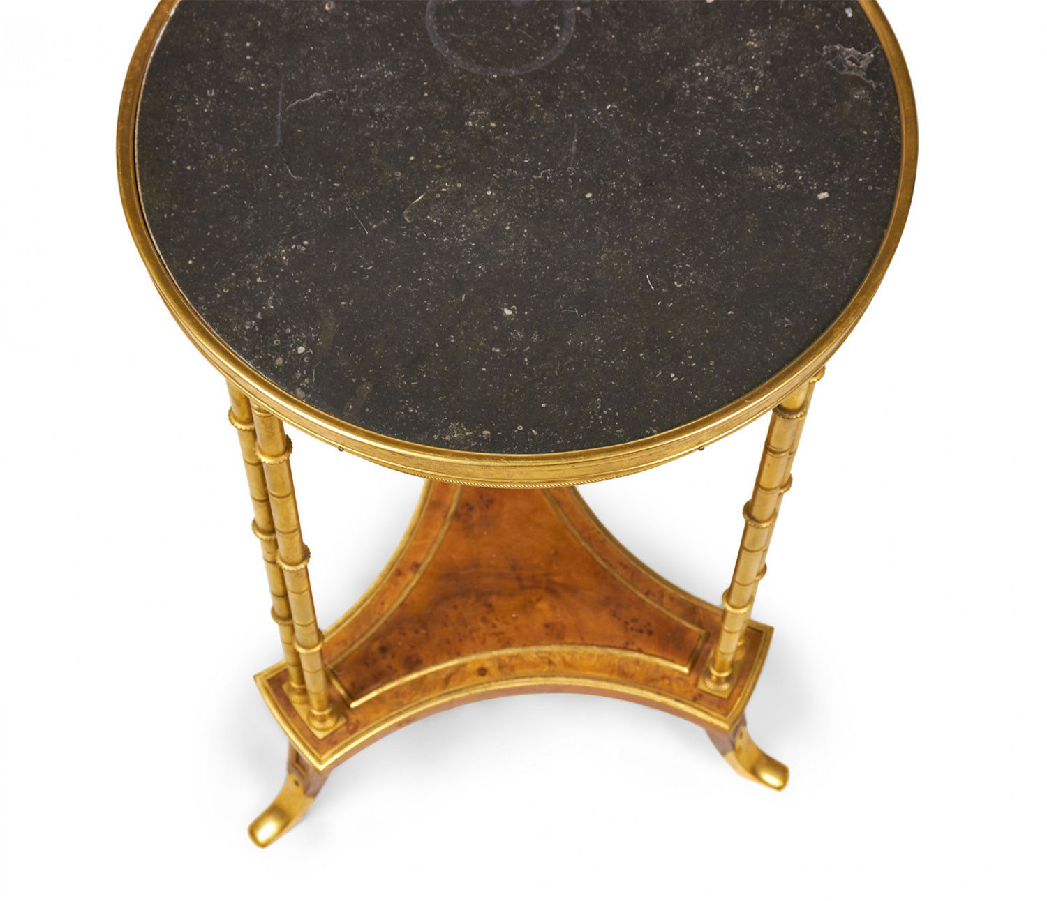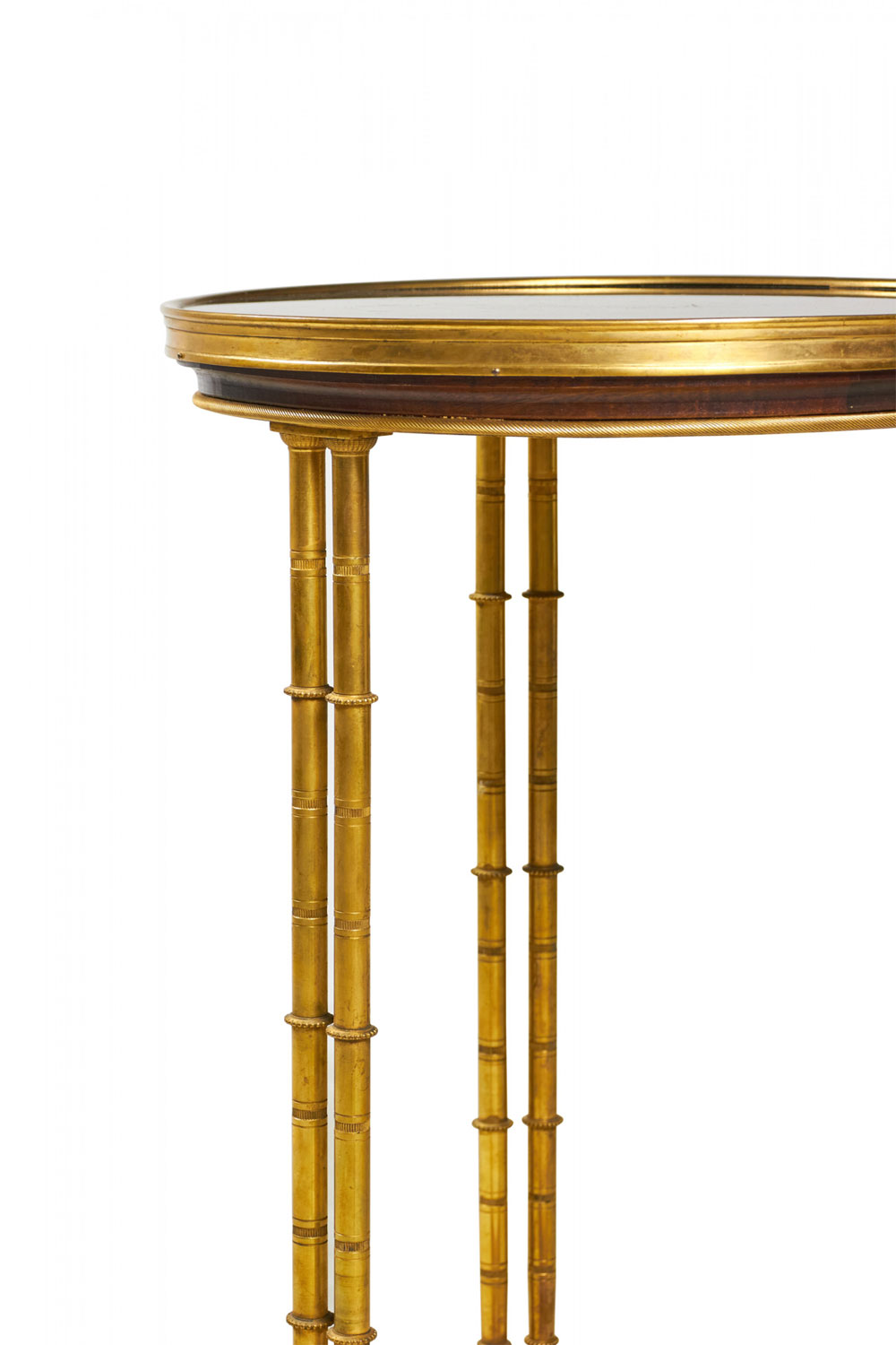 2 French Charles X-style (20th Century) circular bronze gueridon end table with 3 faux bamboo legs and a black marble top (PRICED EACH)(Similar tables: 056589)