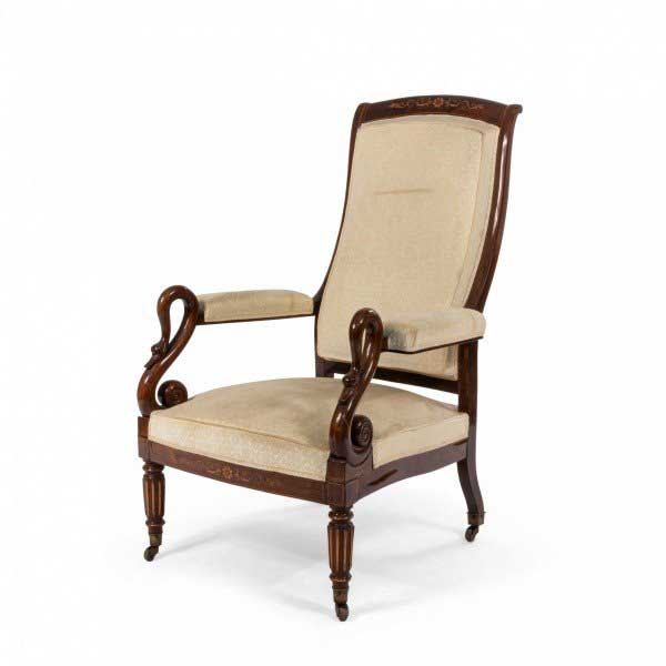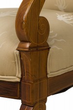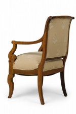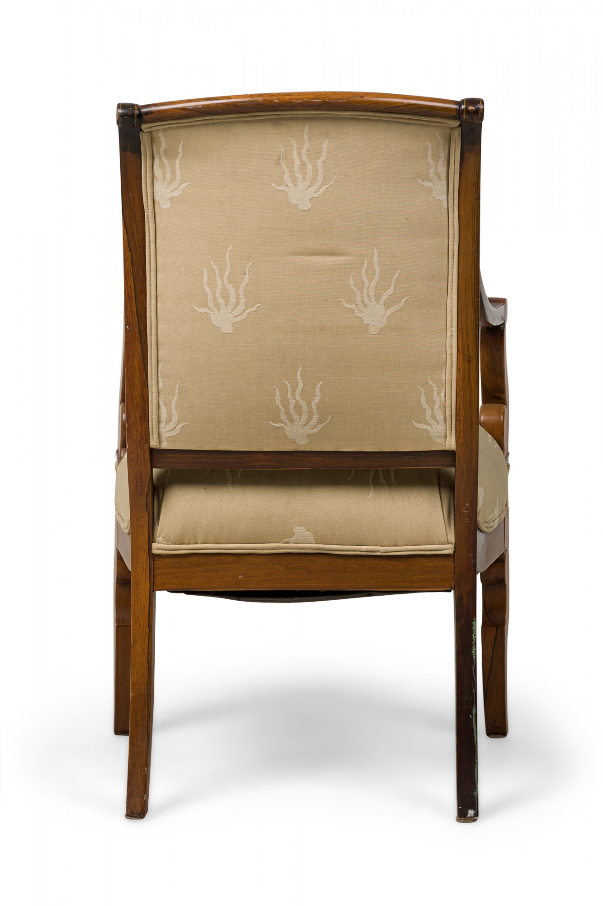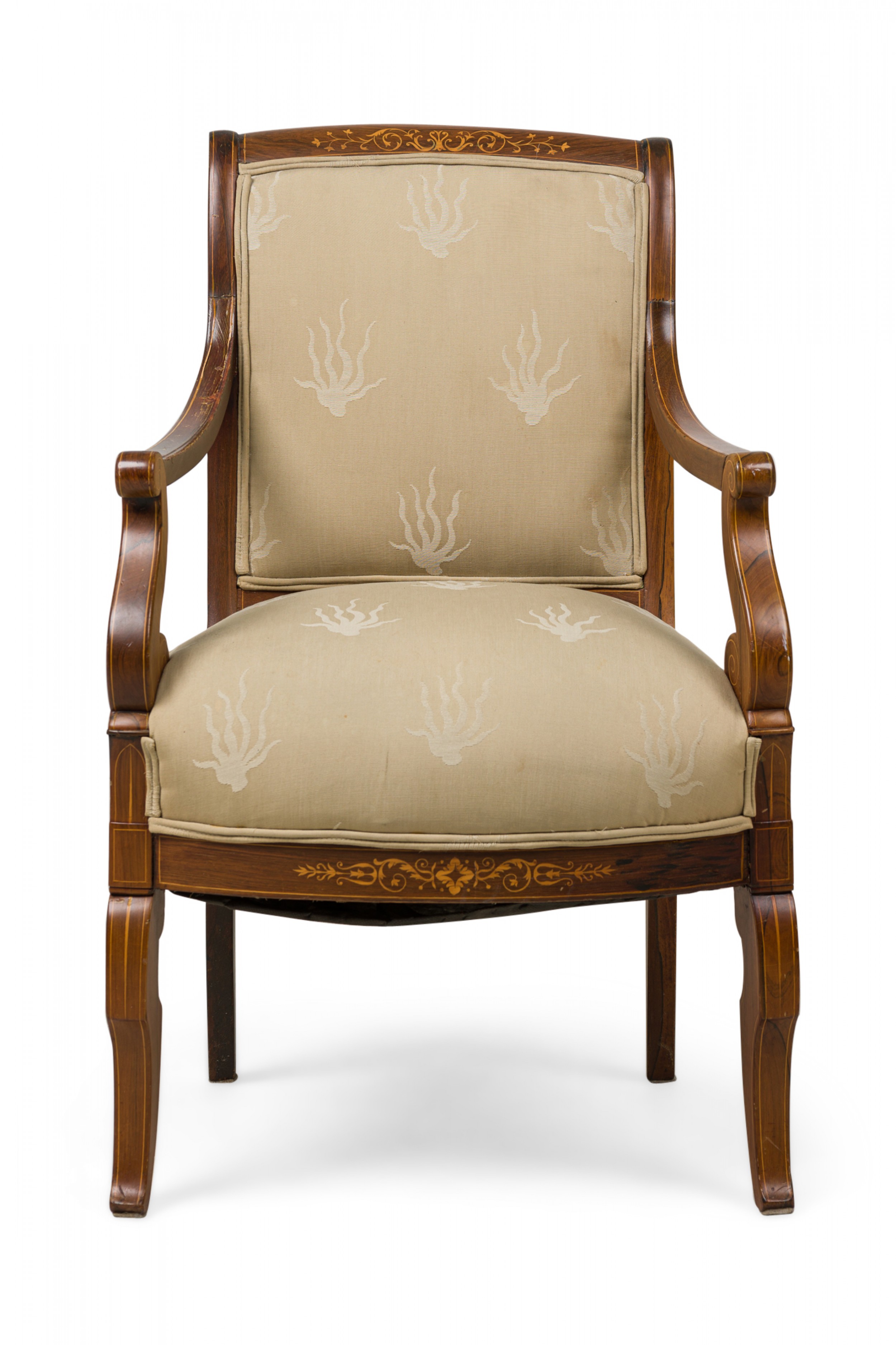 French Charles X Inlaid Mahogany and Walnut Open Armchair in Beige Upholstery