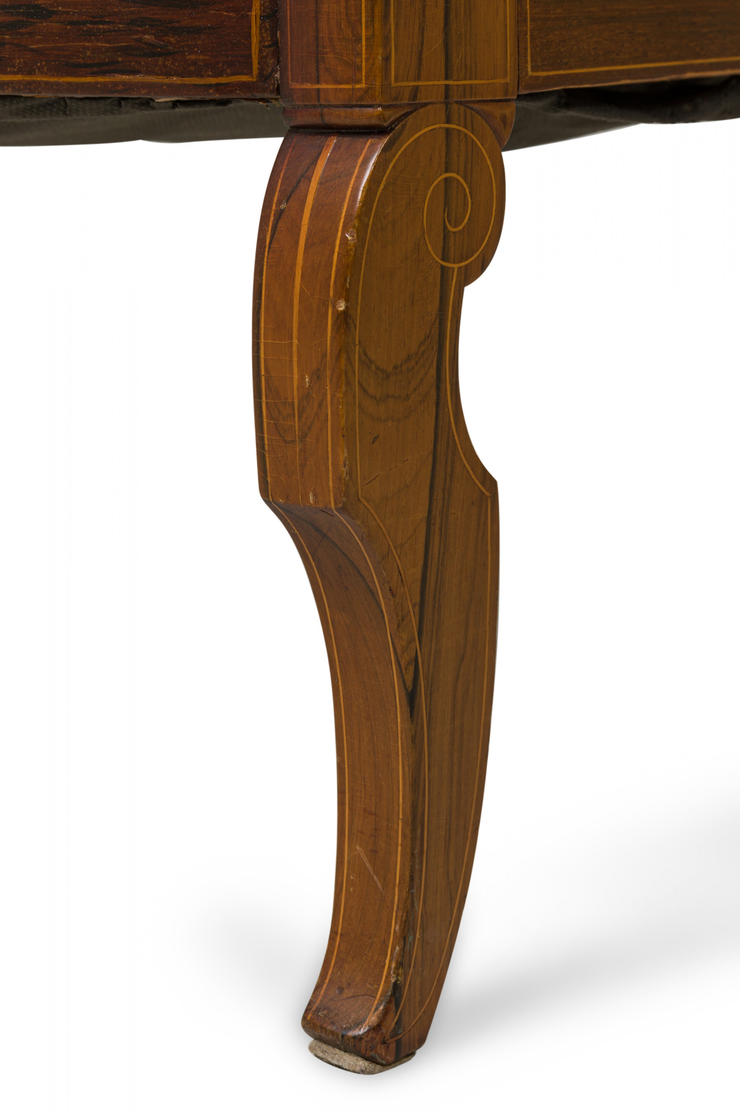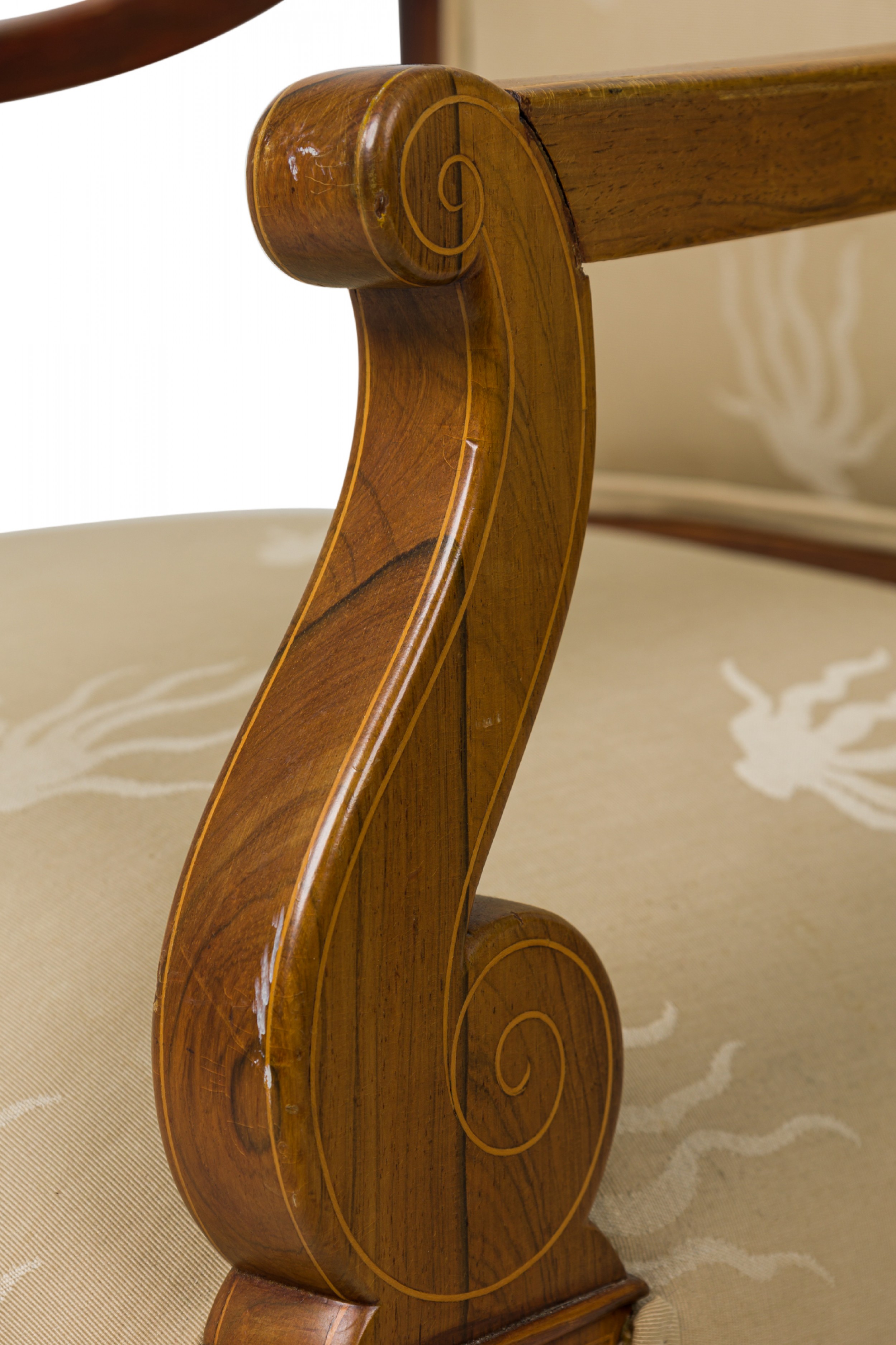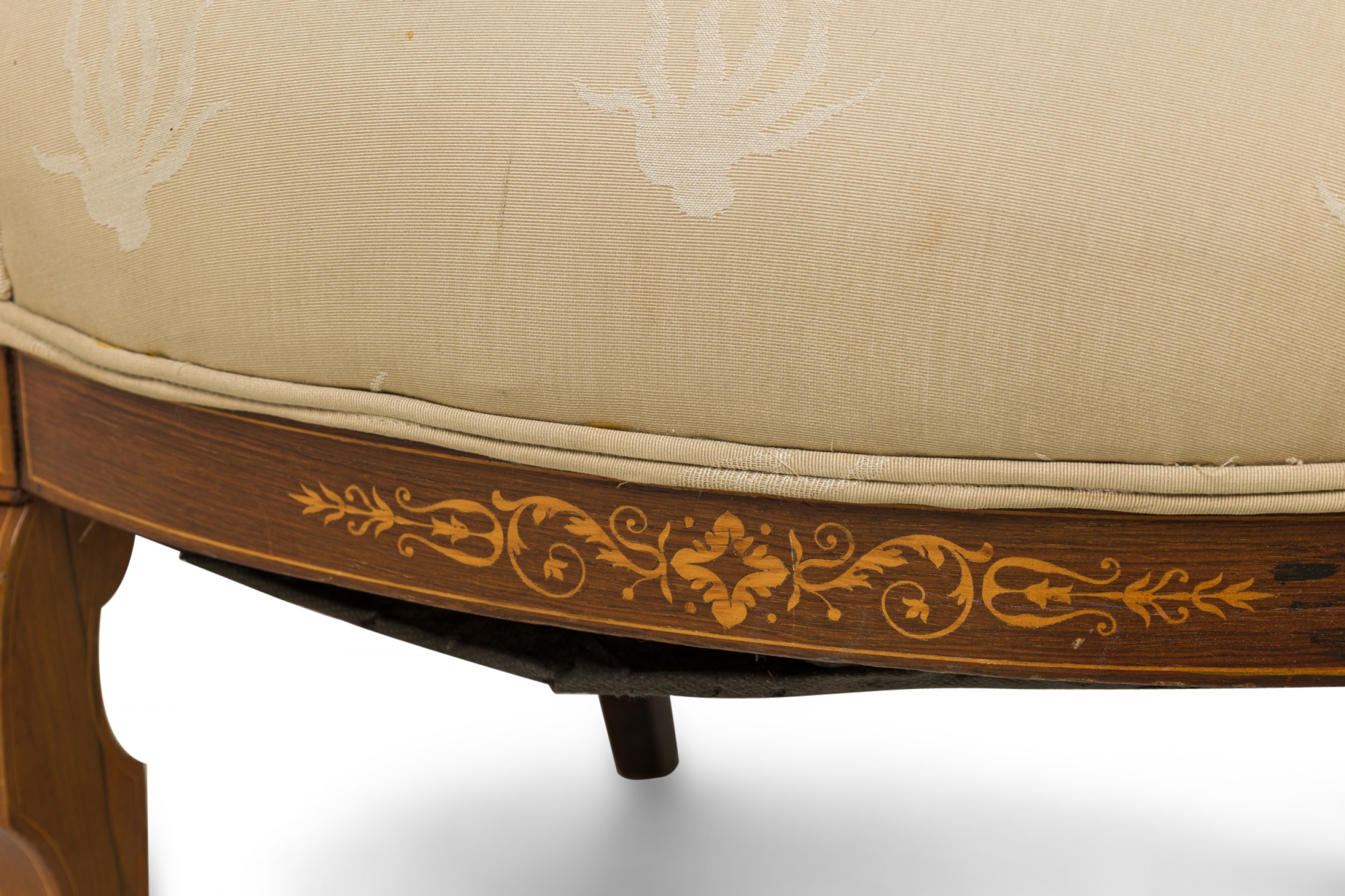 Style: French Materials & Techniques: Fabric, inlaid, inlay, mahogany, upholstered, walnut, wood Category: Seating Condition: Wear to finish on wood Good; Minor losses