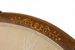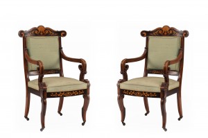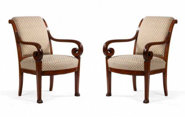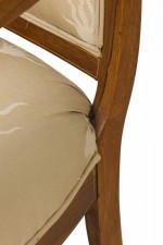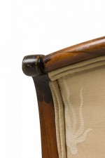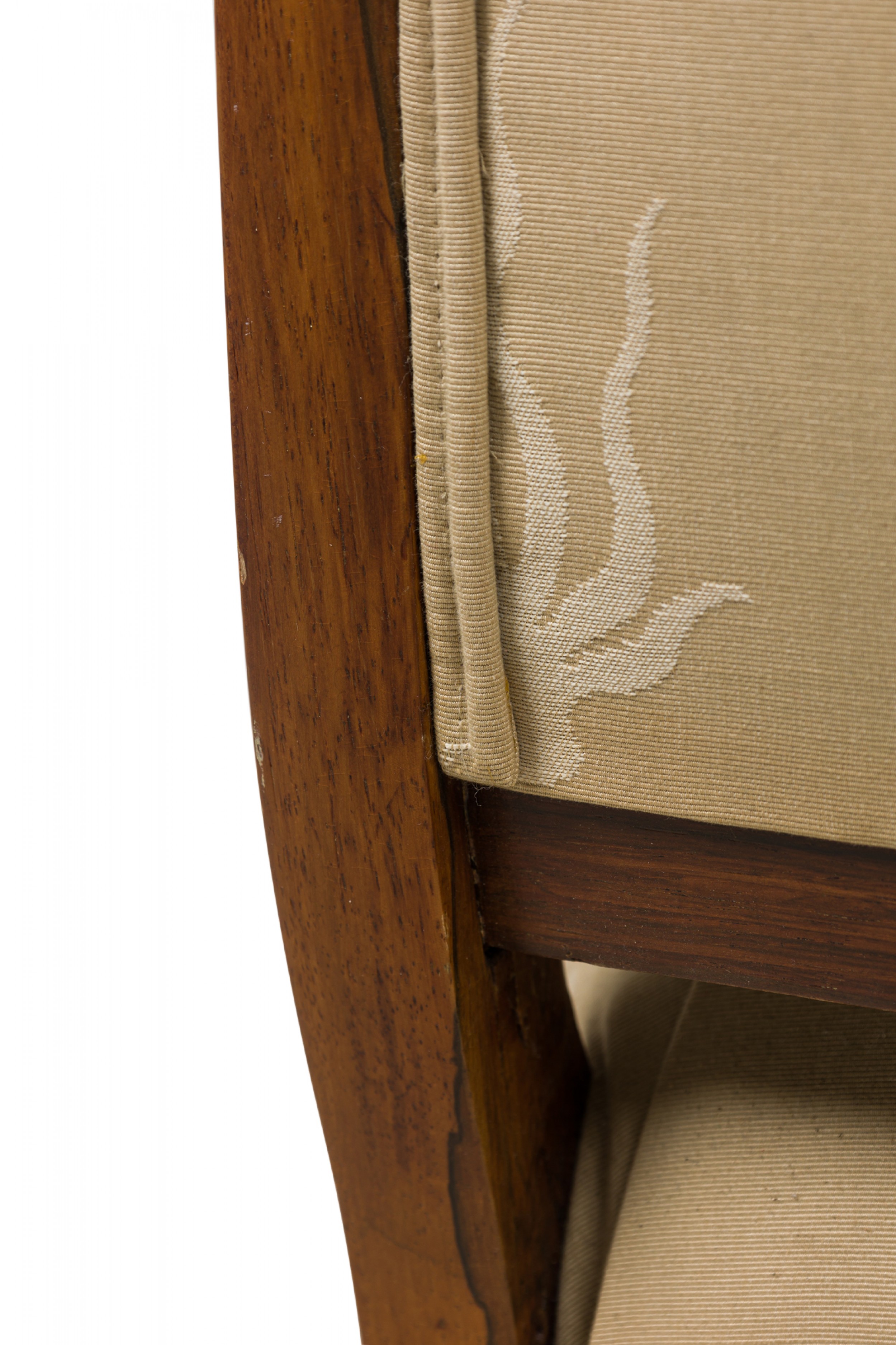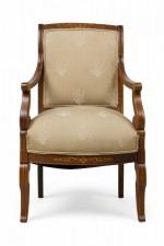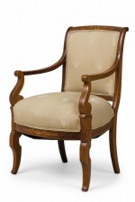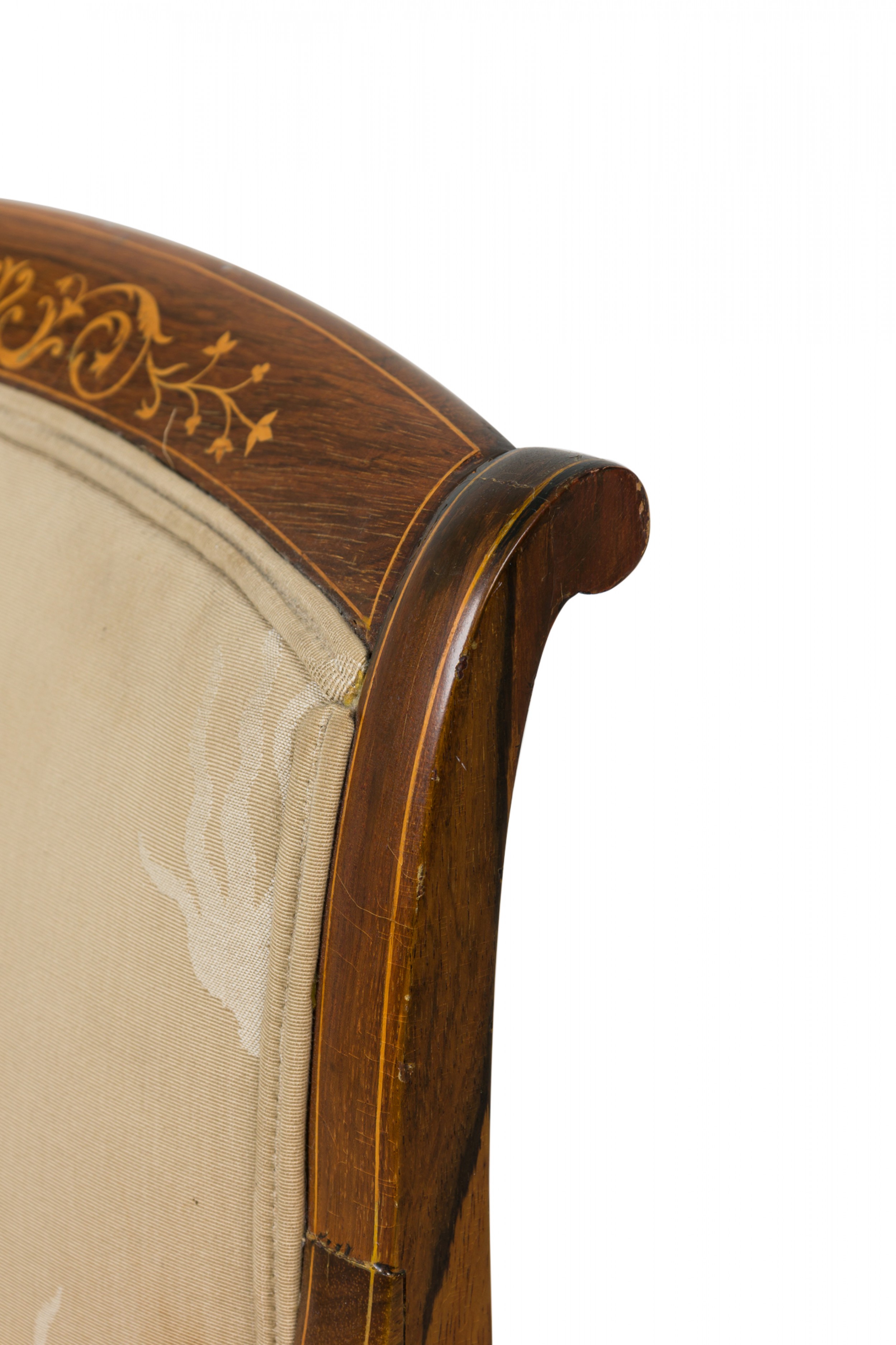 Style: French Materials & Techniques: Fabric, inlaid, inlay, mahogany, upholstered, walnut, wood Category: Seating Condition: Wear to finish on wood Good; Minor losses