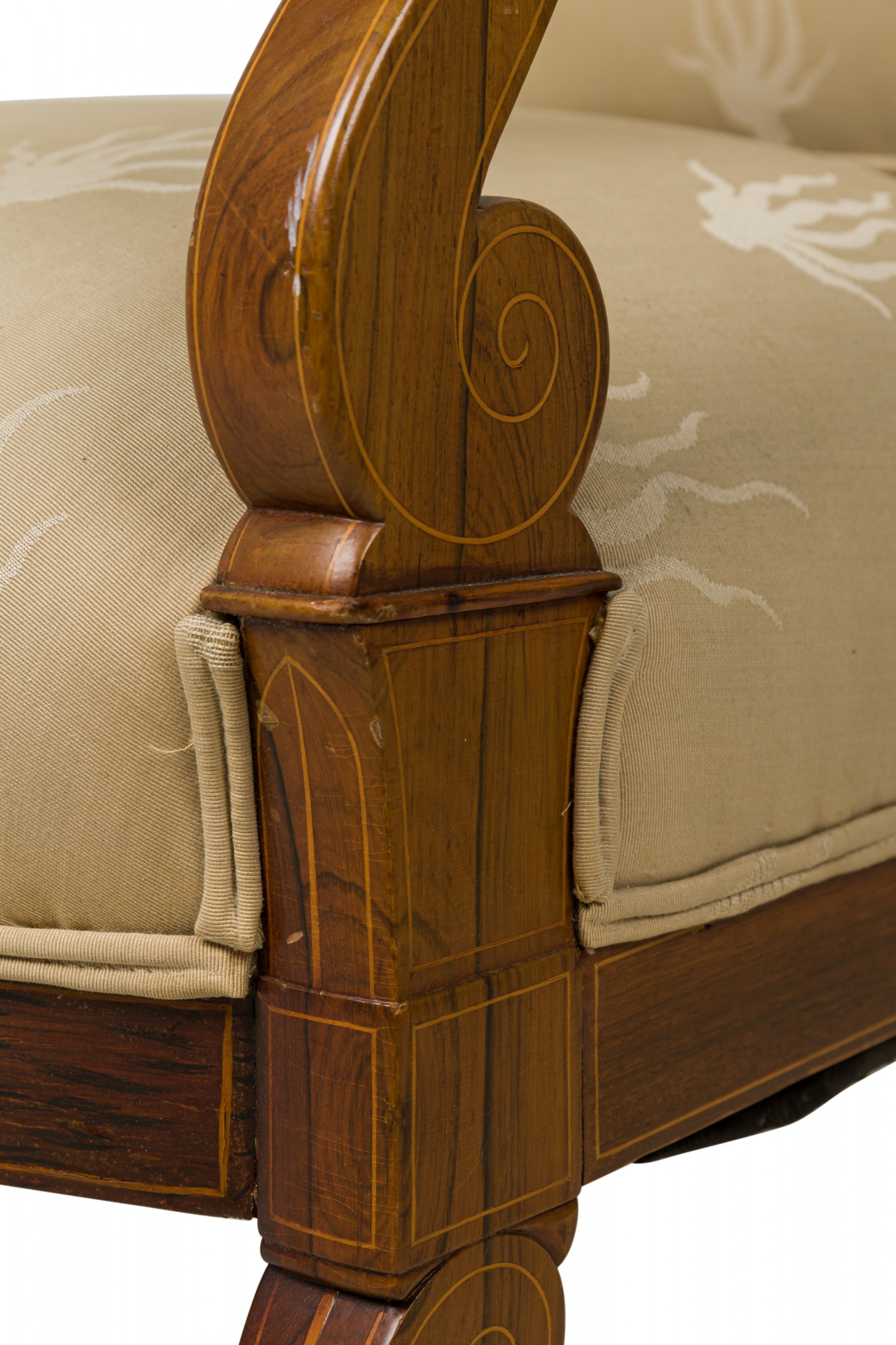 French Charles X (19th Century) open armchair featuring a scroll form mahogany frame with sweeping arms, inlaid walnut parquetry on the backrest and front friezes, upholstered in a two-toned beige patterned fabric with double piping, standing on stylized cabriole front legs and sabre back legs, the front and sides highlighted with contrasting inlay.