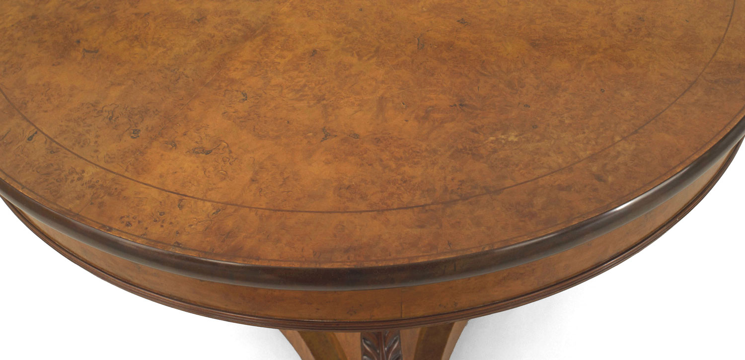 French Charles X (1830s) amaranth wood center table with a banded inlaid round top resting on a triangular pedestal base with mahogany carved trim and reclining lions.