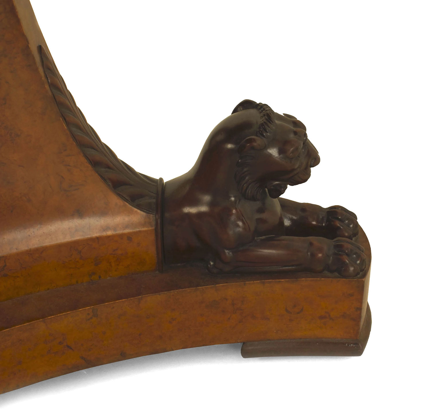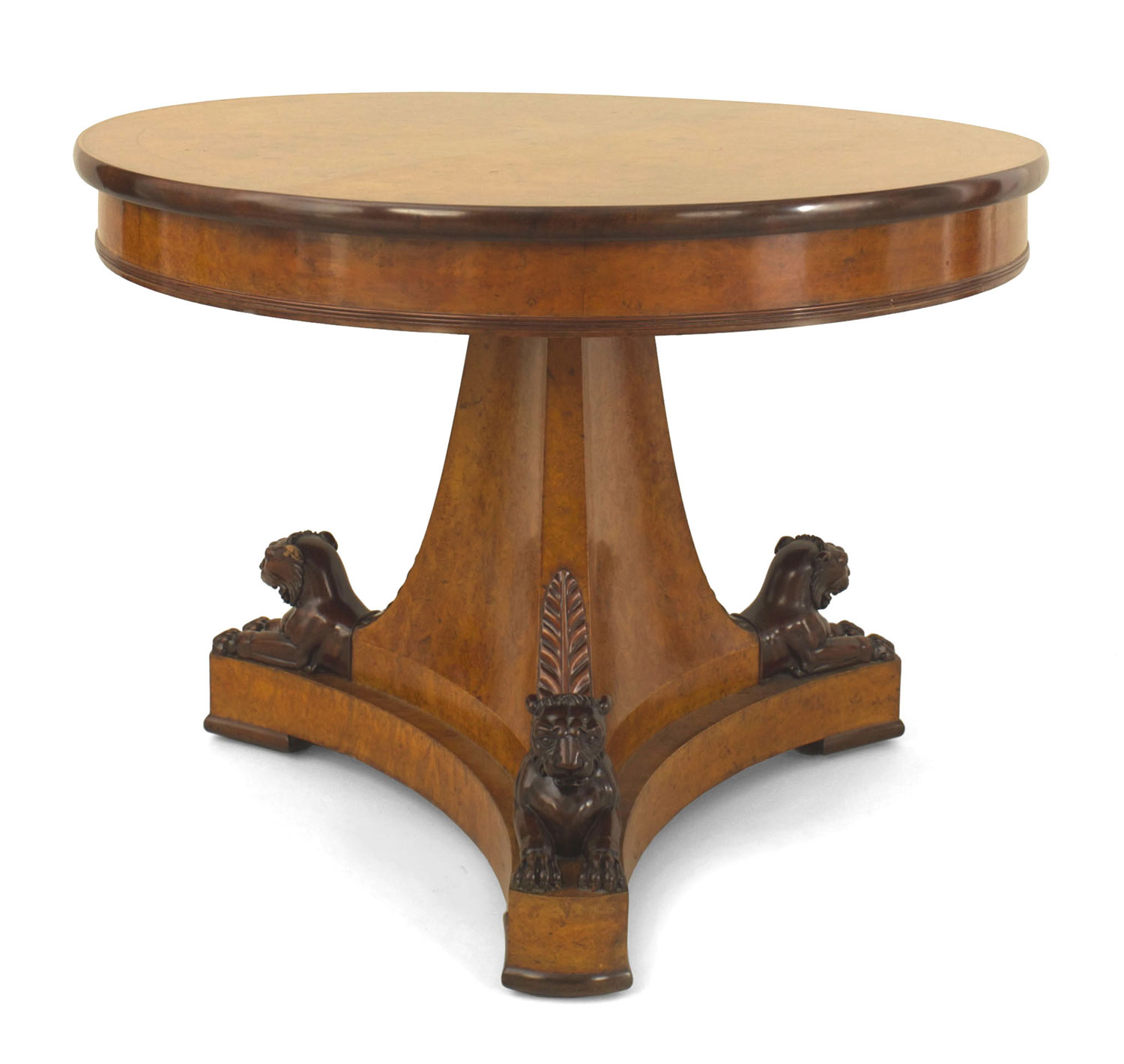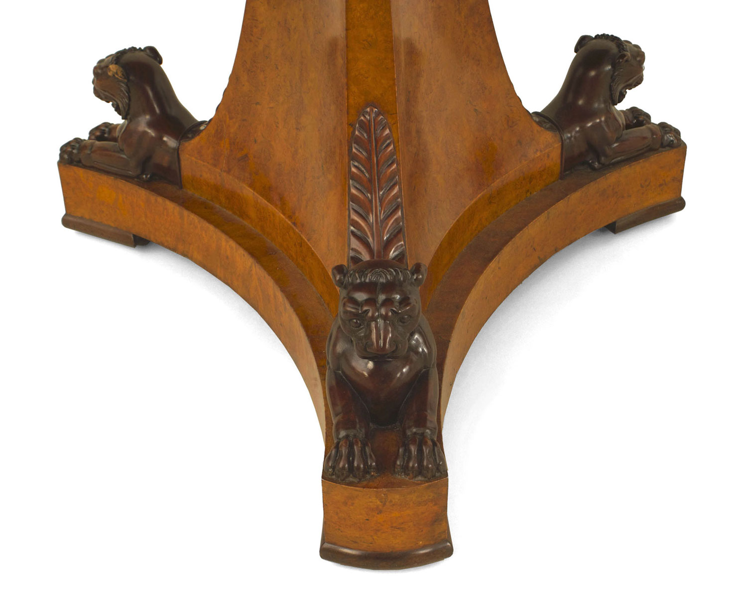 French Charles X (1830s) amaranth wood center table with a banded inlaid round top resting on a triangular pedestal base with mahogany carved trim and reclining lions..