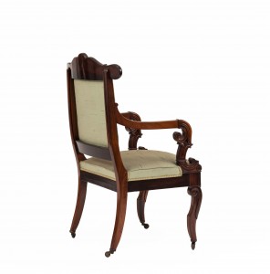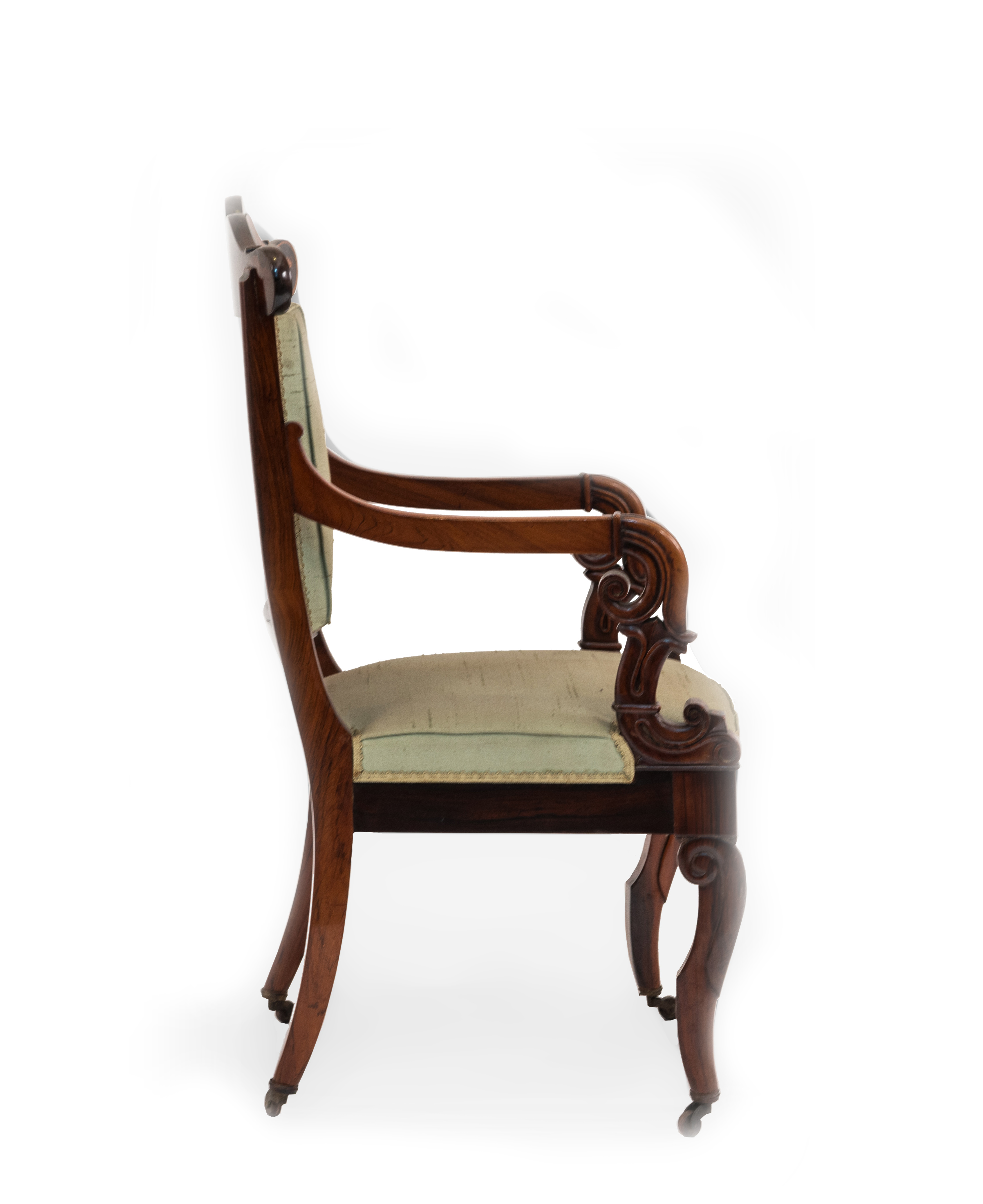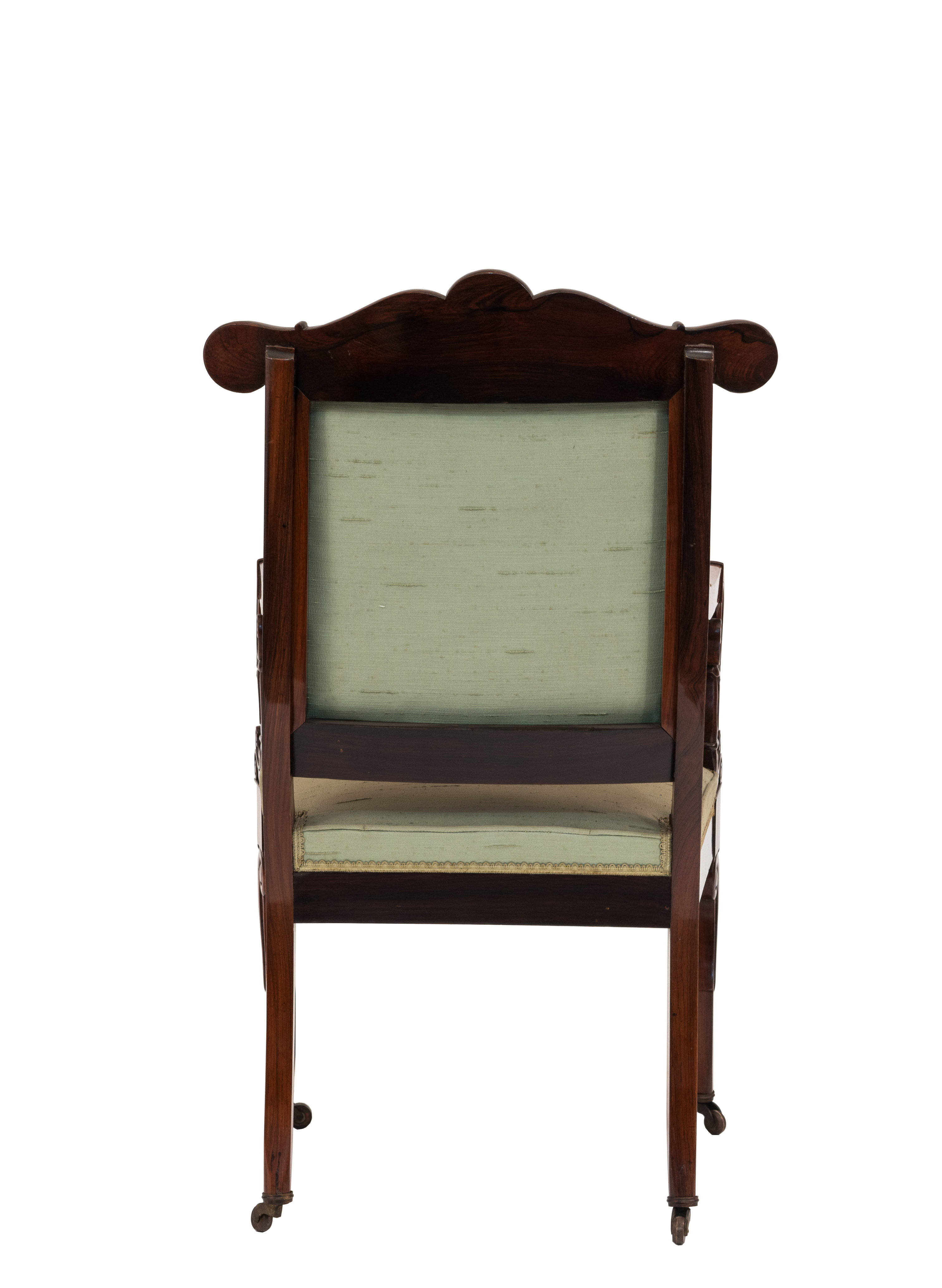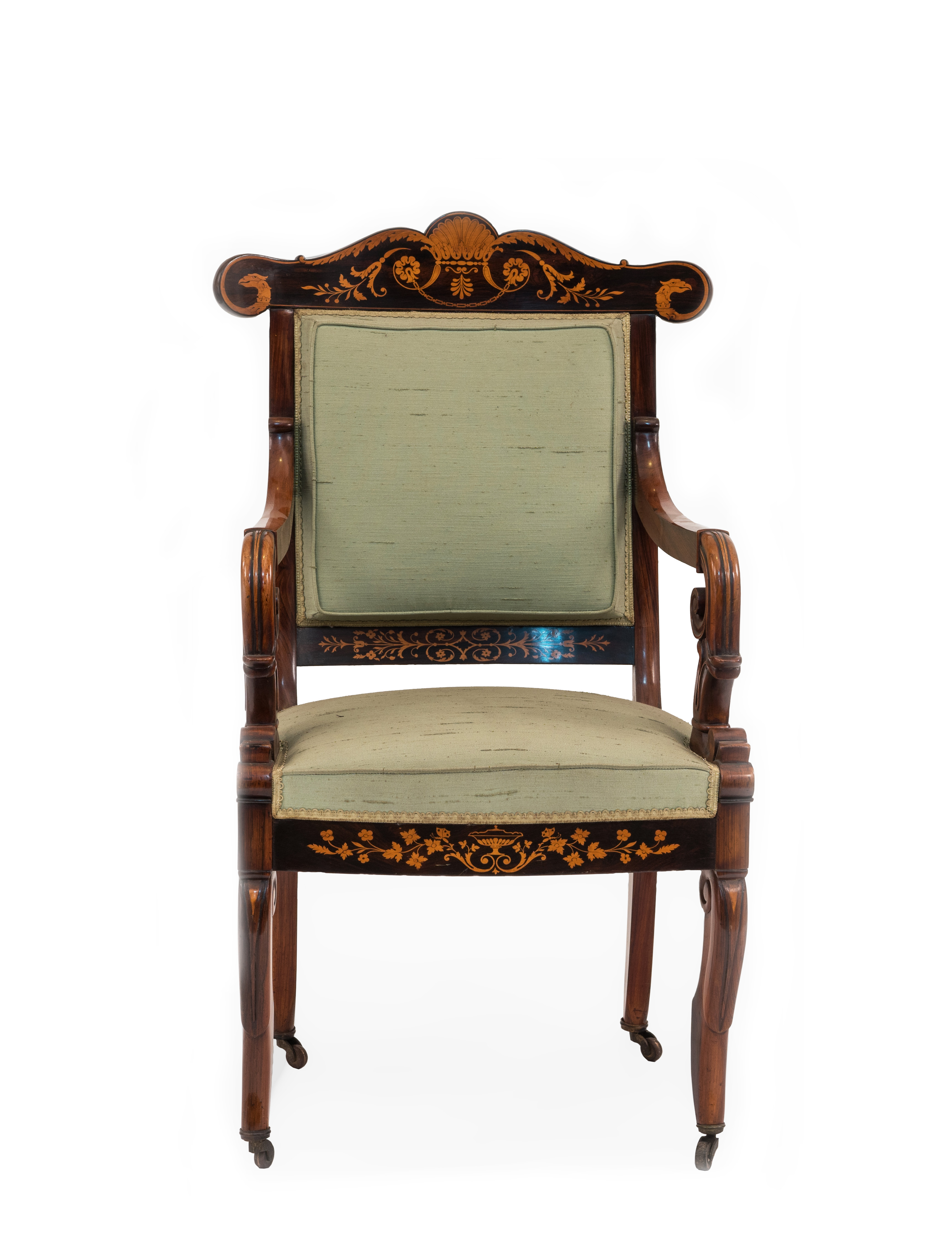PAIR of French Charles X style rosewood and inlaid Armchairs with floral design and ears on back with green upholstery (Circa 1840).