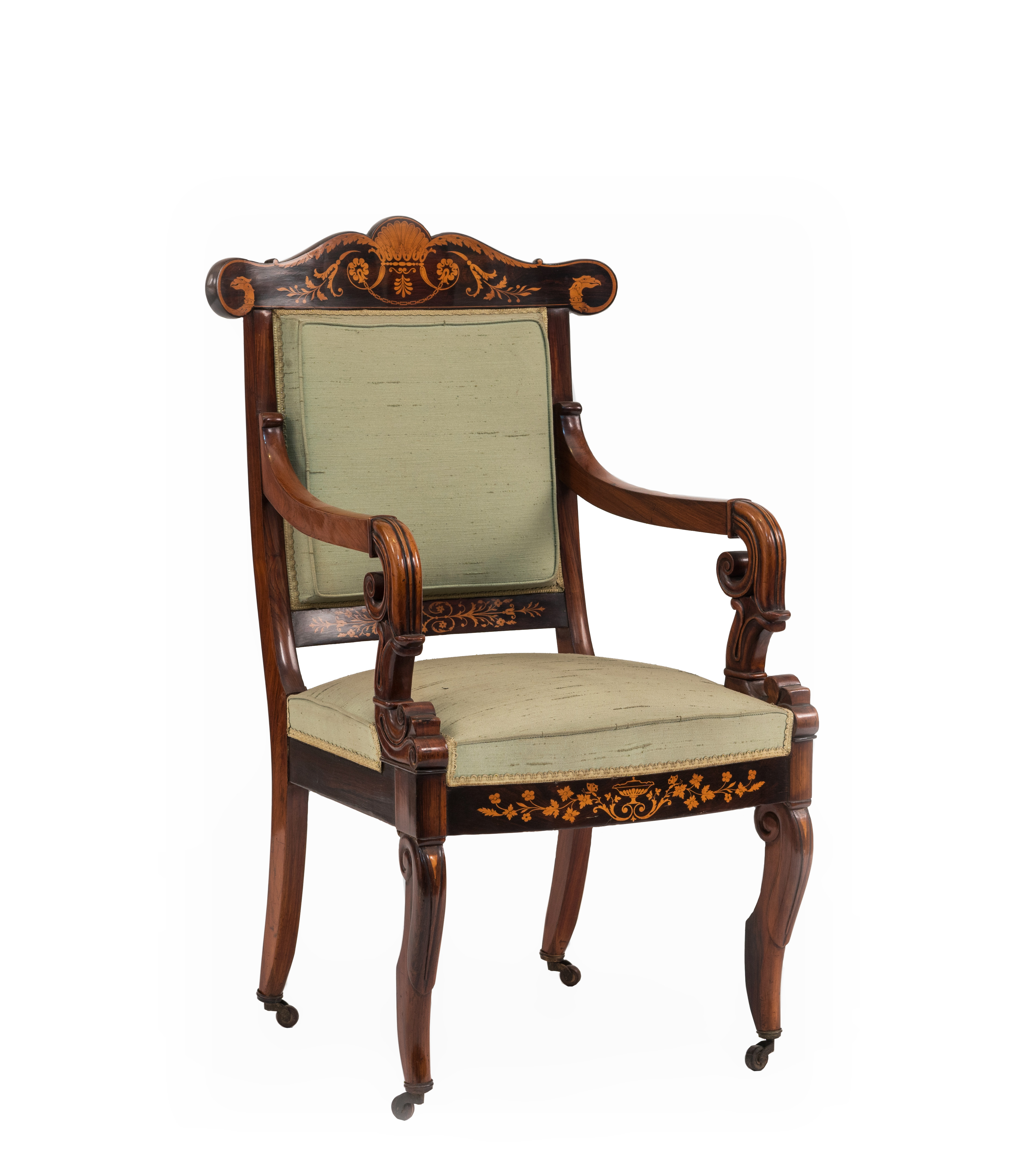 Style: French Materials & Techniques: Wood, rosewood, inlaid Category: Seating Condition: Antique condition. Shows wear and tear.