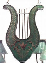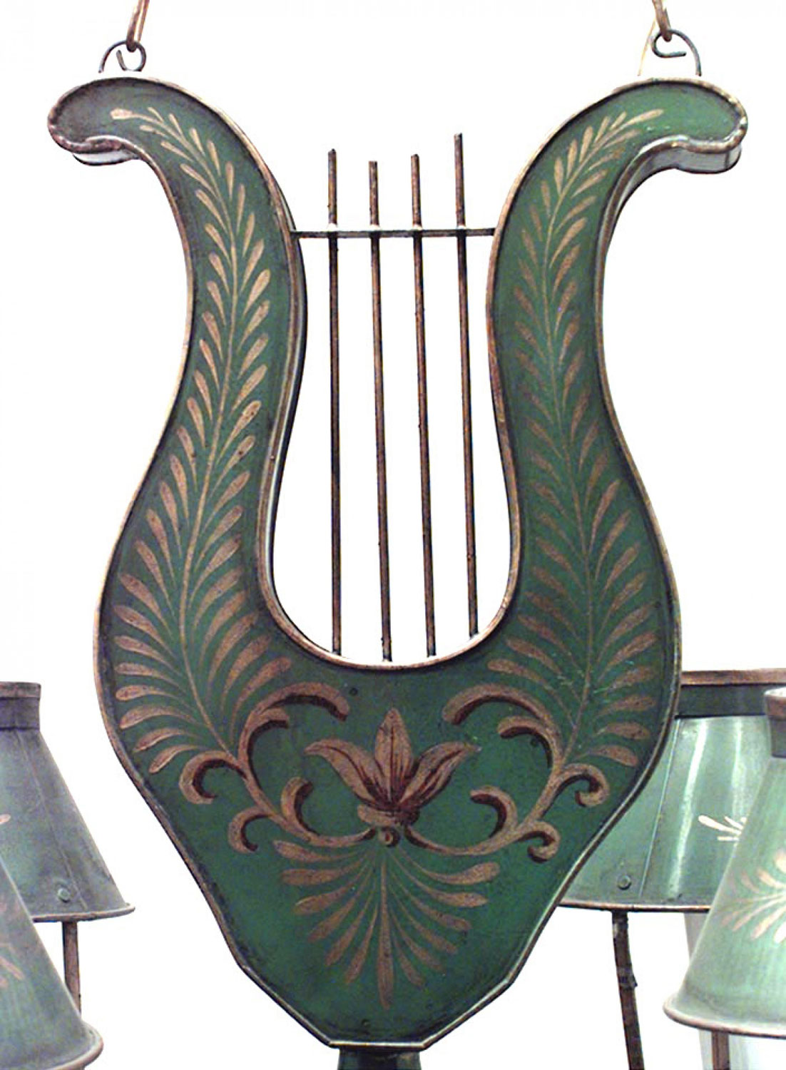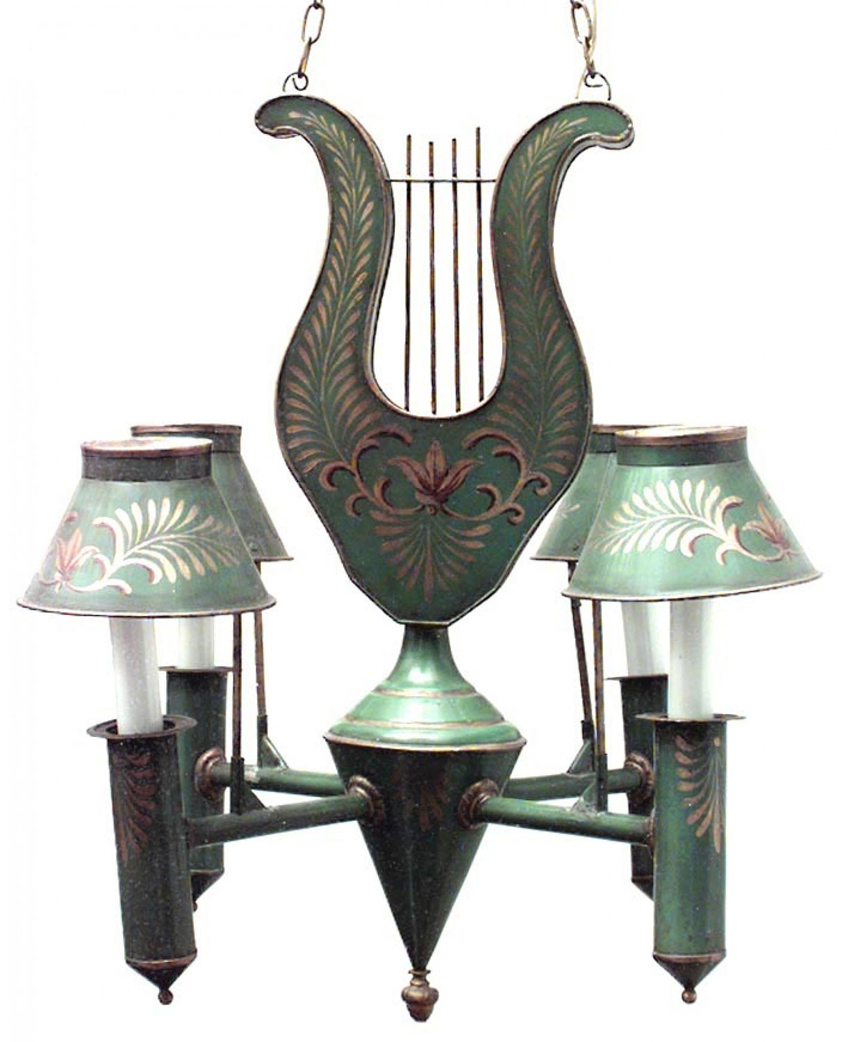French Directoire Style Green Tole and Gilt Lyre Chandelier