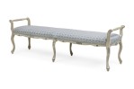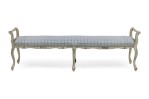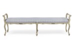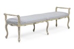 French Directoire style distressed white painted bench with geometric pattern upholstery, carved scrolled arms with shell motifs ending with cabriole legs.