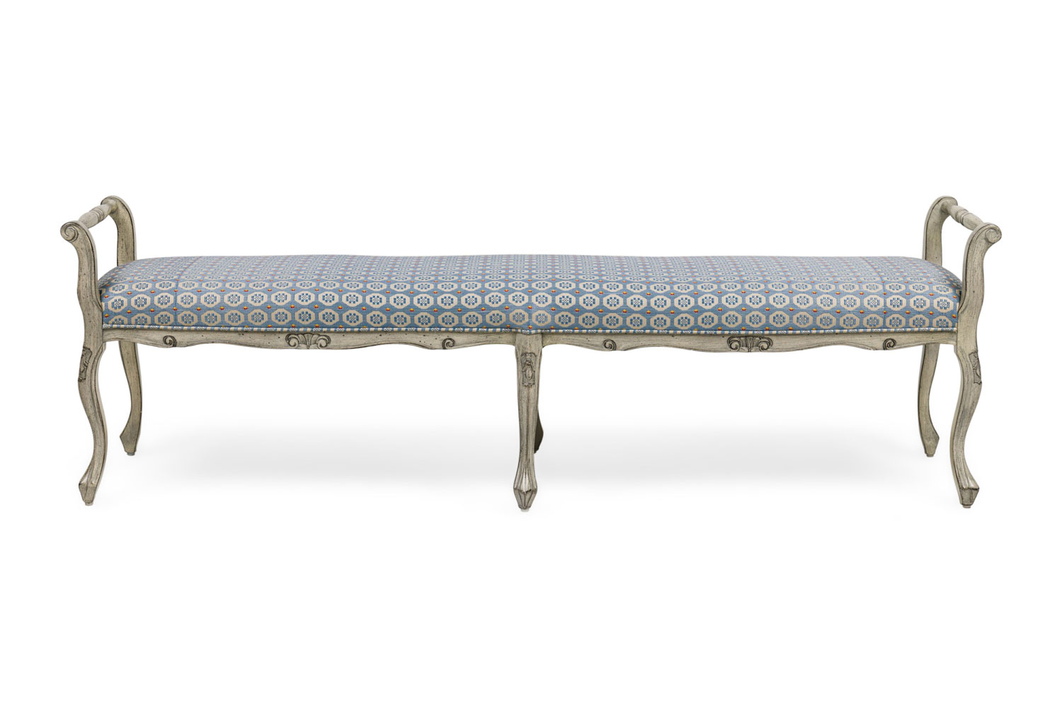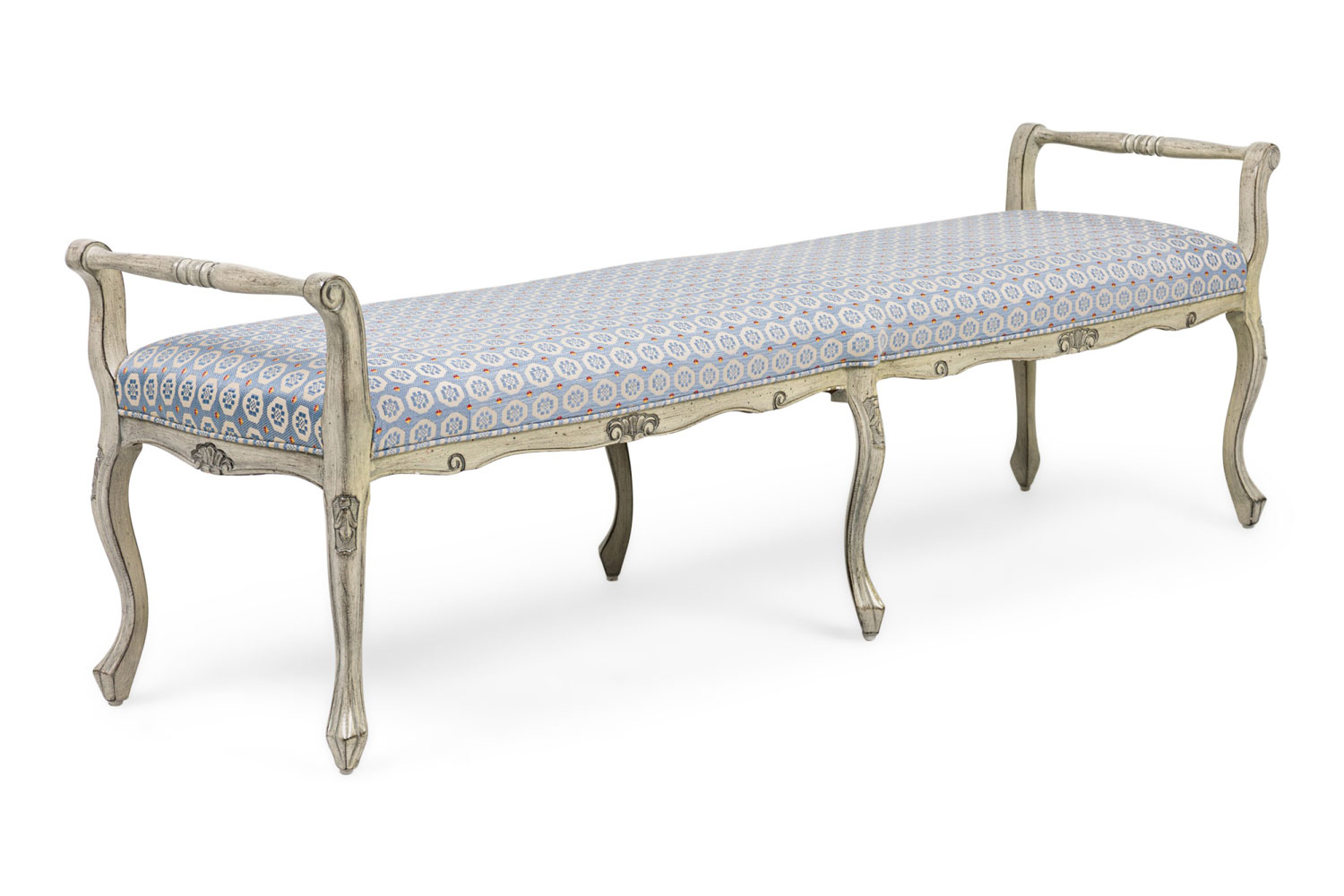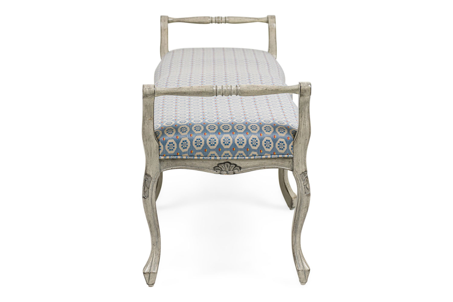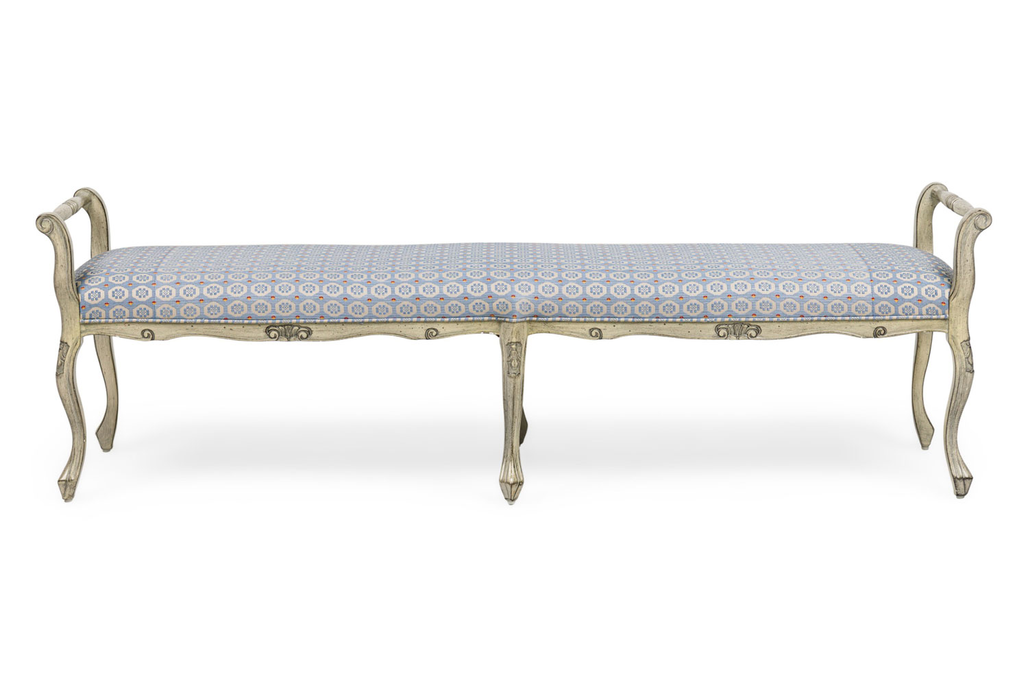 French Directoire style distressed white painted bench with geometric pattern upholstery, carved scrolled arms with shell motifs ending with cabriole legs