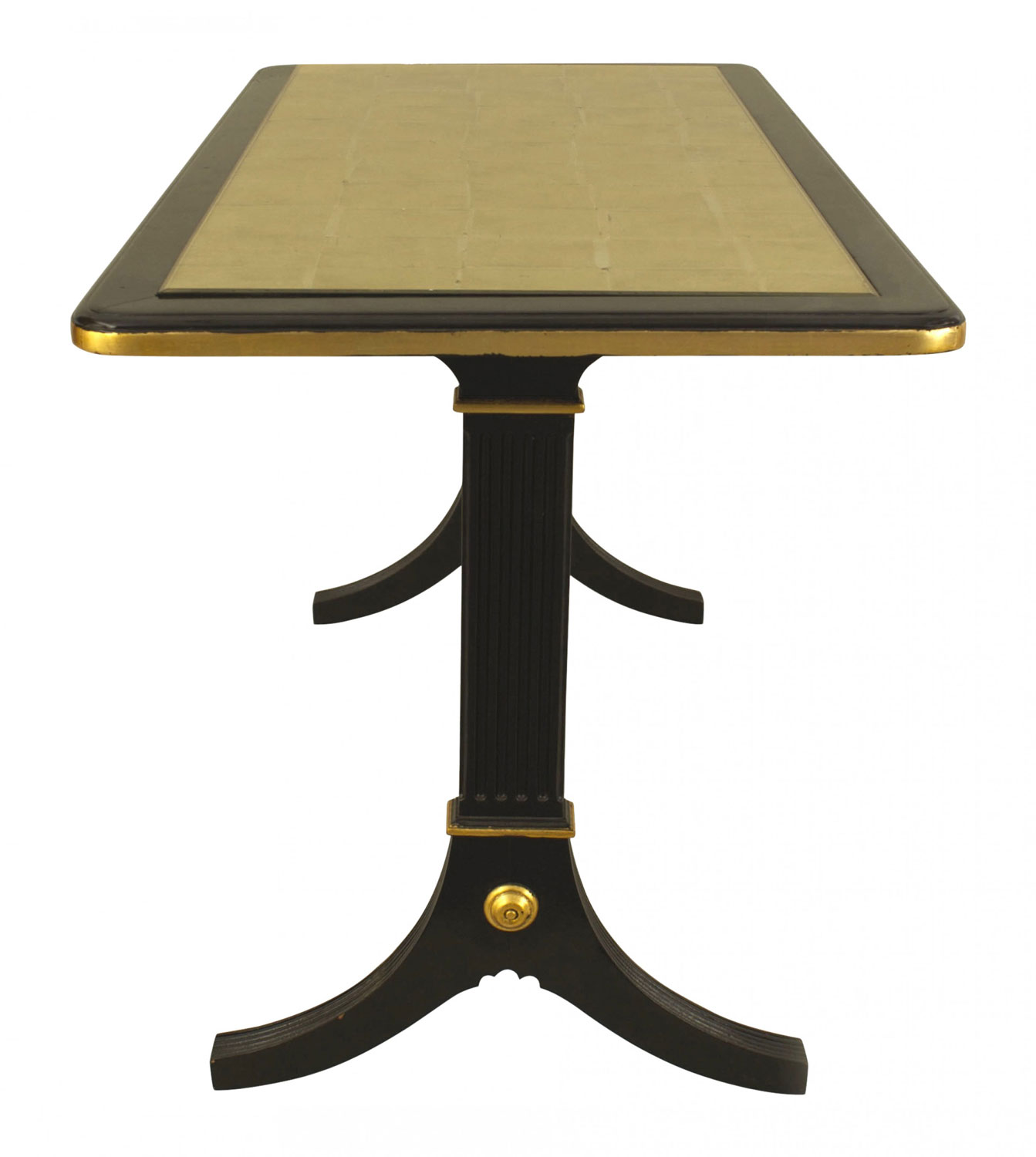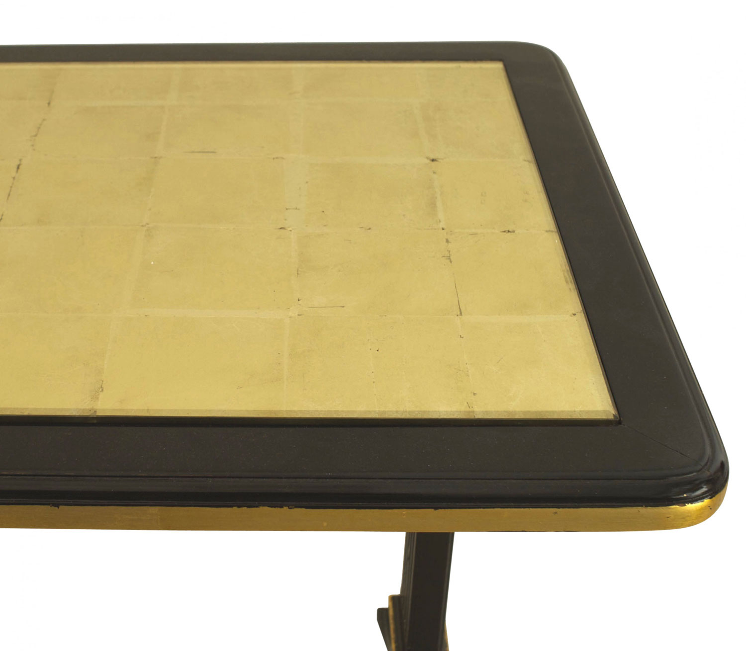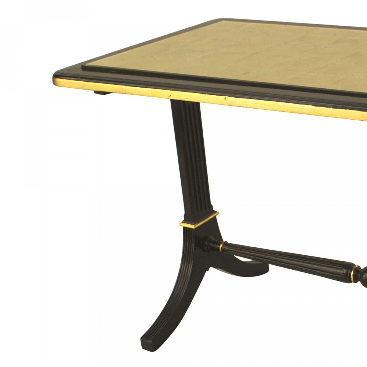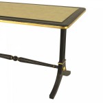 French Mid-Century (1940s) ebonized and gilt trimmed rectangular coffee table with pedestal sides connected with a stretcher and an inset gilt glass top. (stamped: JANSEN)