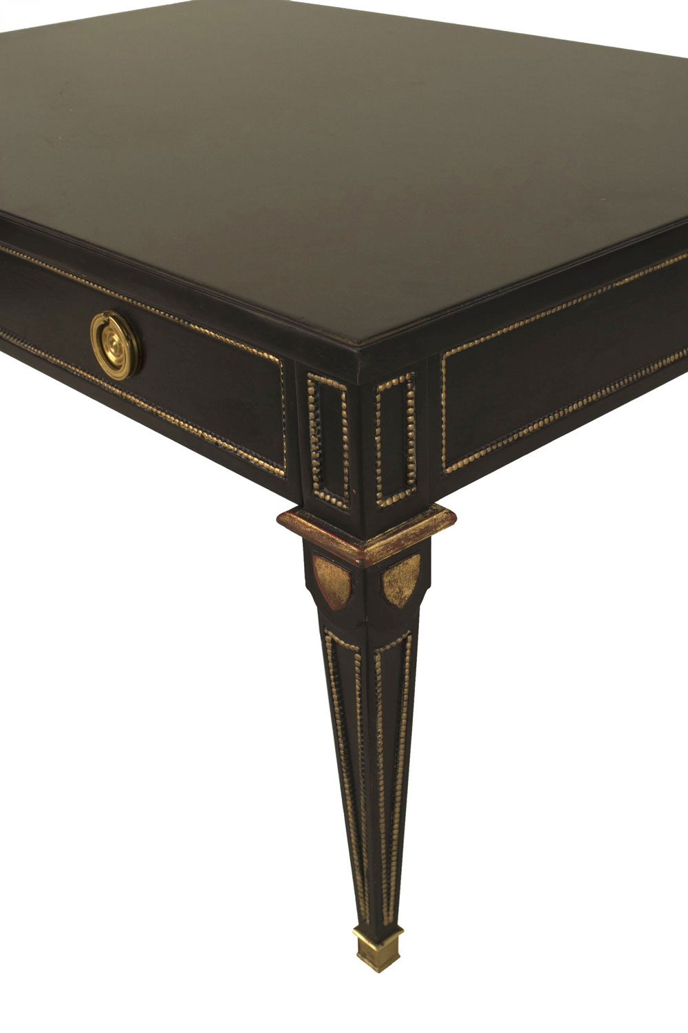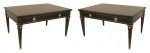 2 French Louis XVI-style (1940s) rectangular ebonized and gilt coffee tables with one drawer, bronze trim, and square tapered legs. (stamped: JANSEN) (PRICED EACH).