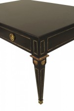 2 French Louis XVI-style (1940s) rectangular ebonized and gilt coffee tables with one drawer, bronze trim, and square tapered legs. (stamped: JANSEN) (PRICED EACH)
