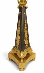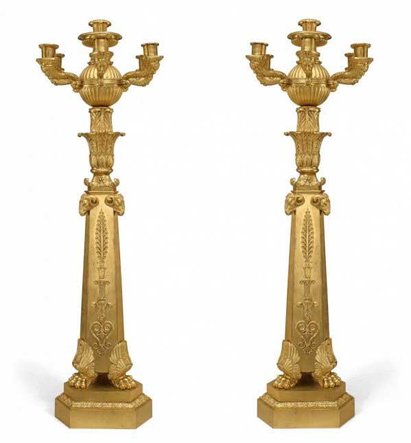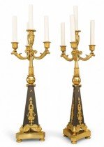 Style: French Materials & Techniques: Bronze, gilt / giltwood Category: Accessories/Décor/Bric-a-Brac, Dining Room Condition: Triangular base 6.25" each side Repairs to 2 candleholder cups; holes drilled for wiring Good; Wear consistent with age and use