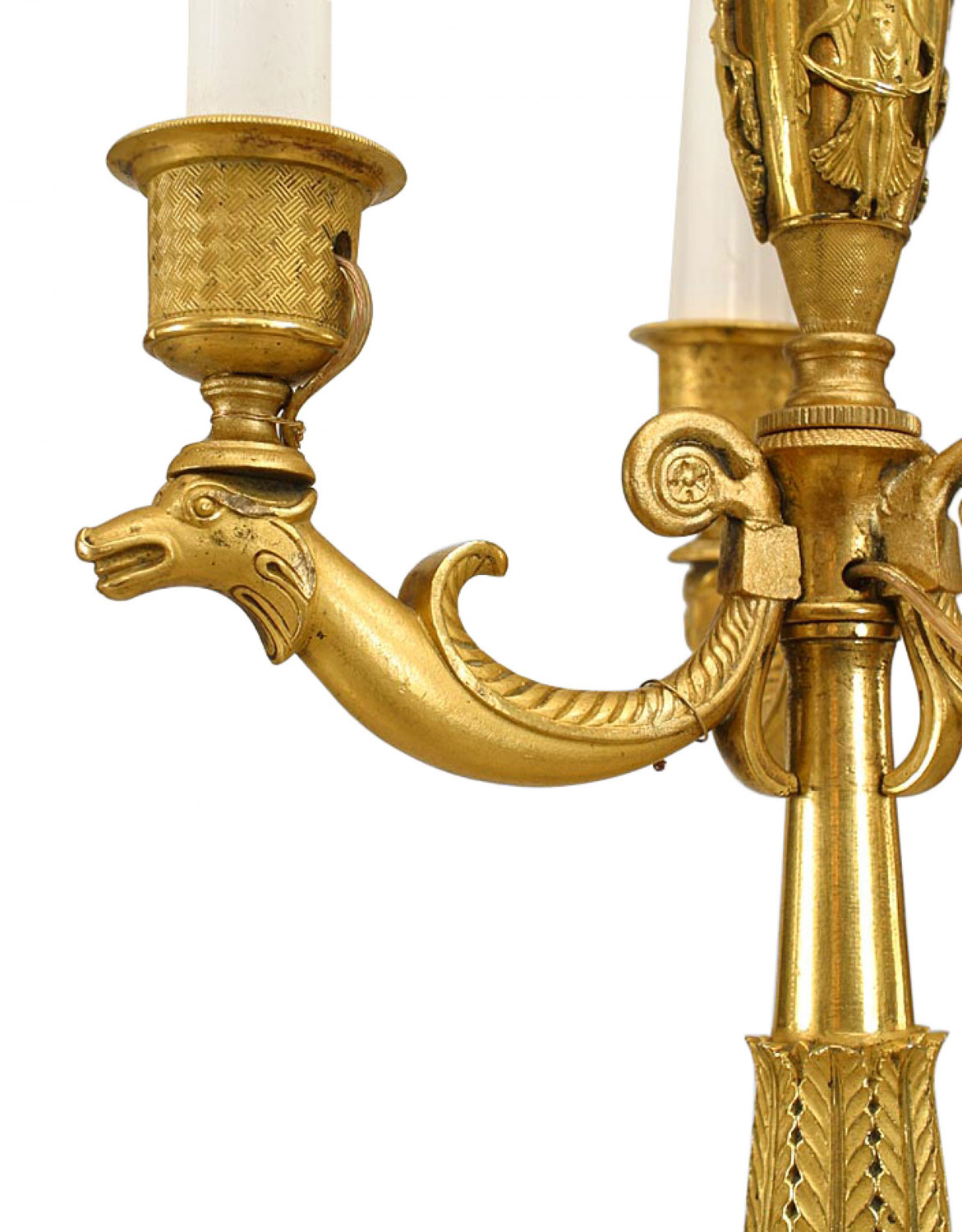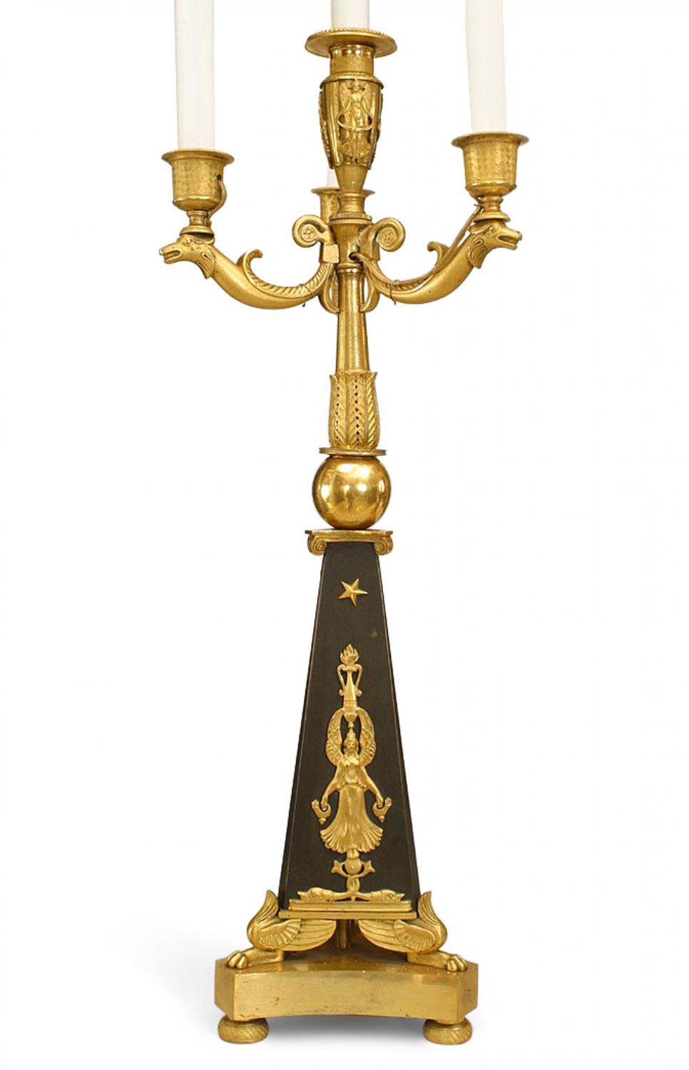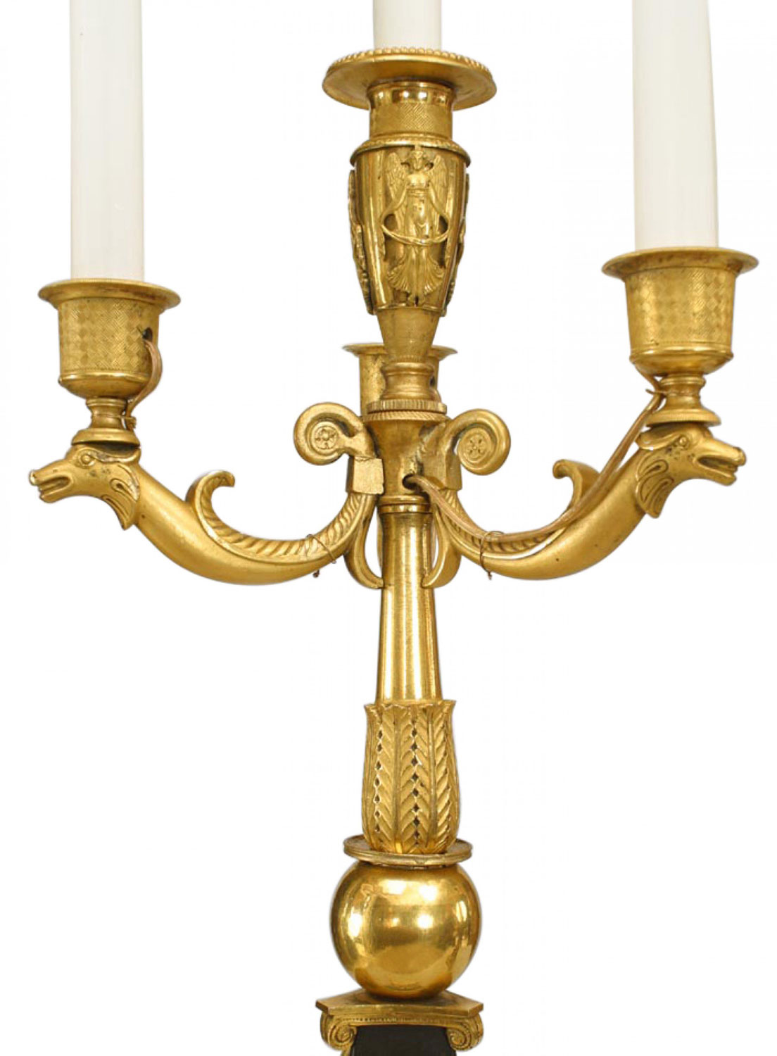 PAIR of French Empire-style (19th Century) black and gilt trimmed bronze 4 arm candelabra with 3 bird head arms and center urn top arm (PRICED AS PAIR)