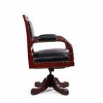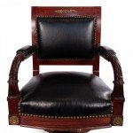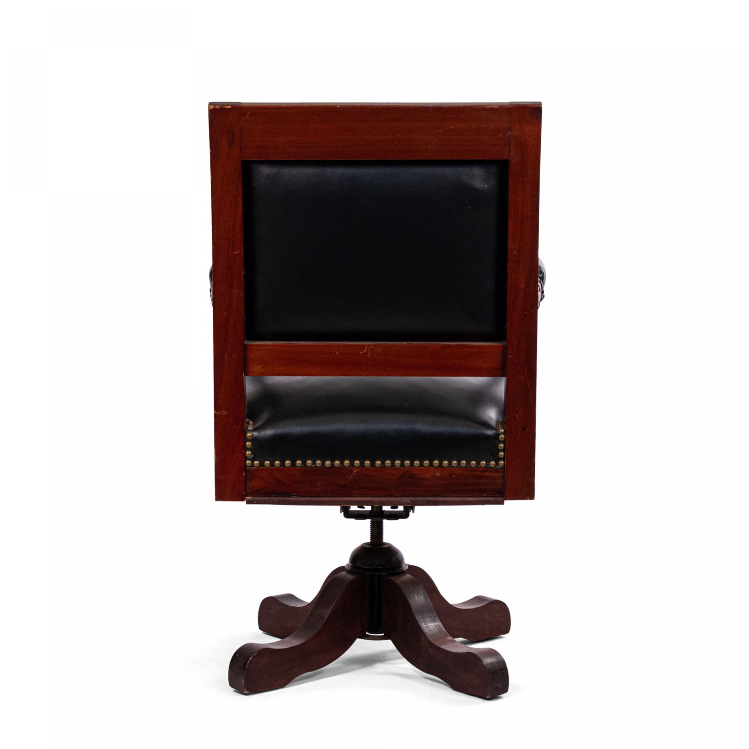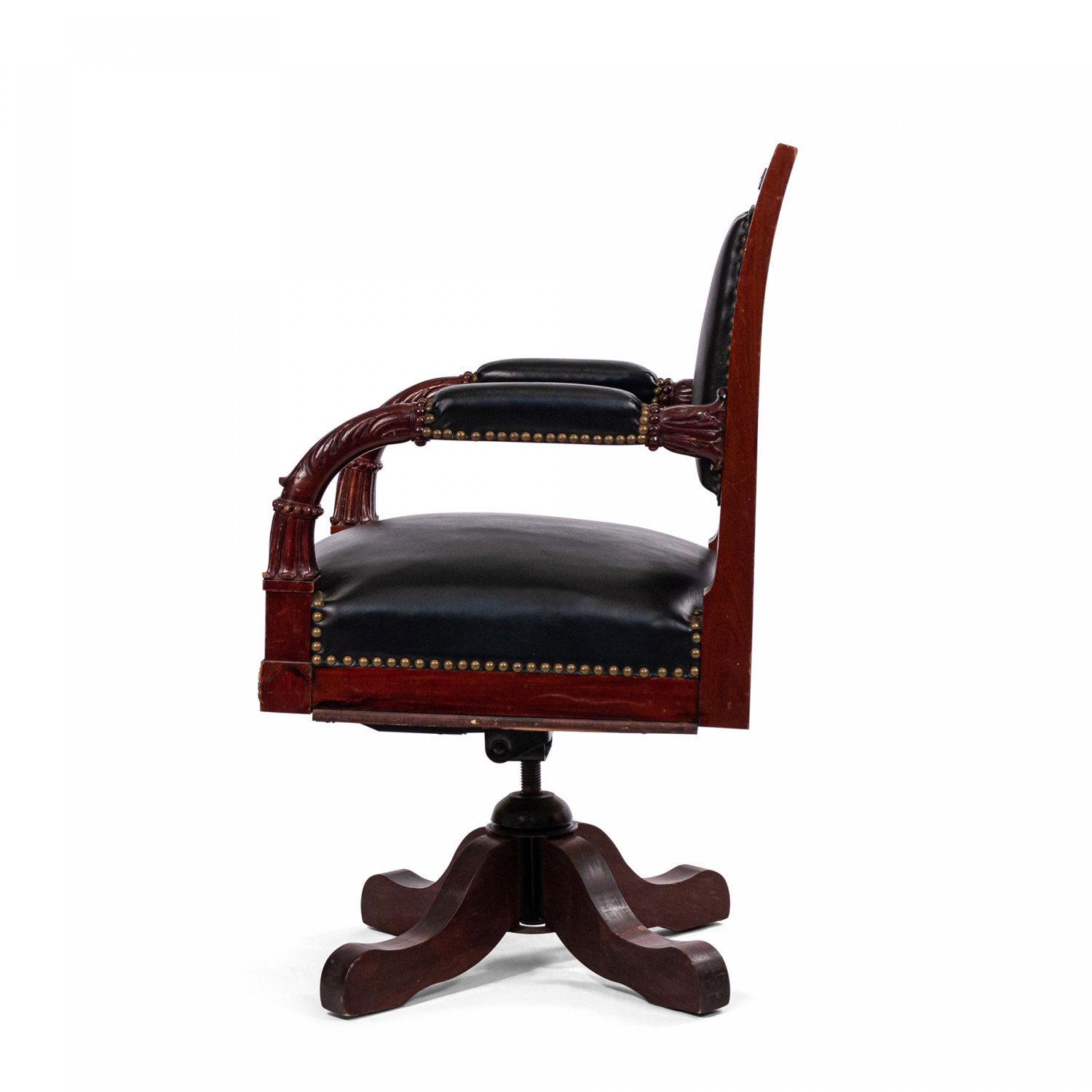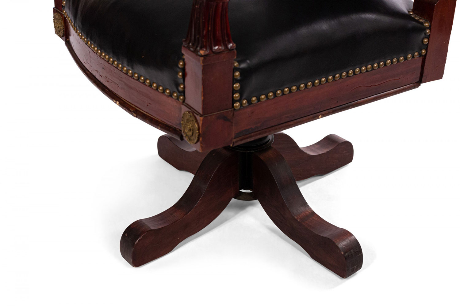 French Empire style (19th Century) ormolu mounted mahogany open swivel base arm chair with black leather seat and back.