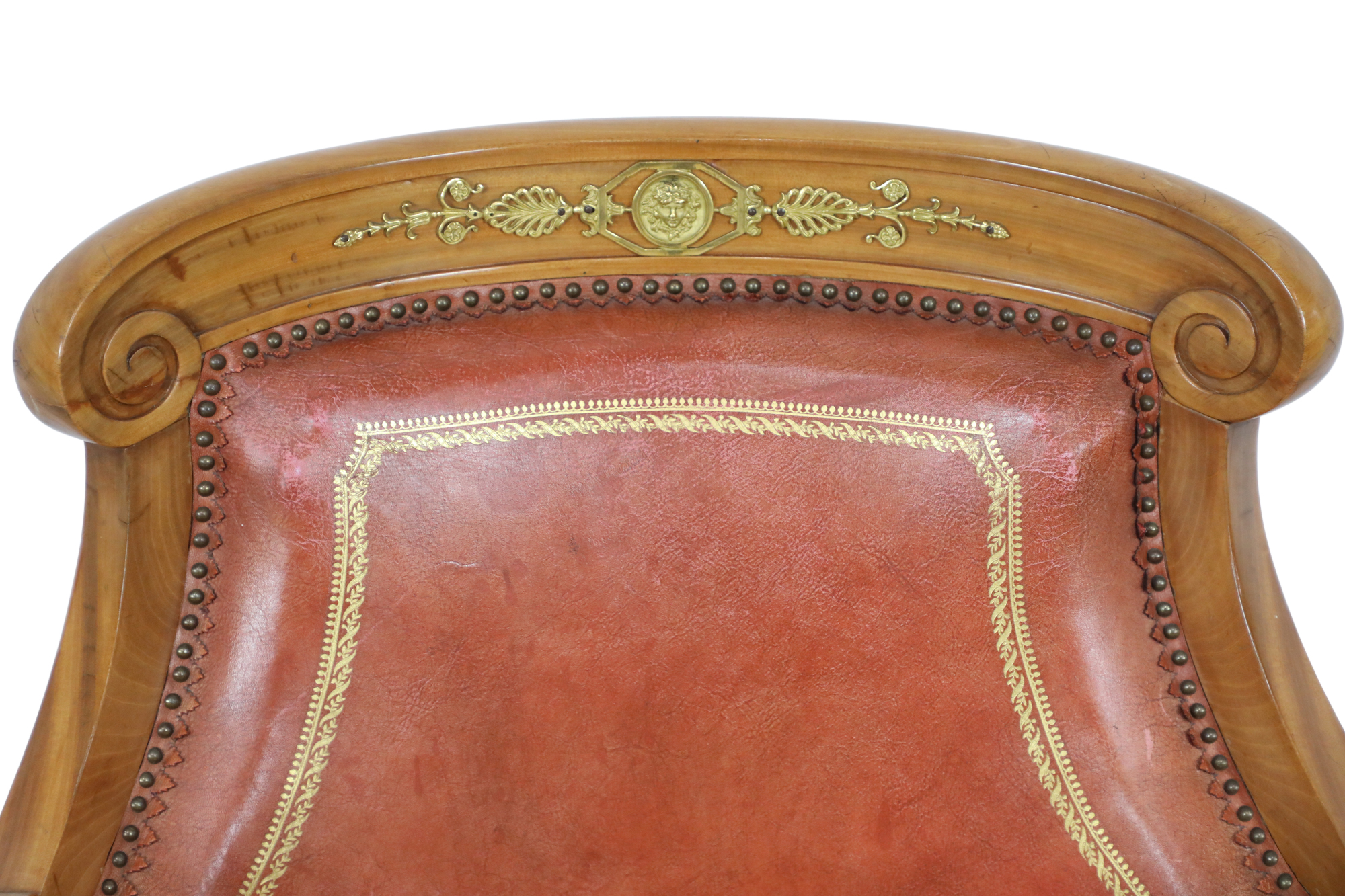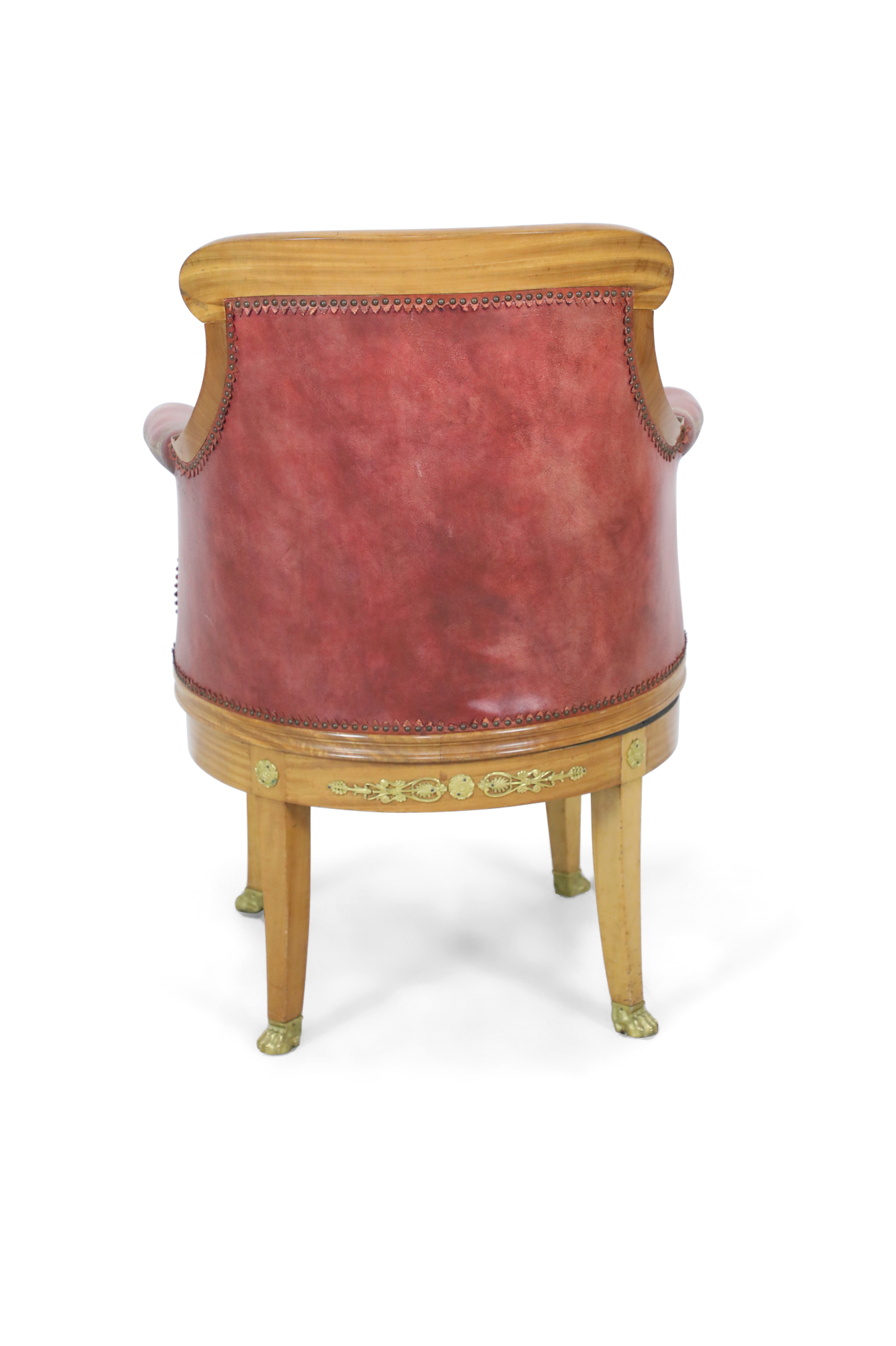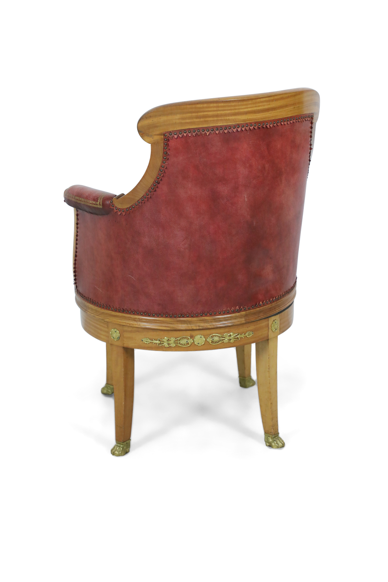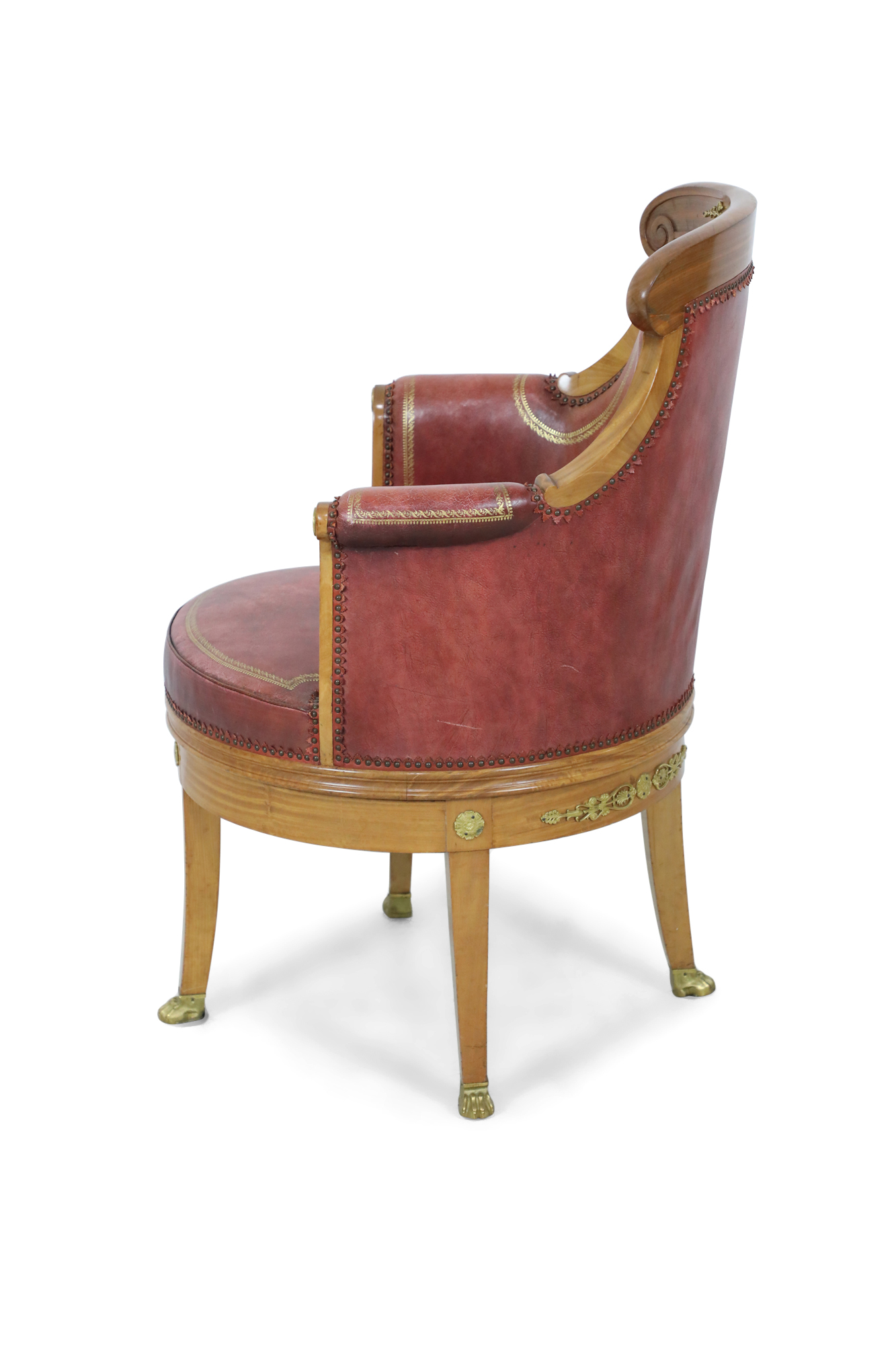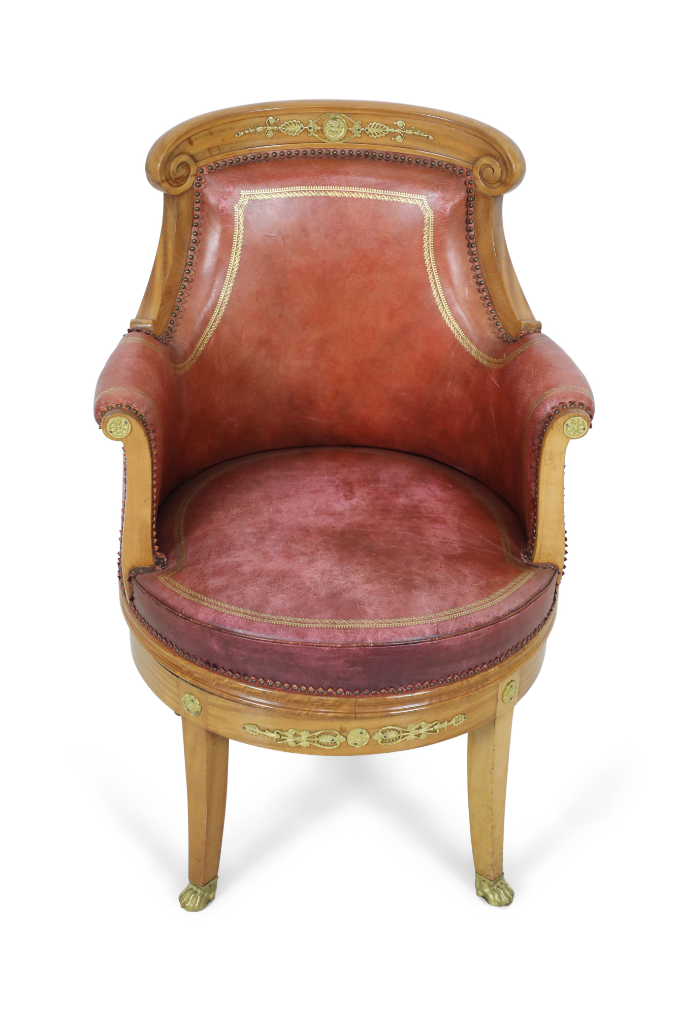 French Empire blond mahogany swivel armchair upholstered in gilt embossed red leather with brass nail head trim and having bronze embellishments and medallions throughout with hoof sabots.