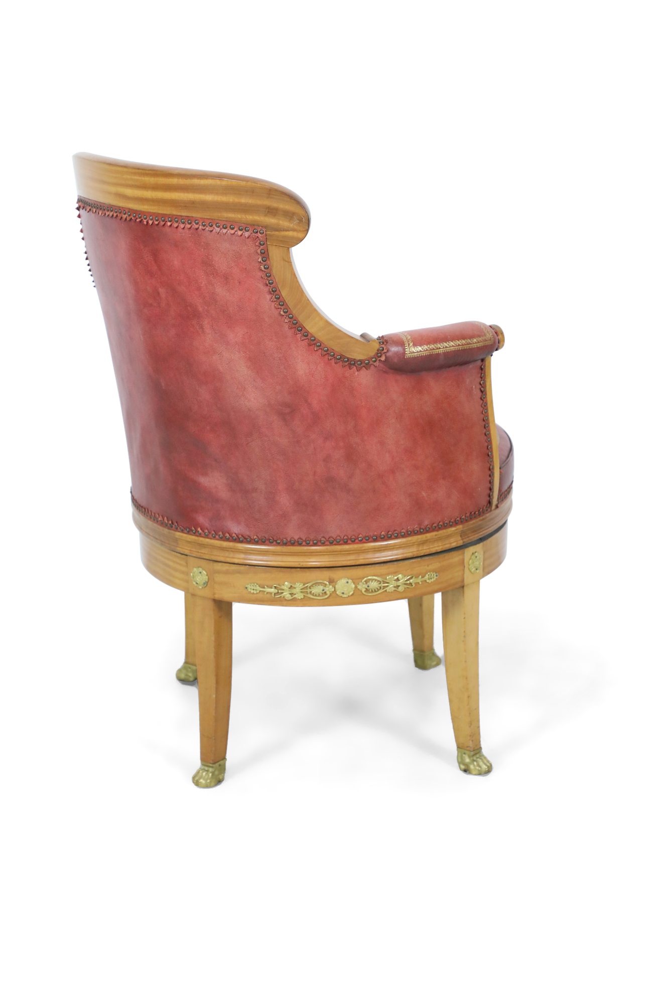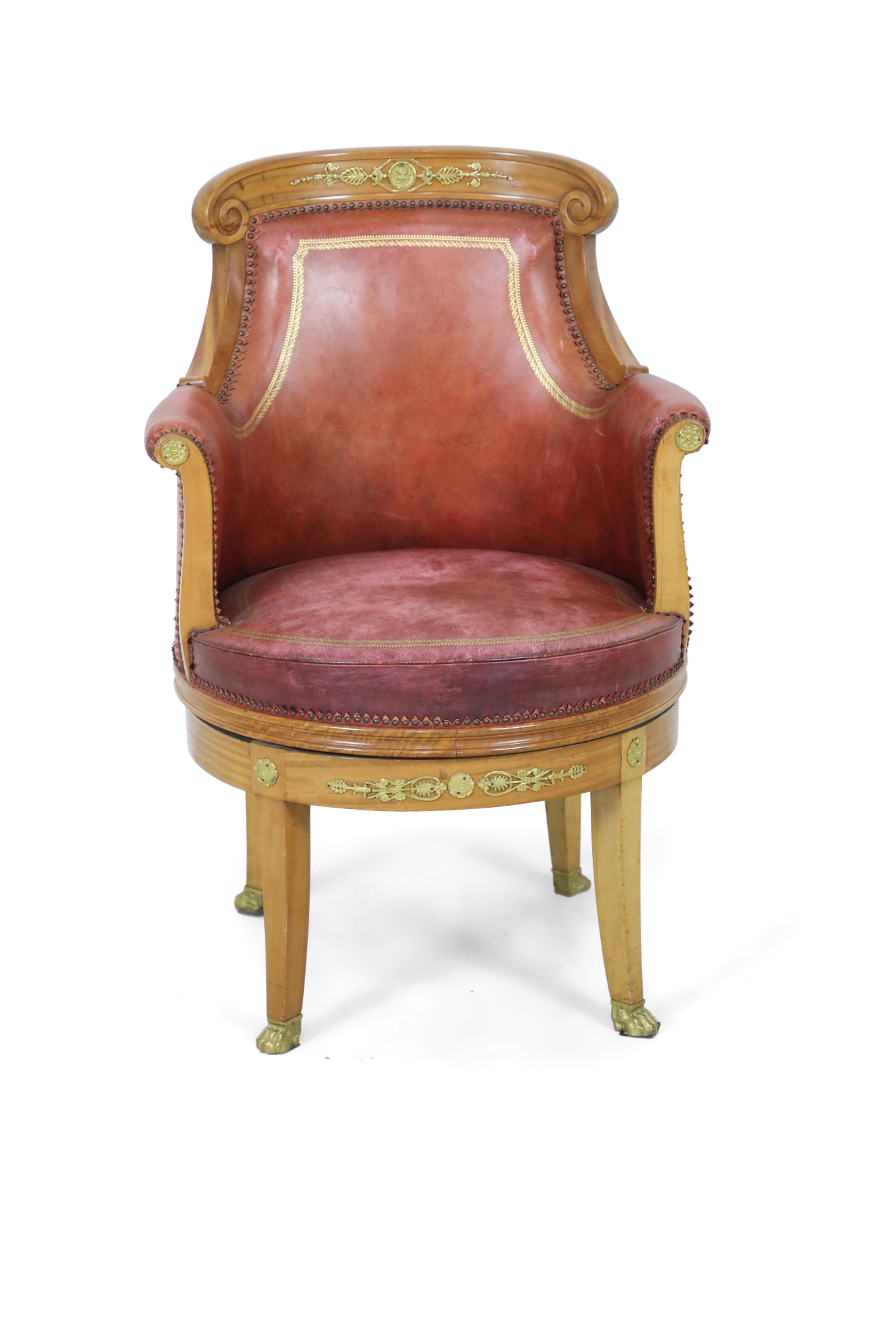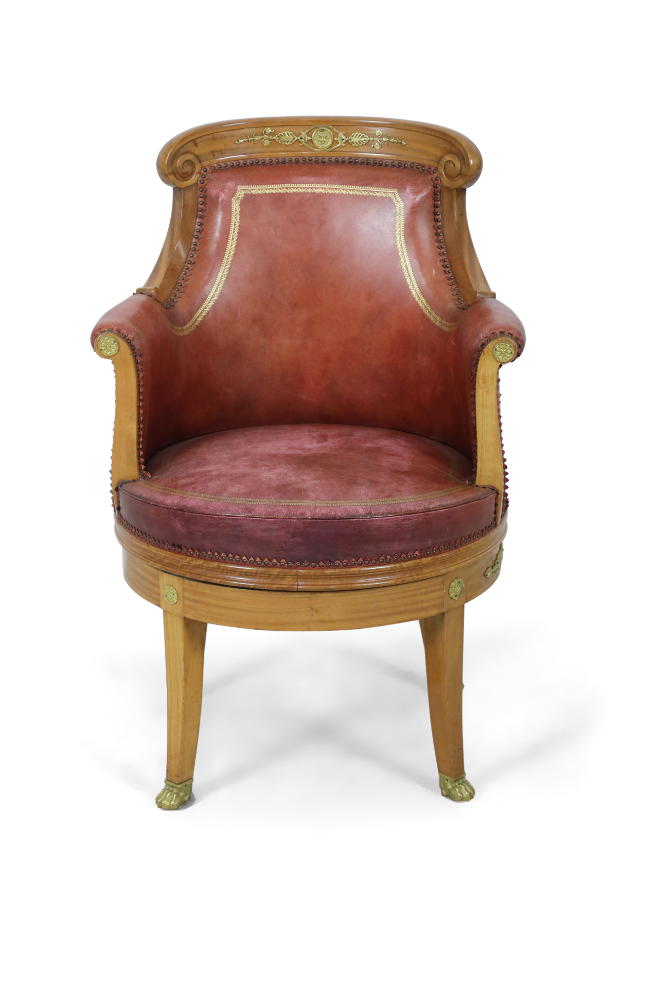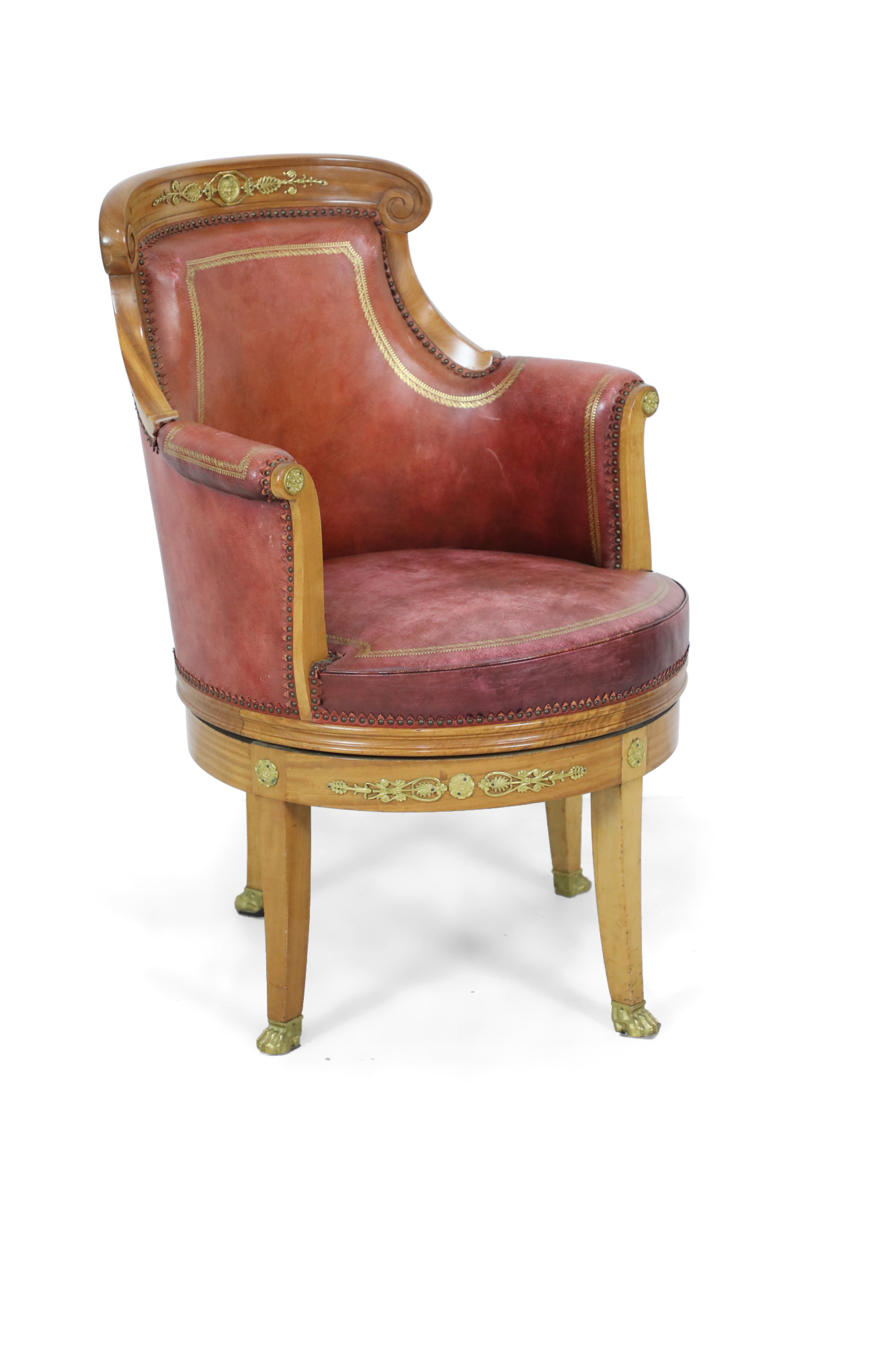 French Empire Blond Mahogany Swivel Leather Chair With Bronze Trim