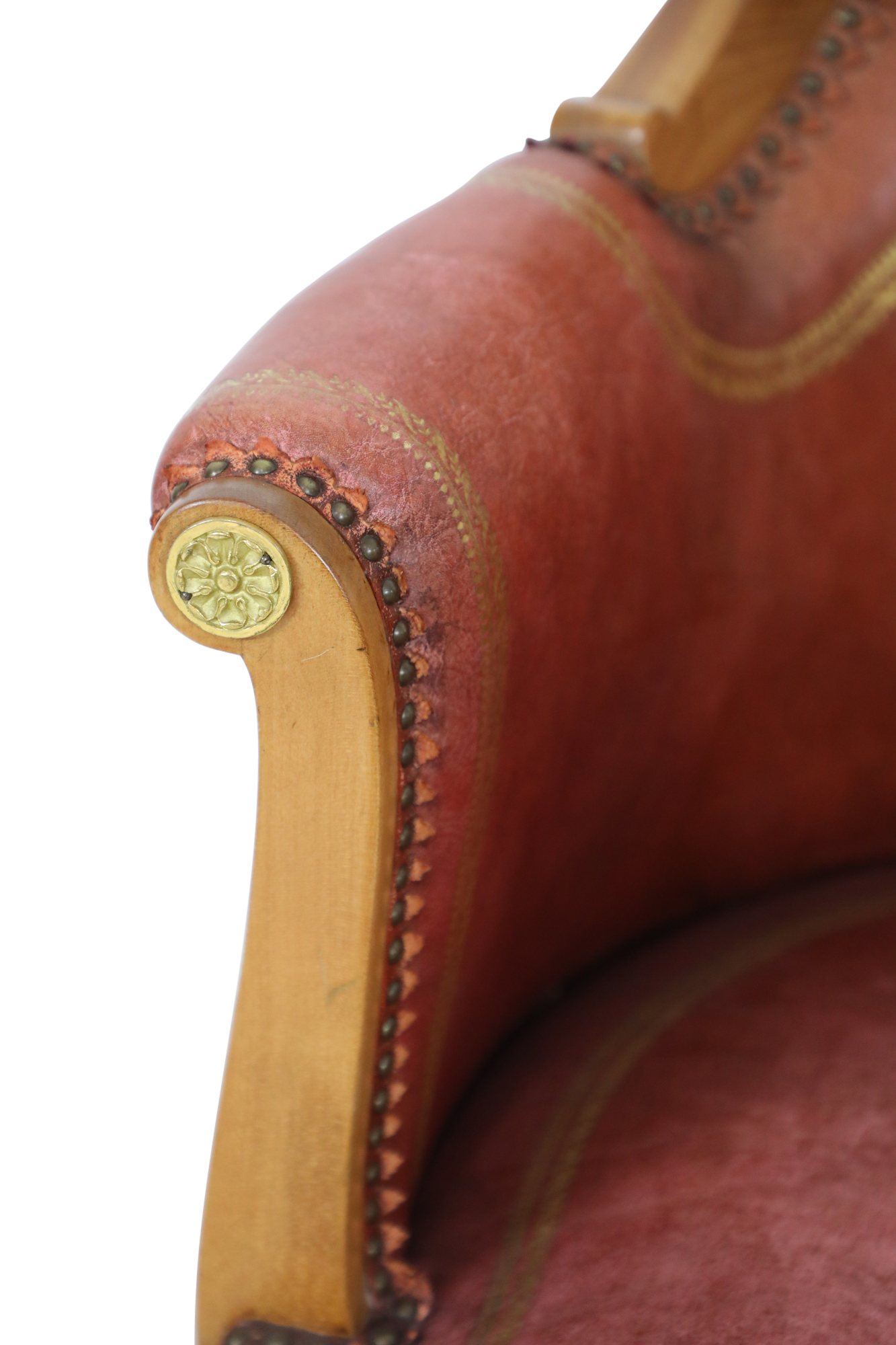 French Empire blond mahogany swivel armchair upholstered in gilt embossed red leather with brass nail head trim and having bronze embellishments and medallions throughout with hoof sabots..