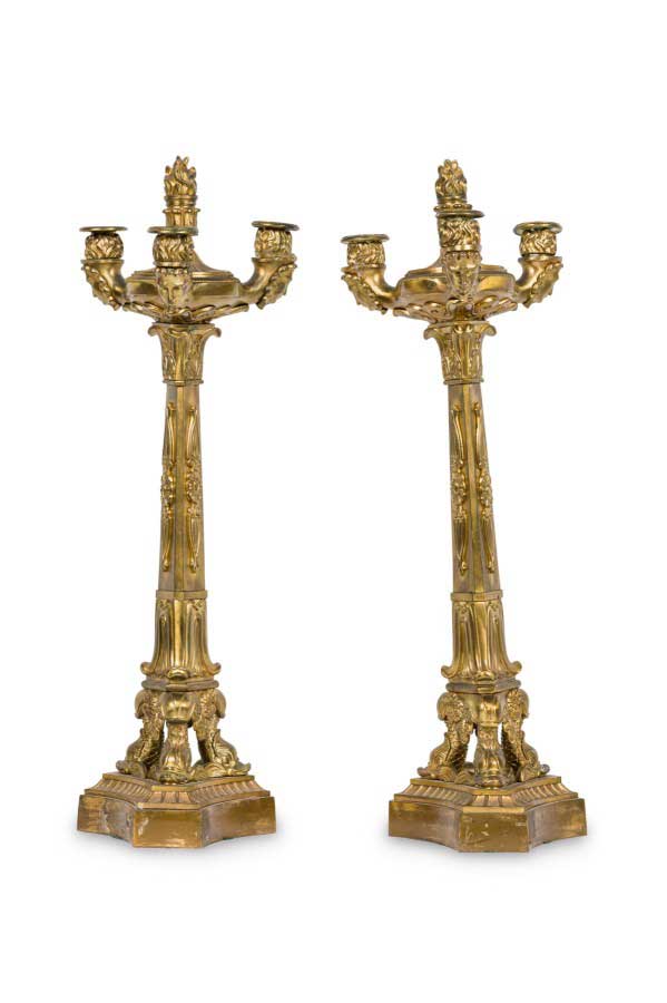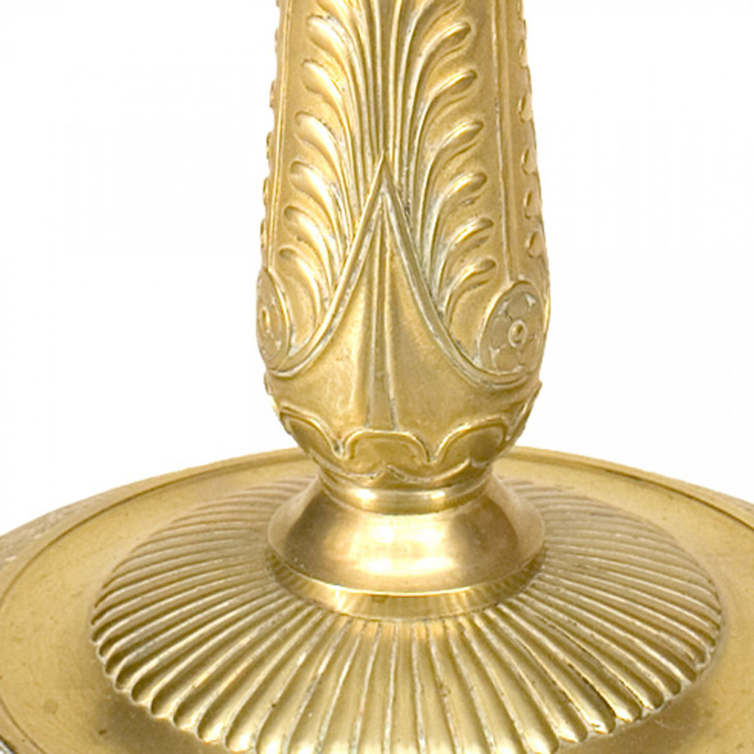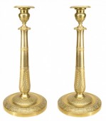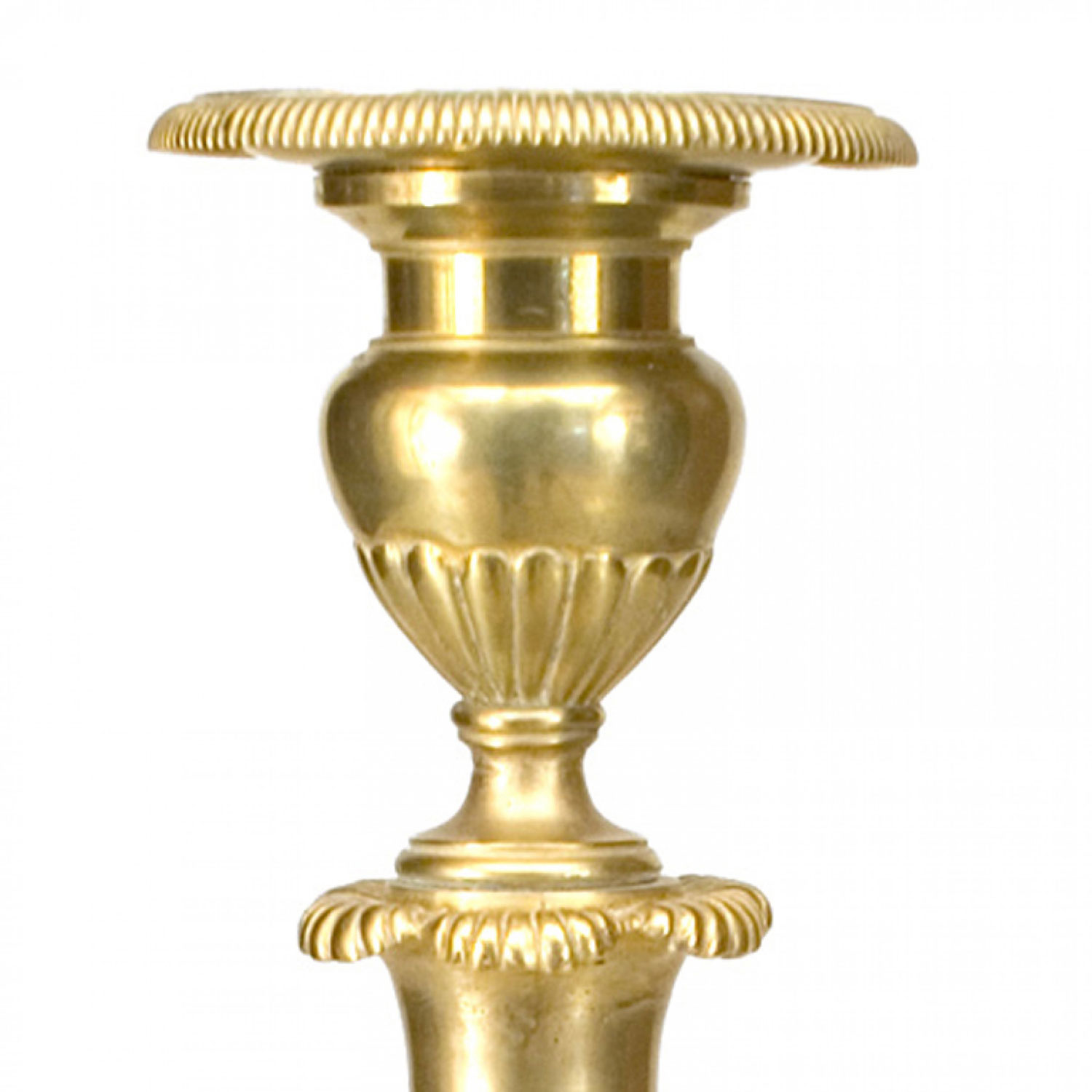 PAIR of French Empire-style (19/20th Century) bronze candlesticks with round base with fluted and decorative design supporting a tapered column (PRICED AS PAIR).