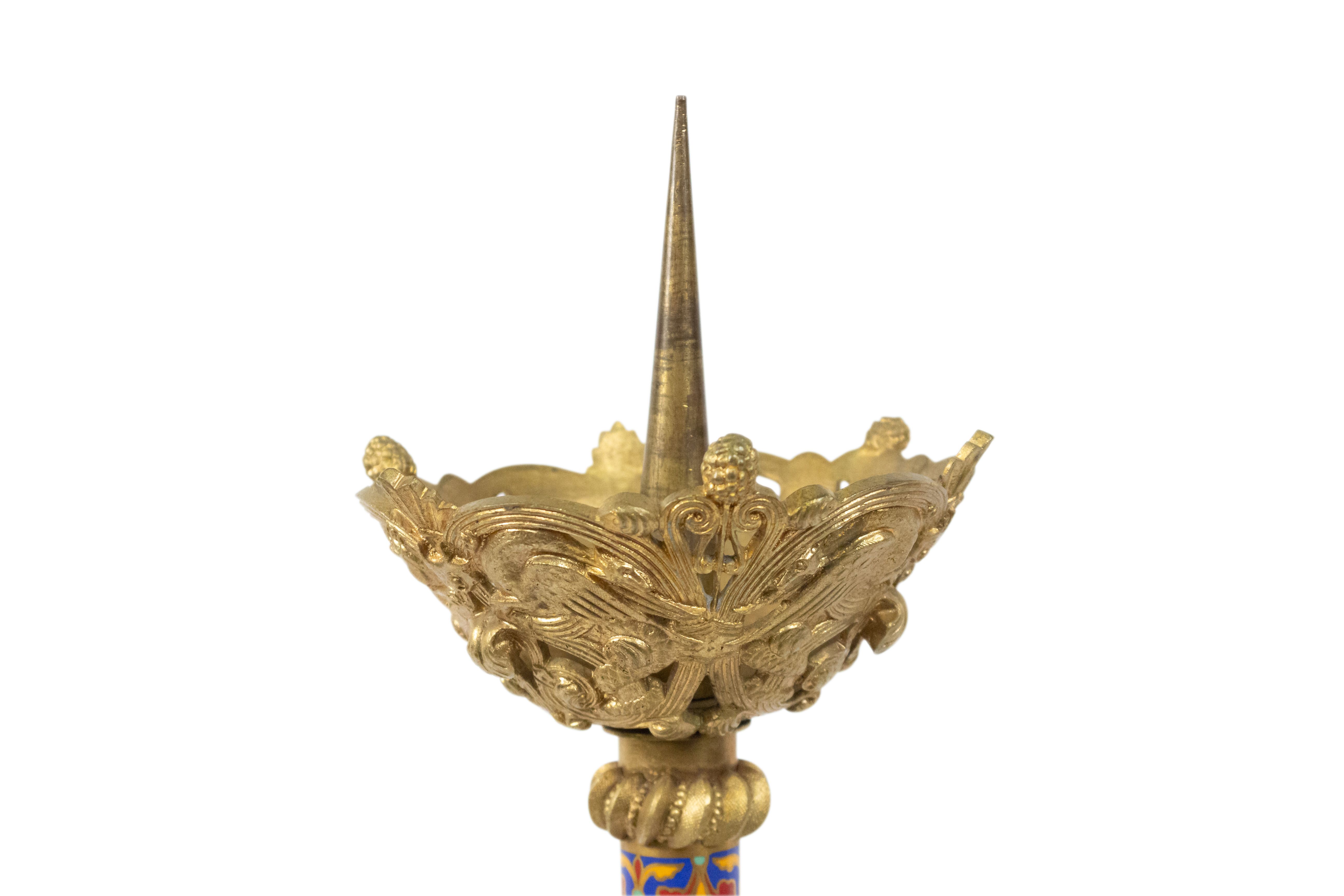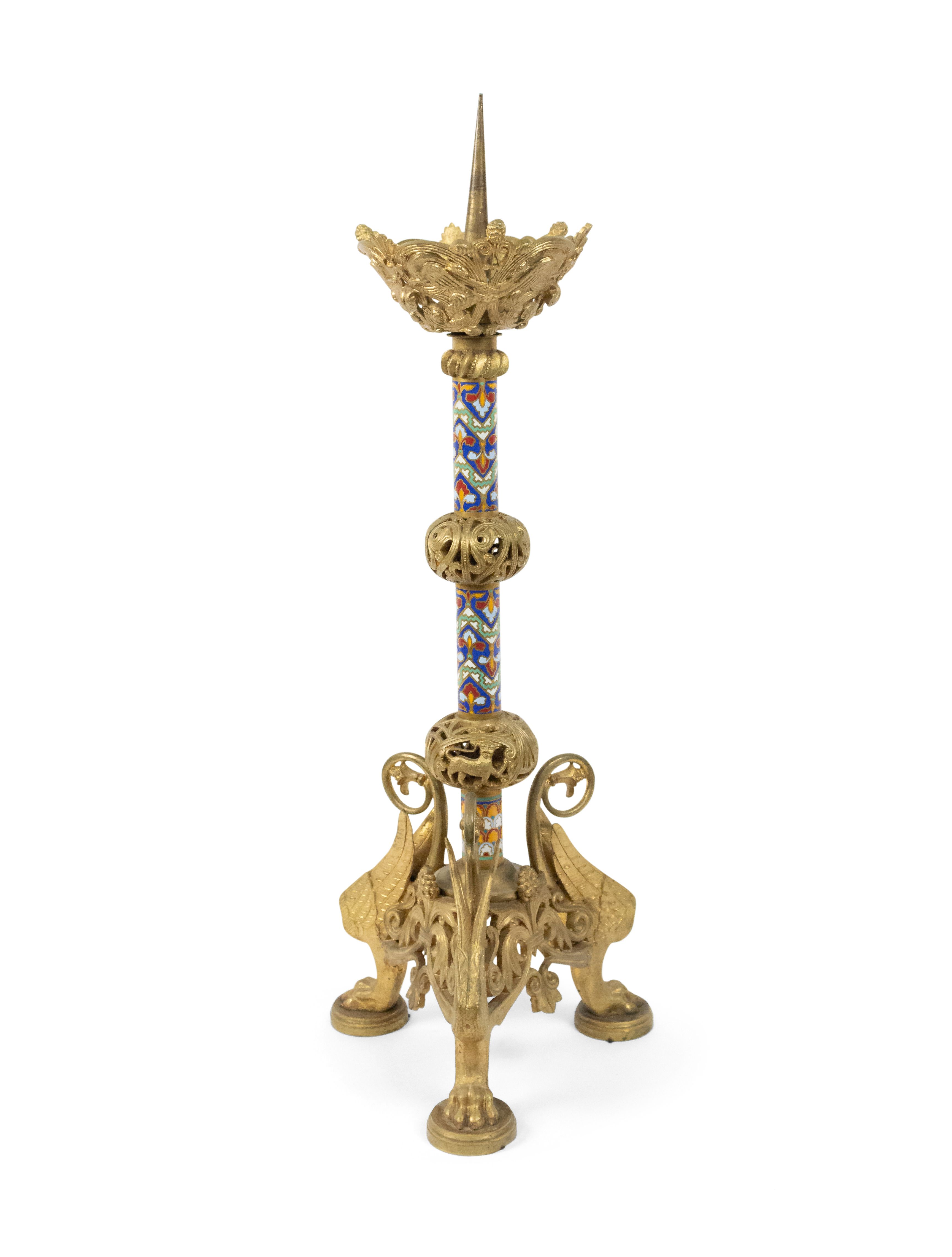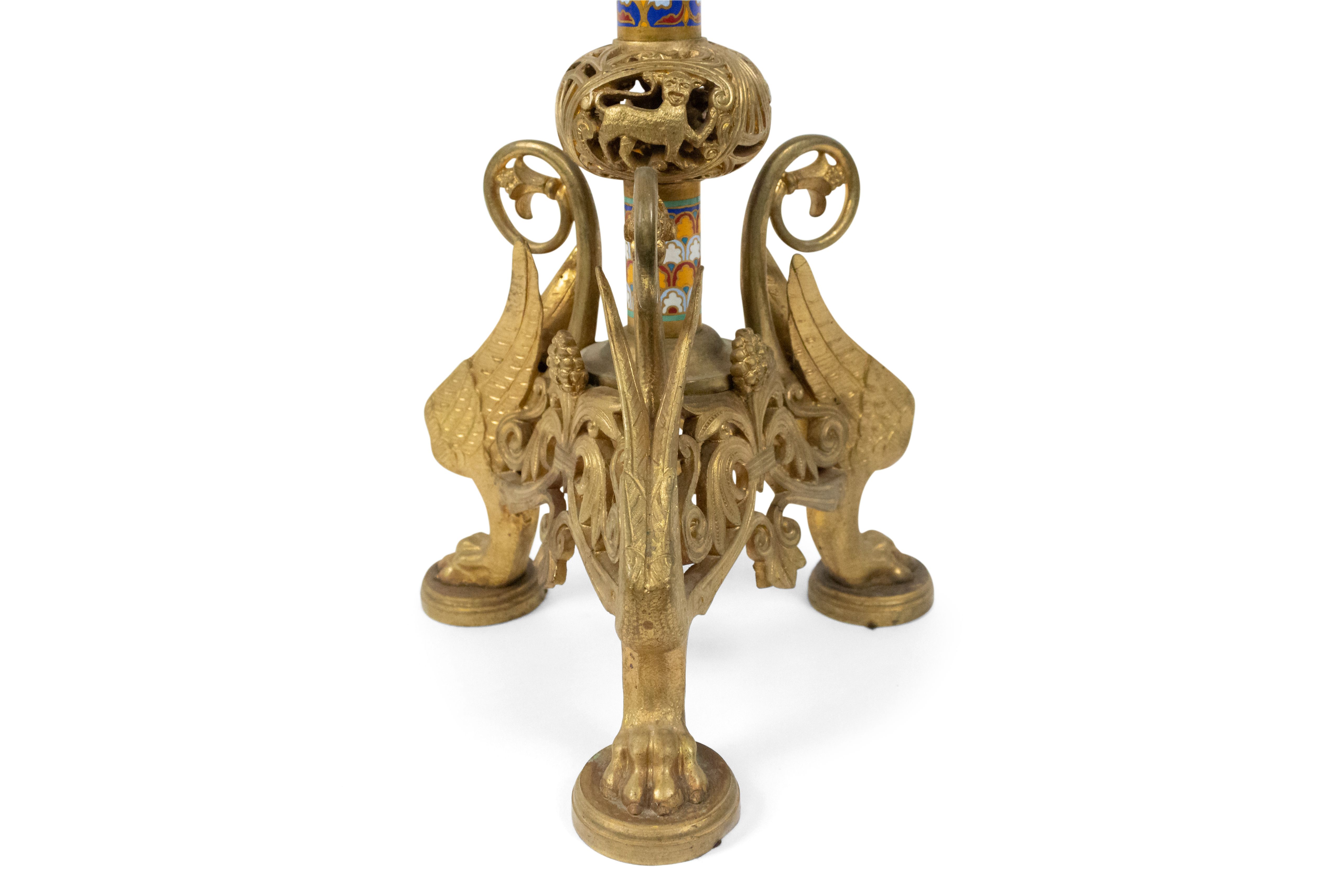 PAIR of French Empire-style (19th Century) bronze dore and enamel altar sticks with 3 clawed and winged legs (PRICED AS PAIR)