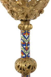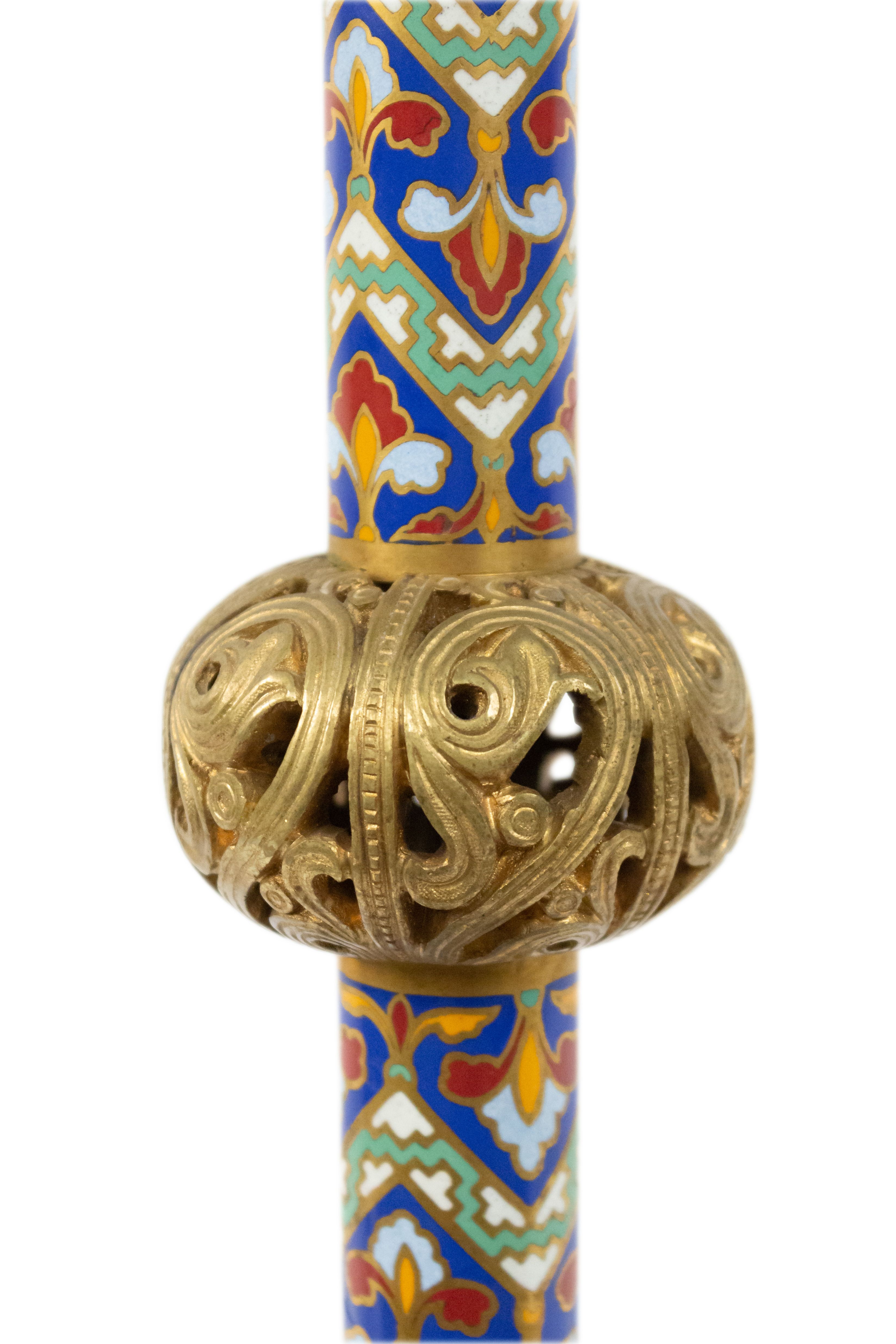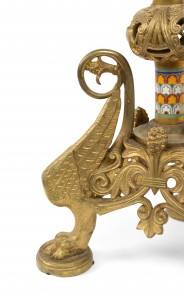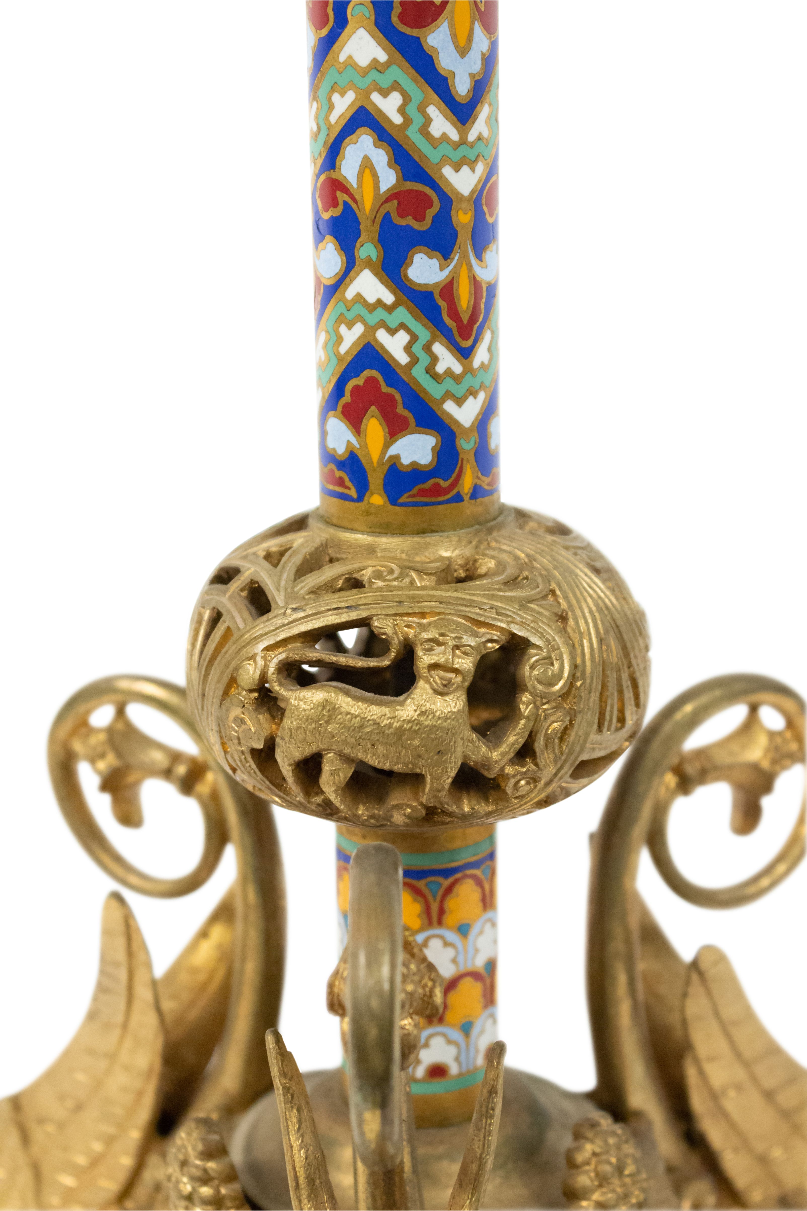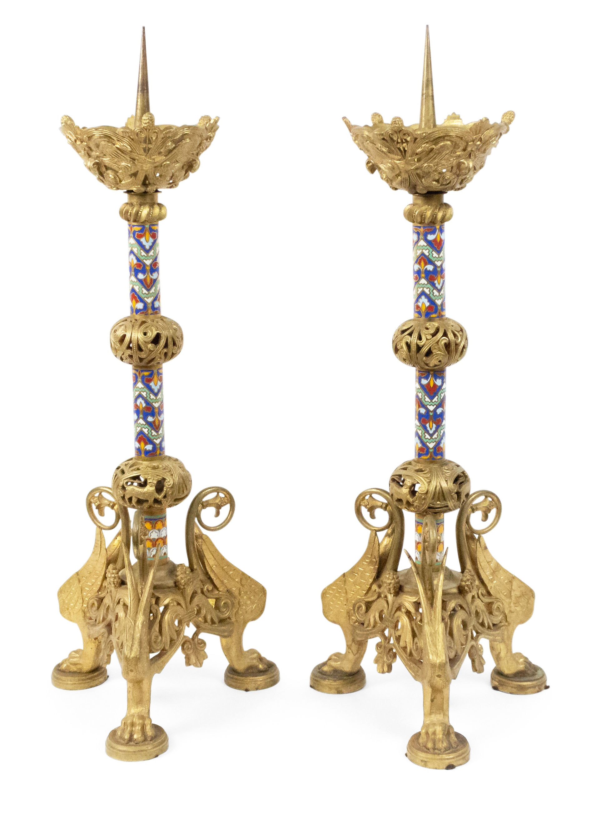 PAIR of French Empire-style (19th Century) bronze dore and enamel altar sticks with 3 clawed and winged legs (PRICED AS PAIR)