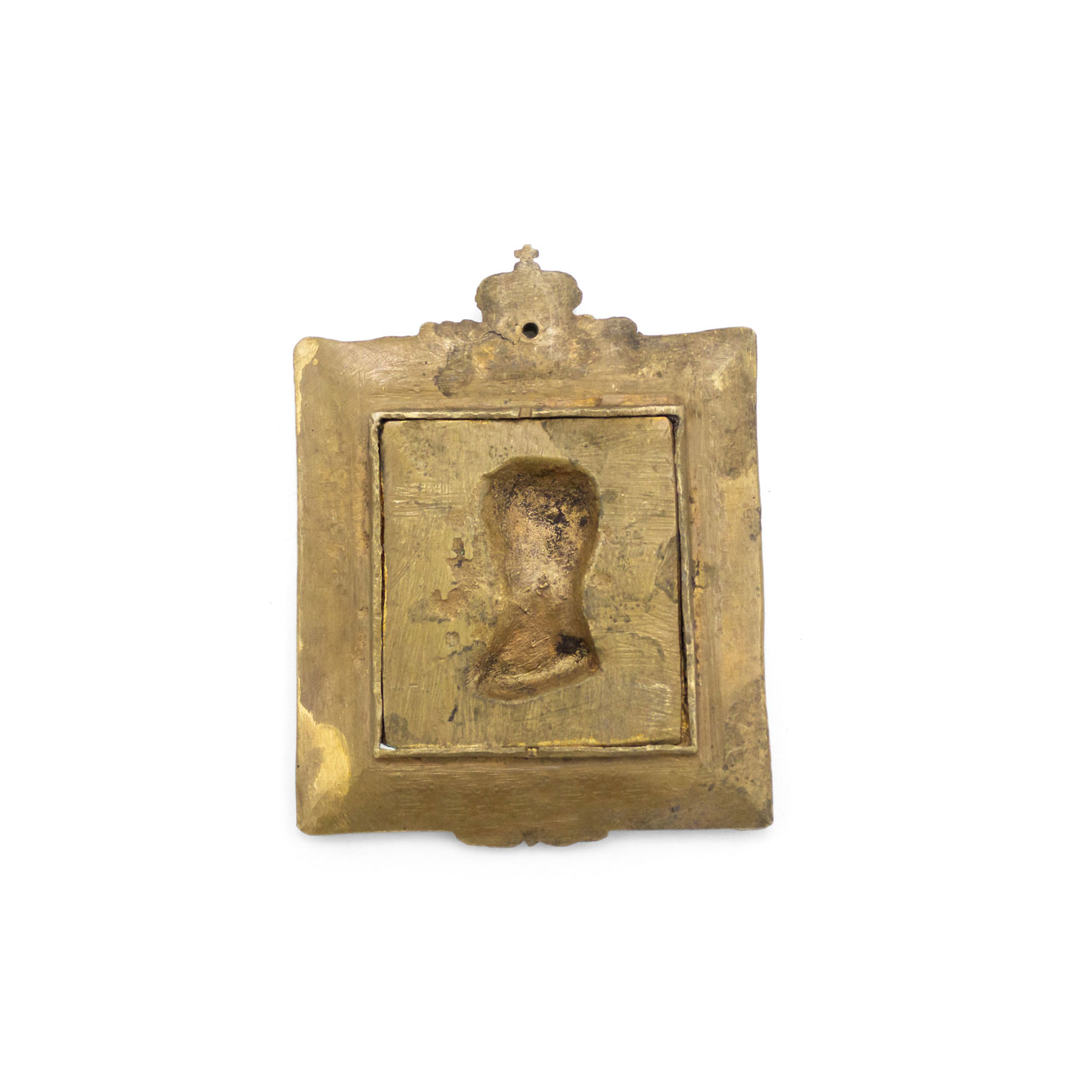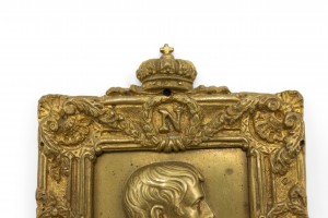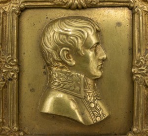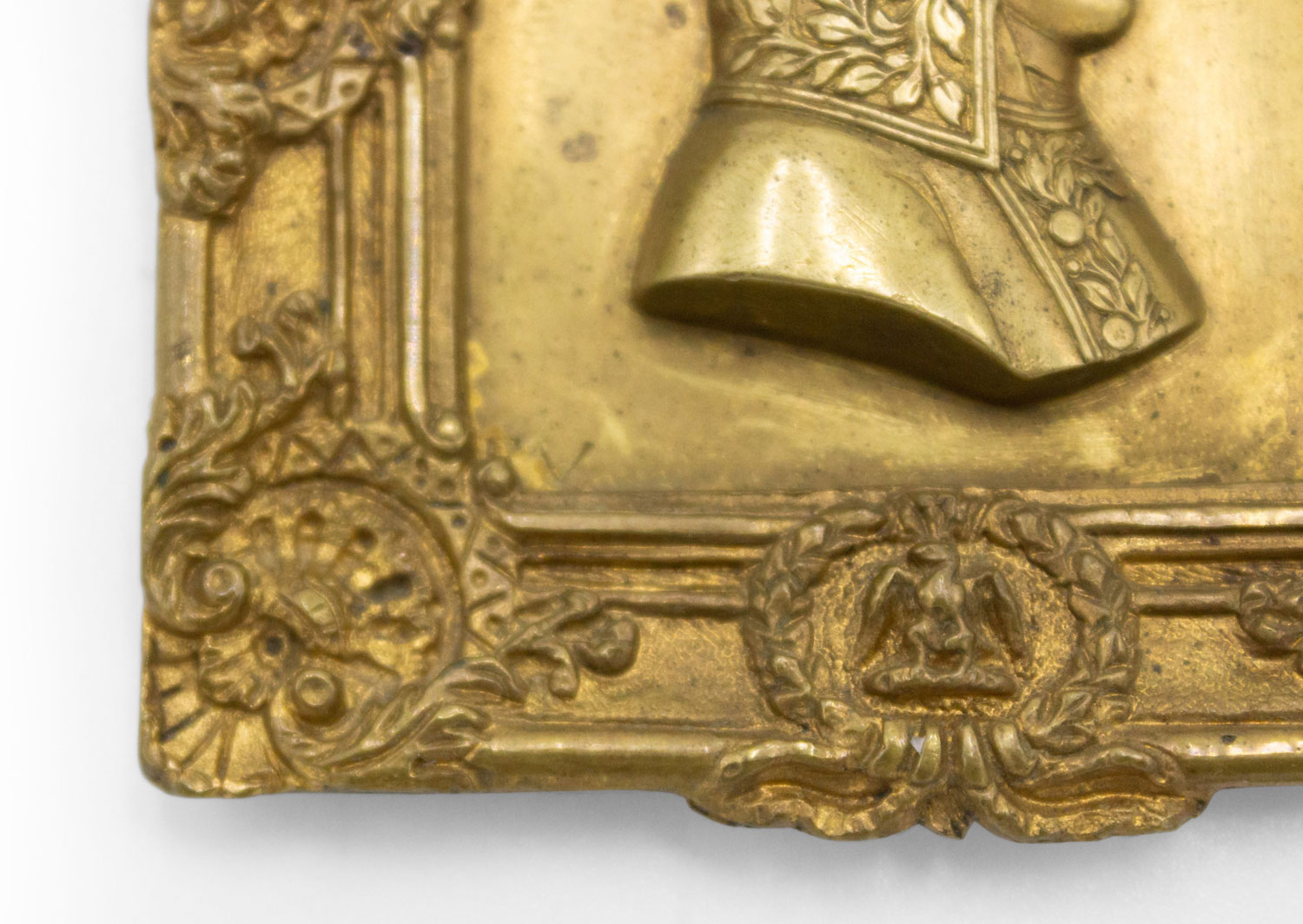 French Empire style (19/20th Cent) bronze miniature plaque of a bust of Napoleon in relief set inside a matching design frame resting on an easel stand.