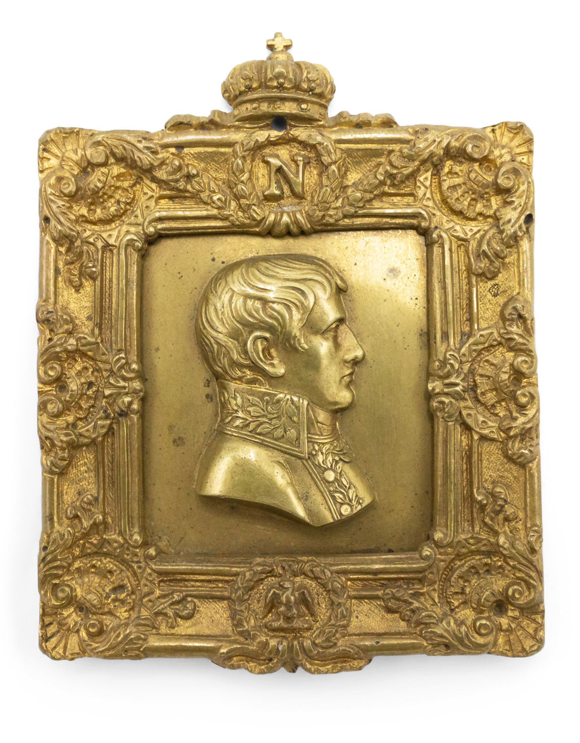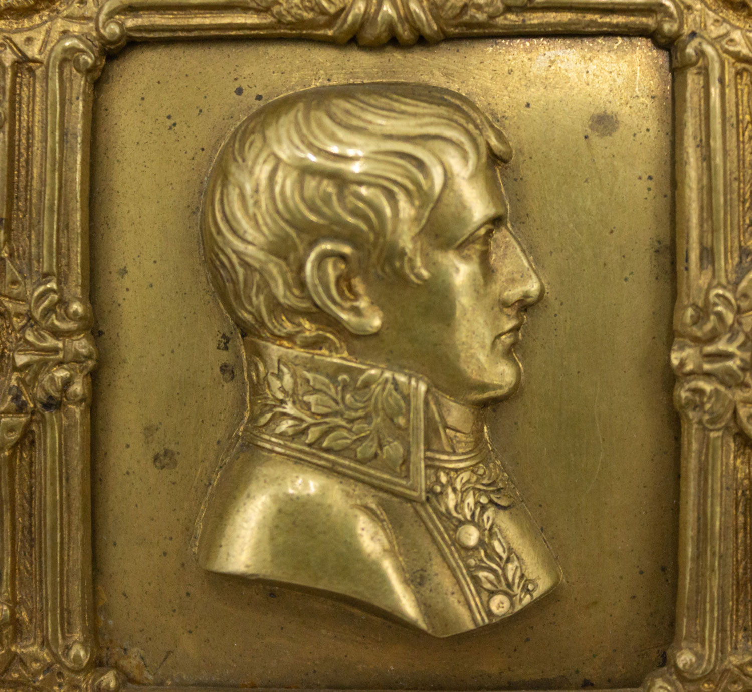 French Empire style (19/20th Cent) bronze miniature plaque of a bust of Napoleon in relief set inside a matching design frame resting on an easel stand