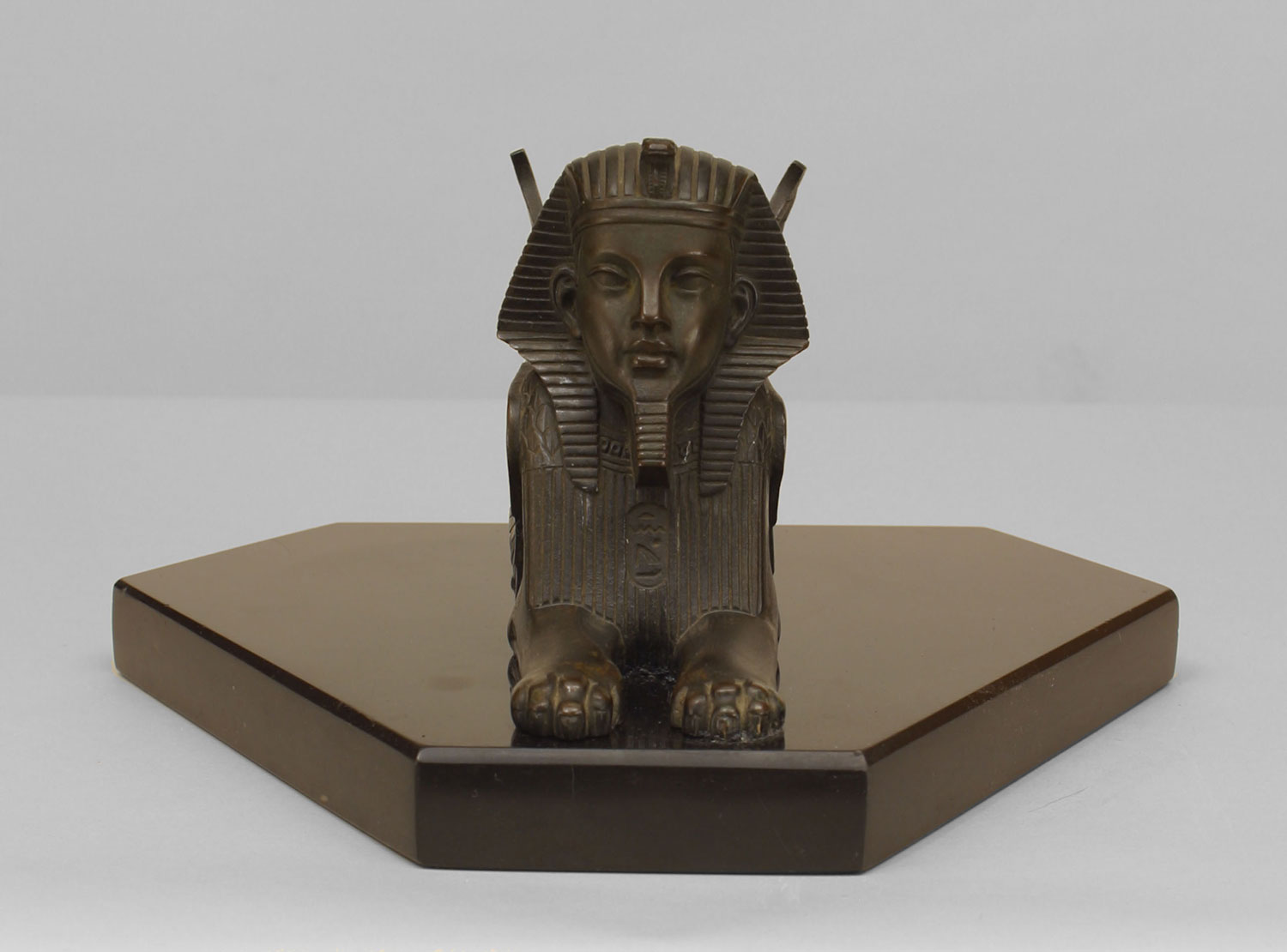 French Empire style (19th Cent) bronze reclining winged sphinx figure mounted on a tripartite black marble base.