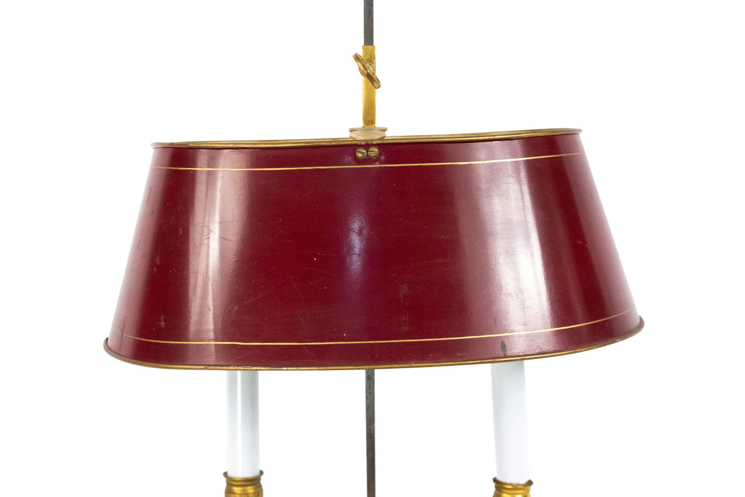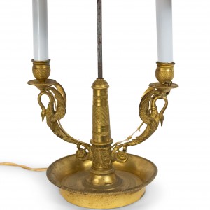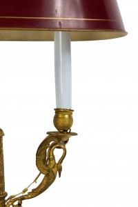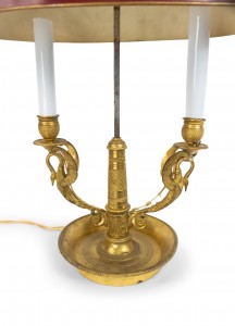 French Empire-style (20th Century) bronze dore 2 arm bouillotte table lamp with swan form arms beneath a red tole adjustable shade.