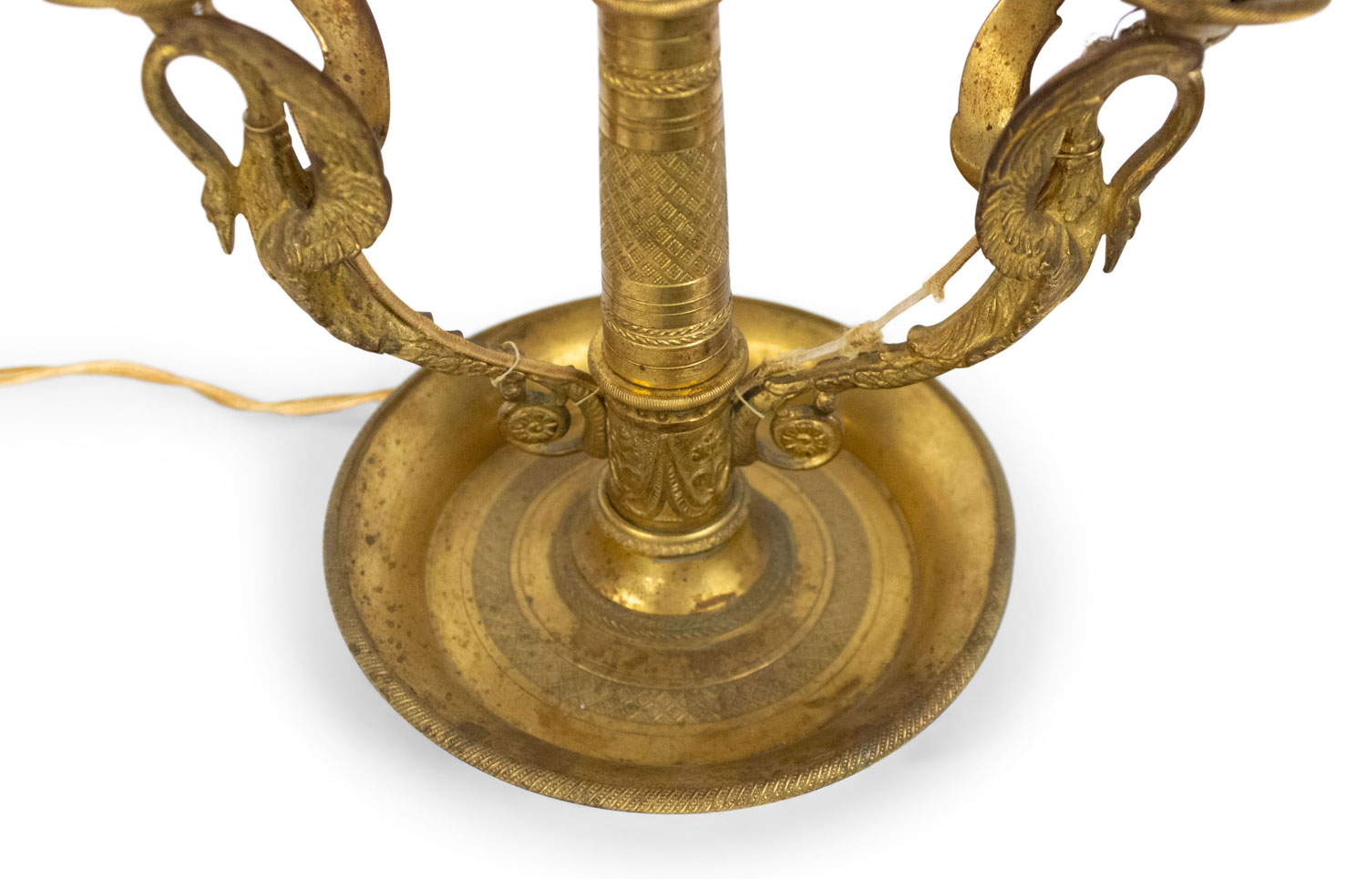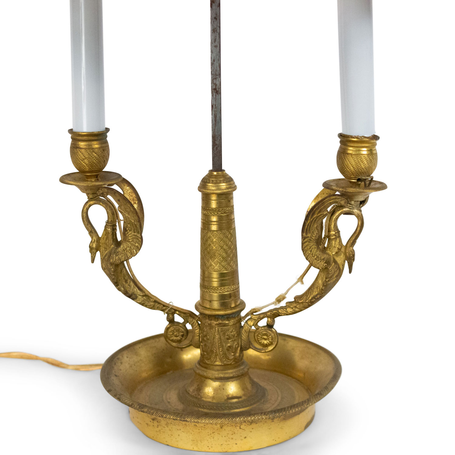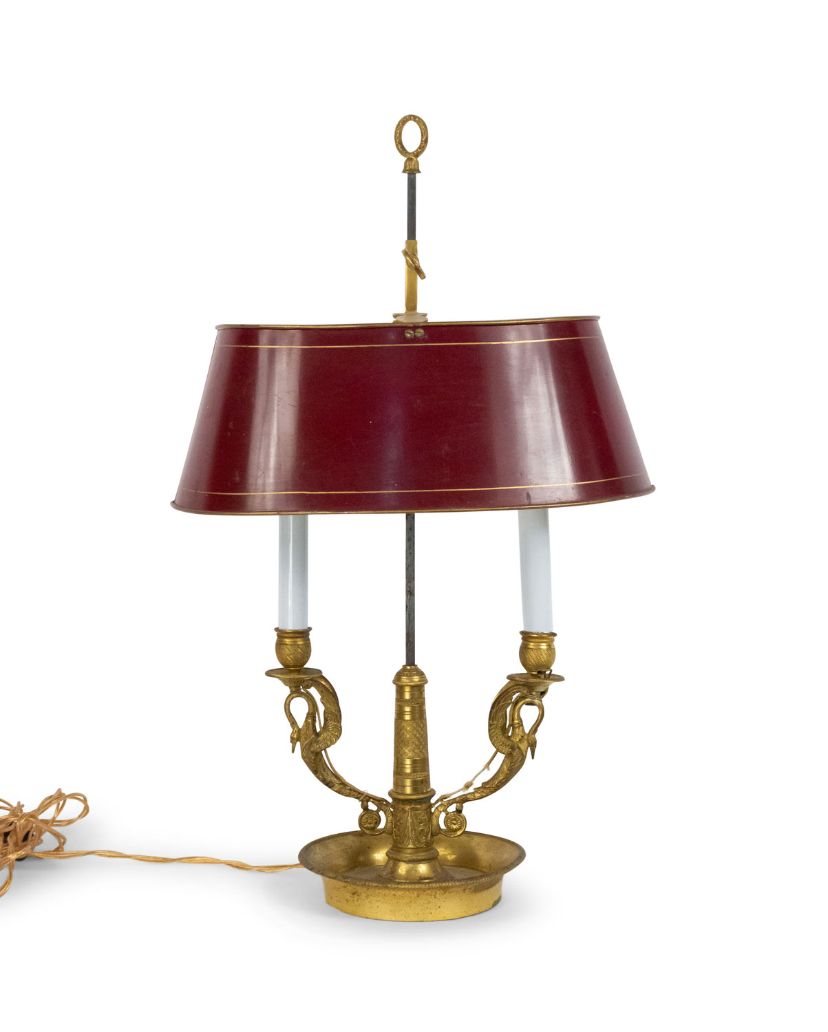 French Empire-style (20th Century) bronze dore 2 arm bouillotte table lamp with swan form arms beneath a red tole adjustable shade..